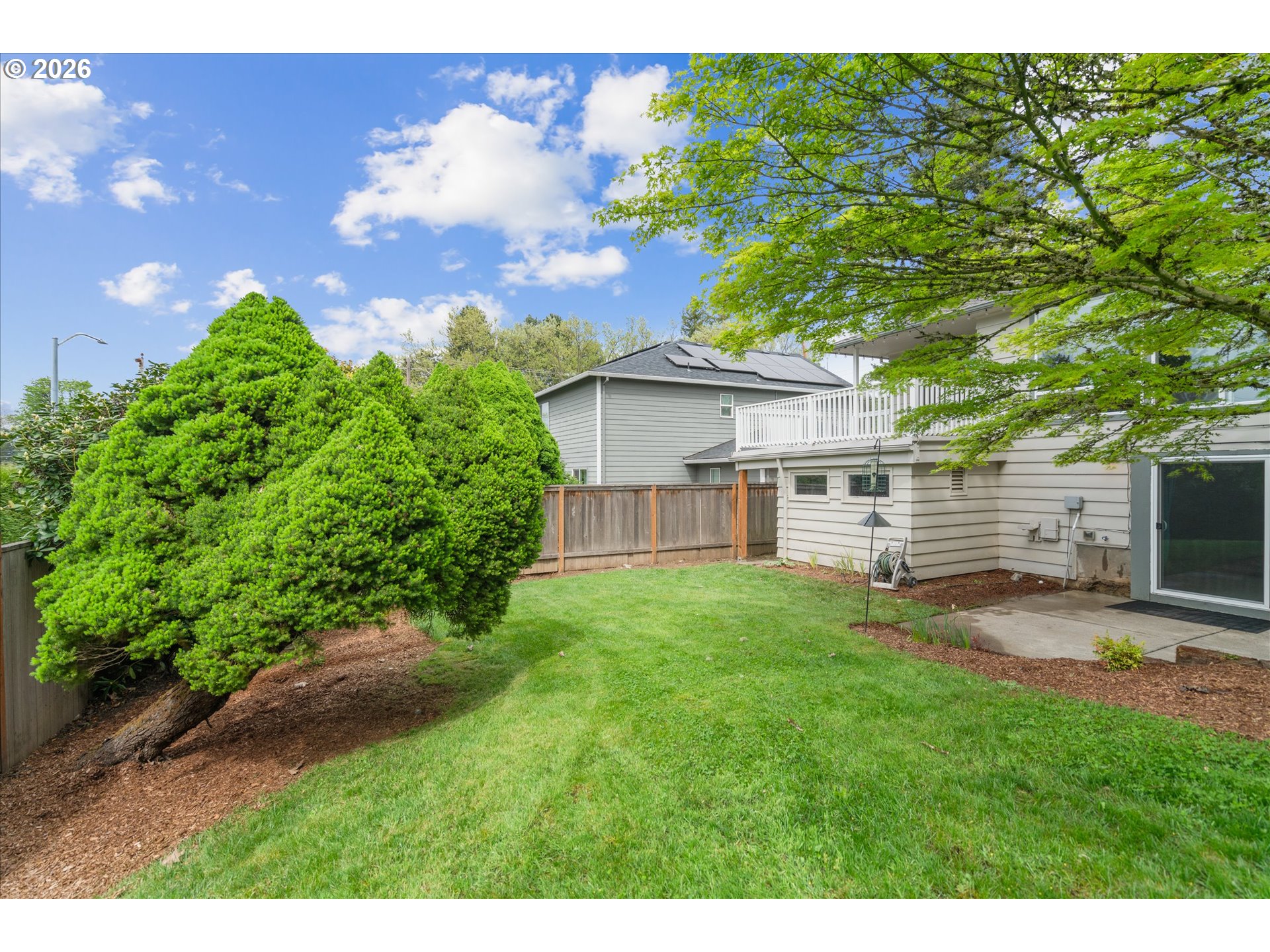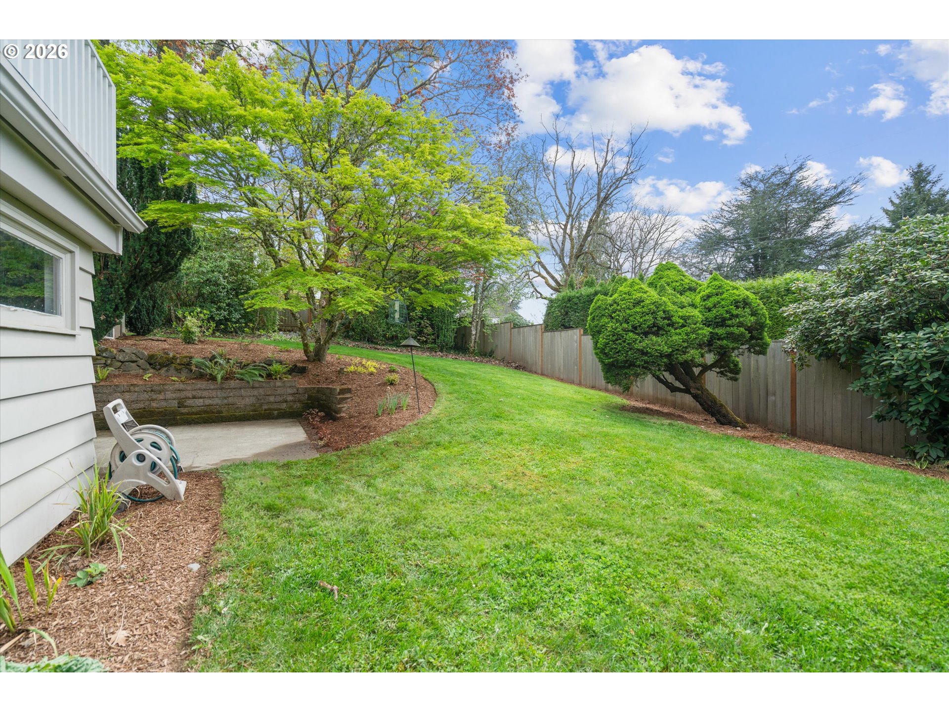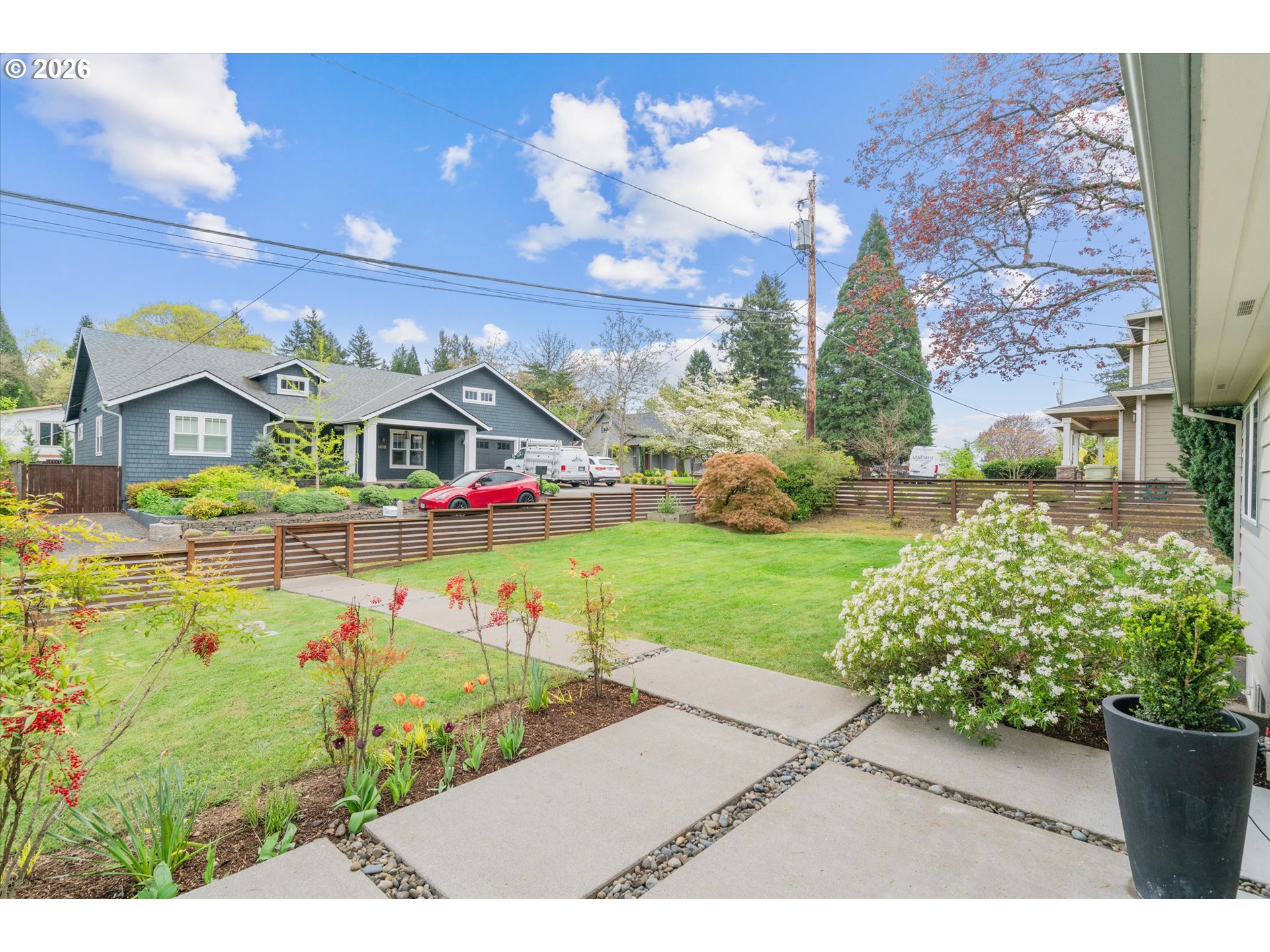 Tucked into the SW Hills with a coveted western exposure, this updated midcentury home offers a rare combination of character, comfort, and convenience. Set on a private terraced lot directly across from Catlin Gabel and steps from Cornell Farms, the location is as functional as it is desirable, with effortless access to I-5, Highway 217, and Highway 26. Inside, hardwood floors, a wood-burning fireplace framed by built-ins, and walls of west-facing windows create a warmth that feels genuinely lived-in. The modern kitchen flows into a sunny breakfast nook and opens to a great room that is bright, connected, and oriented toward the view. A spacious deck off the main living area extends everything outdoors, overlooking a fully fenced backyard with beautifully maintained landscaping. Two bedrooms and an updated full bath complete the main level. Downstairs, a flexible third bedroom or home office, a second full bath, and a family room with a second fireplace and direct backyard access offer room to breathe and spread out. A one-car garage with generous mudroom storage rounds out this exceptionally well-appointed home. Welcome home
