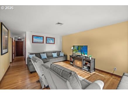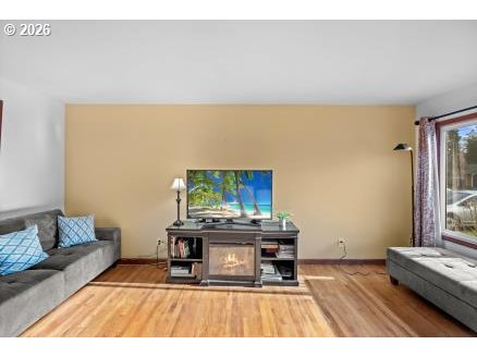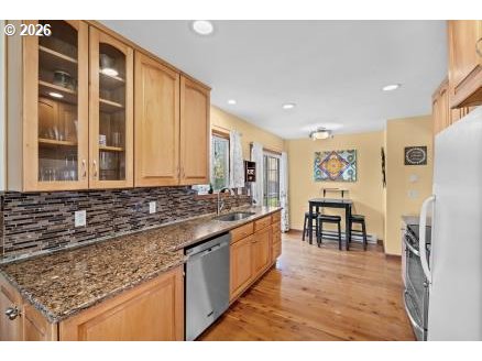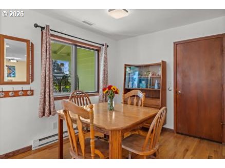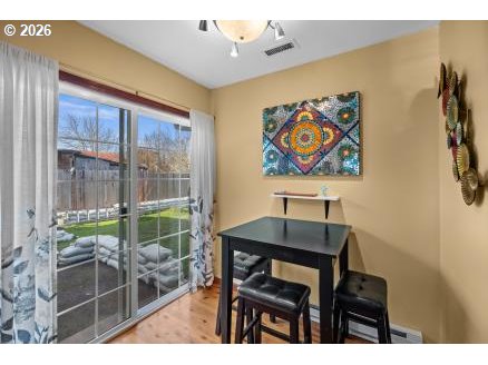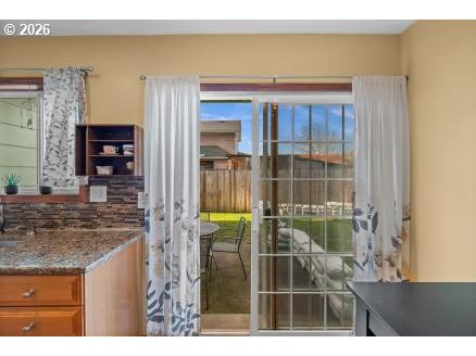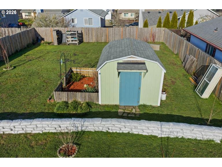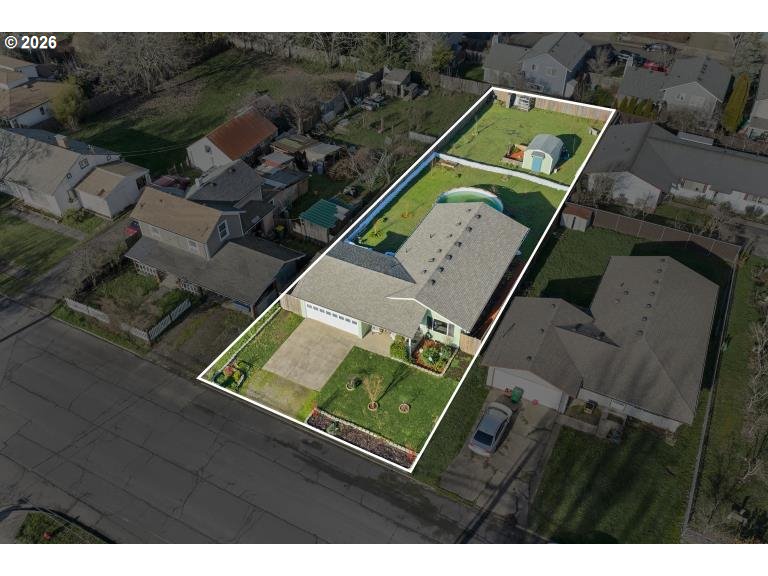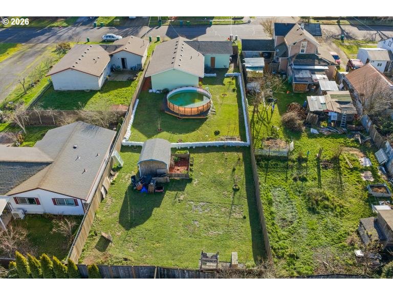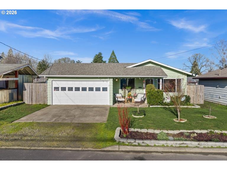 Open House Saturday and Sunday 12:00-2:00pm! Darling single-level home with an expansive, beautifully landscaped backyard. This inviting property welcomes you with a wide driveway featuring vibrant flowers, and a charming covered front porch. Inside, the light-filled living room showcases gleaming hardwood floors, designer paint, and a large picture window. The cheerful dining room off the kitchen provides ample space for a farm table and hutch, complemented by another sunny window. The updated kitchen includes maple cabinetry, granite slab countertops, tile backsplash, stainless steel appliances, pantry, and a cozy dining nook with access to the patio — an ideal spot for enjoying sunshine and hosting gatherings.A hallway with two generous storage closets leads to the remodeled bathroom featuring a step-in shower with glass door, new vanity, lighted mirror, and tile flooring. The primary bedroom offers hardwood floors, a custom lighted ceiling fan, and great closet space. Two additional bedrooms are well-sized with ample storage. The oversized garage includes a convenient door to the backyard, perfect for rinsing off after gardening or outdoor play. The fully fenced backyard is a standout feature with a large tool shed, blueberry bushes, ornamental trees, and plenty of lawn for pets and play. A large above-ground pool may remain for summer fun; sandbags can be removed if the buyer prefers. Recent upgrades include a new furnace and heat pump.Located in the heart of Forest Grove, this home offers easy access to Pacific University, the Wednesday Farmers Market, local restaurants, boutiques, award-winning wineries, and nearby Hagg Lake for fishing and hiking.