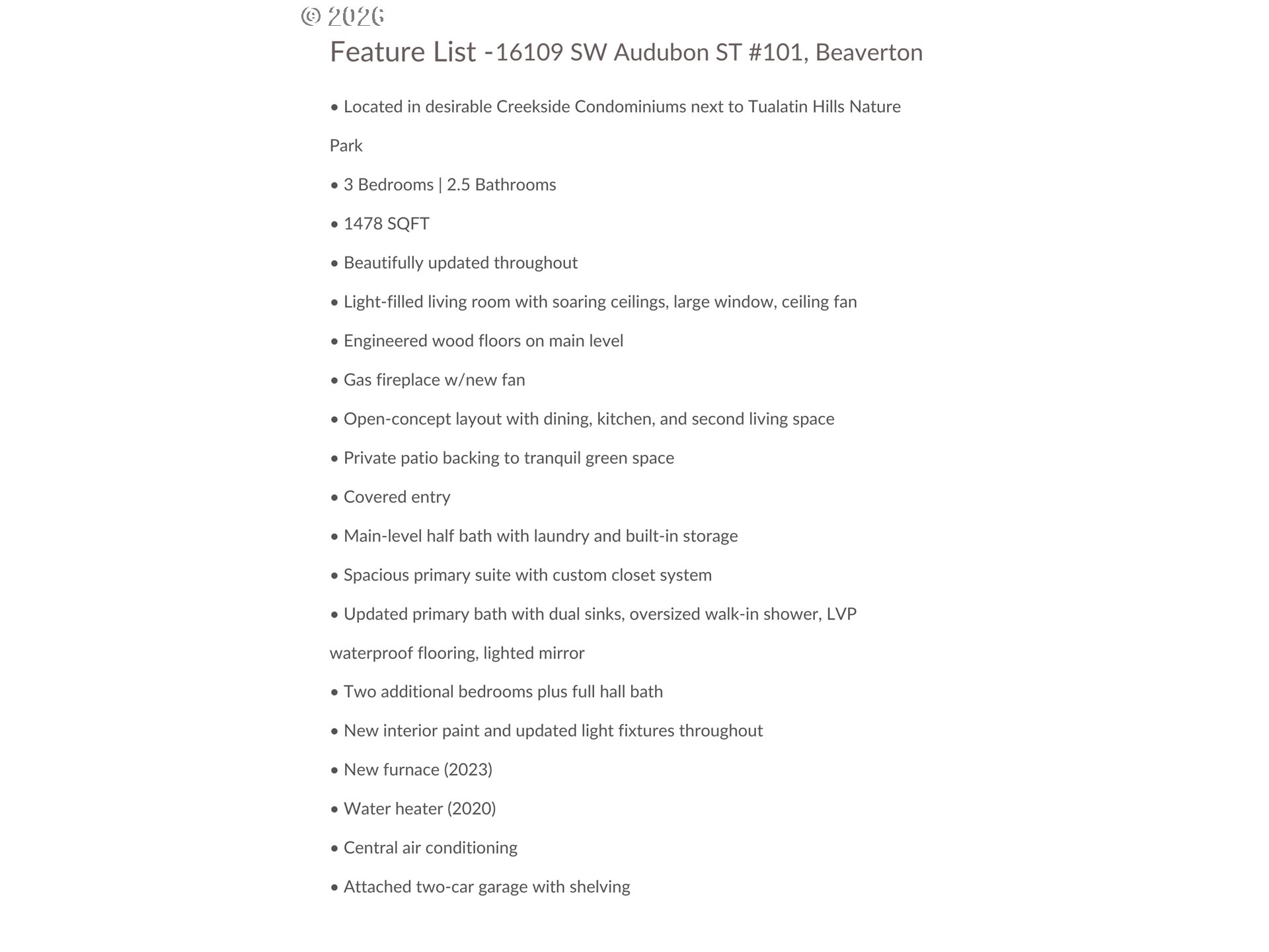 Tucked beside the Tualatin Hills Nature Park in the desirable Creekside Condominiums, this beautifully updated 3-bedroom, 2.5-bath home offers comfort, style, and an unbeatable Beaverton location. A covered entry leads into a light-filled living room with soaring ceilings, engineered wood floors, and a cozy gas fireplace, creating an inviting space for everyday living and entertaining.The open concept main level flows seamlessly through the dining area and kitchen, and 2nd living space. Step outside to your private patio backing to tranquil green space perfect for morning coffee or evening relaxation. A convenient main-level half bath includes laundry and built-in storage. Upstairs, the spacious primary suite impresses with a newly installed custom closet system and an updated bath with dual sinks, large walk-in shower w/3-1 shower system, double vanities, LVP Waterproof floors, and heated & lighted mirror. Two additional bedrooms and a full hall bath complete the upper level. Recent upgrades include new interior paint, updated light fixtures, new furnace (2023), water heater (2020), and central air conditioning, carpets professionally cleaned. The attached two-car garage offers shelving for extra storage.This well managed community feels more like a single-family setting and is minutes to MAX, Nike, Intel, shopping, dining, and downtown Beaverton & FHA approved. A rare opportunity to enjoy low-maintenance living in a peaceful, park like setting don’t miss your chance to call this one home!
