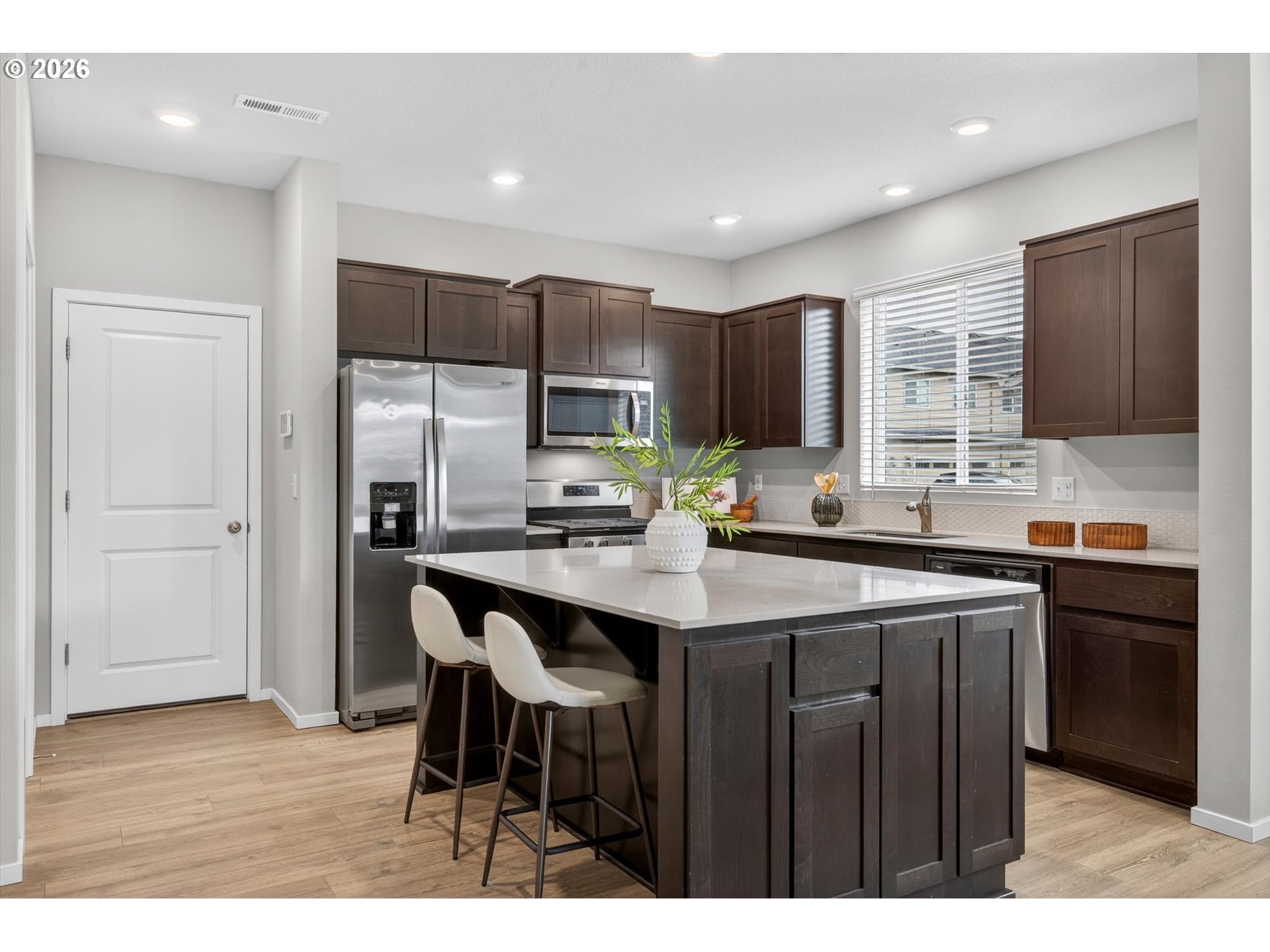 Bright and Beautifully maintained corner townhome overlooking greenspace. 1,932 Sq Ft great room floor plan with 3 bedrooms + loft and 2.5 bathrooms. Cozy great room with gas fireplace opens to kitchen with large island, quartz countertops & stainless steel gas appliances. Upstairs you'll find the primary suite, two additional bedrooms, a guest bath, and a generous loft — perfect for a home office or additional living space. South-facing with covered front porch. Attached 2 car garage. Low HOA- $199/month, covers exterior maintenance, management and front yard landscaping. Great schools-Sato, Stoller, and Westview