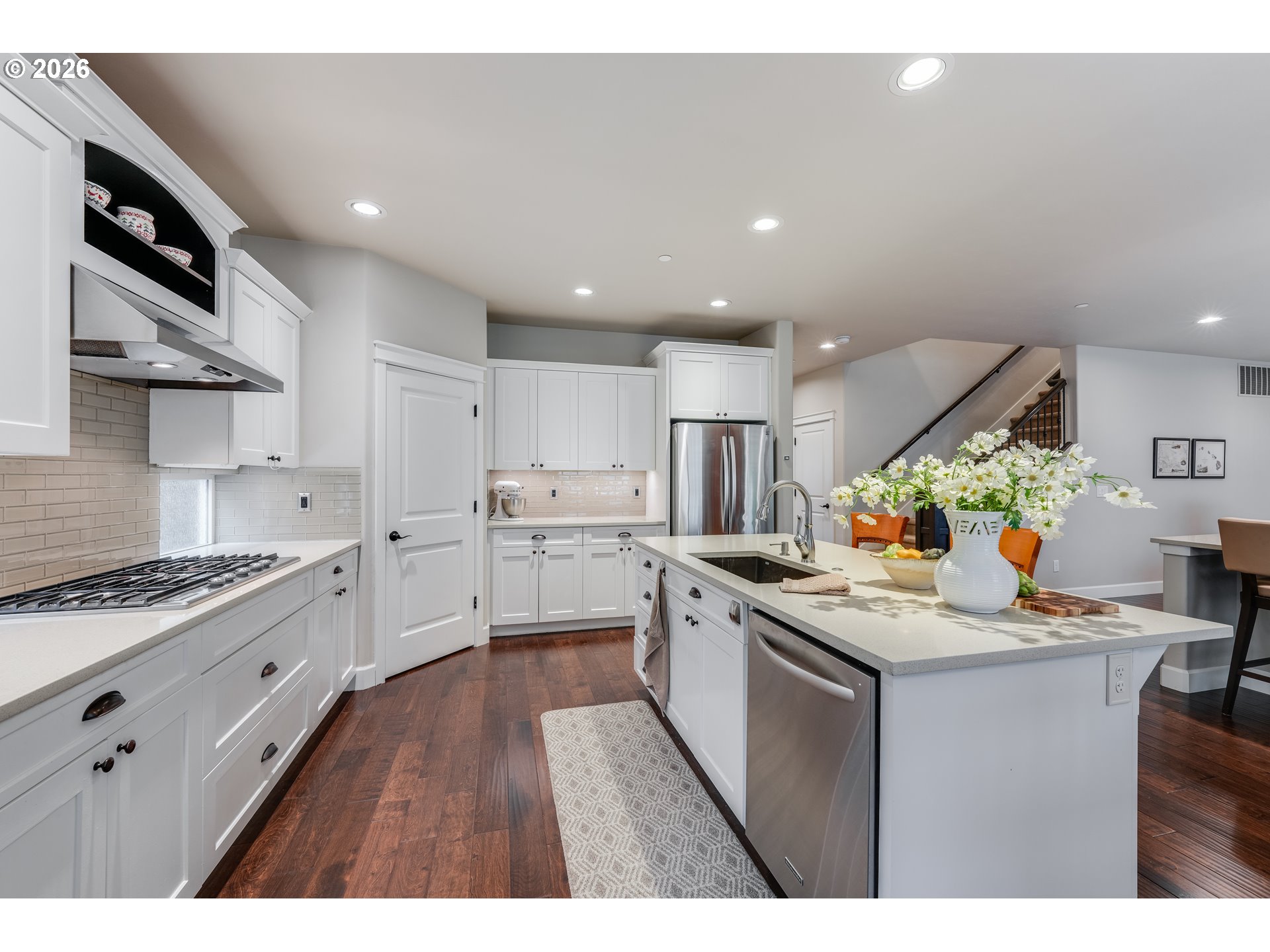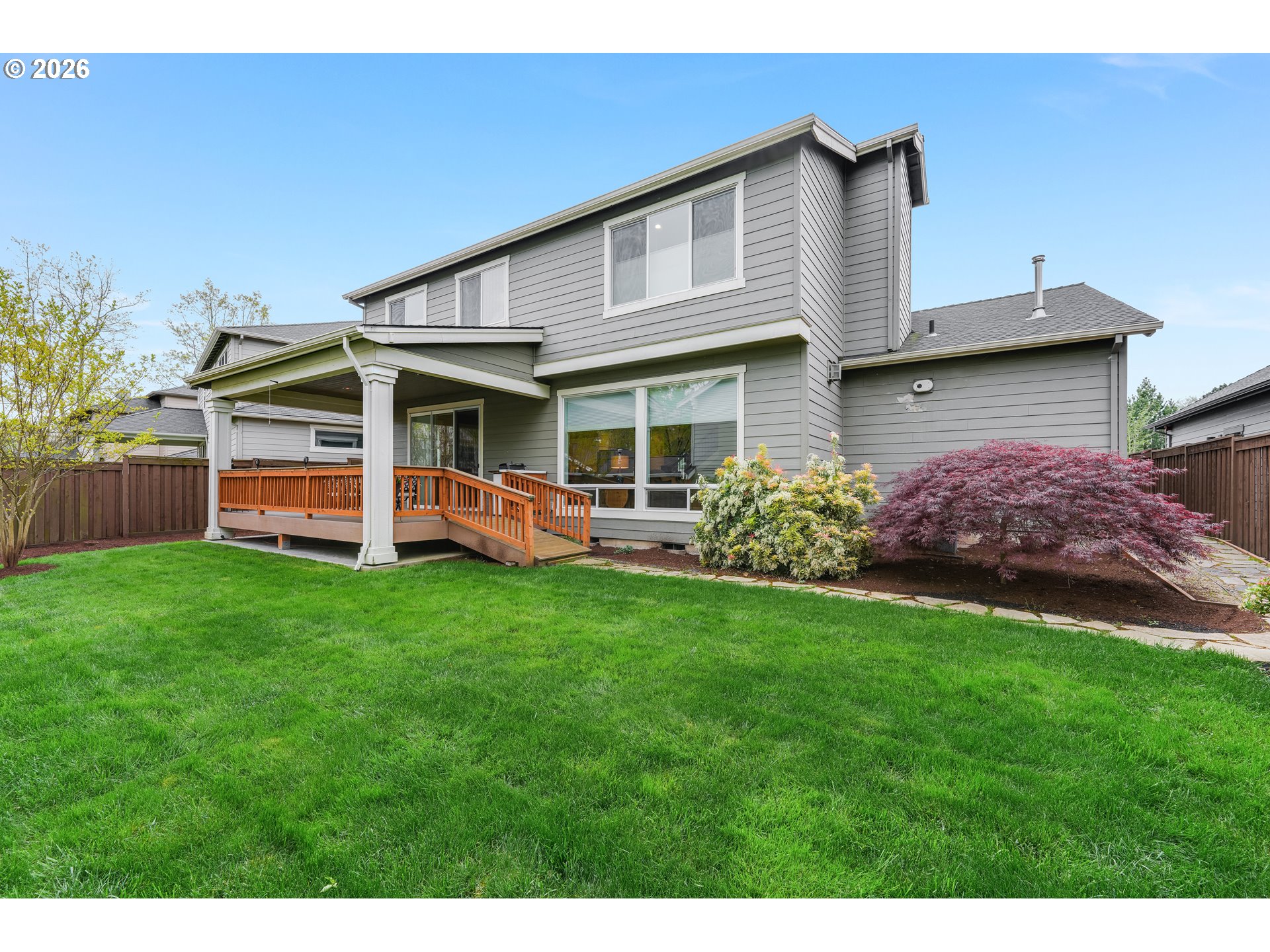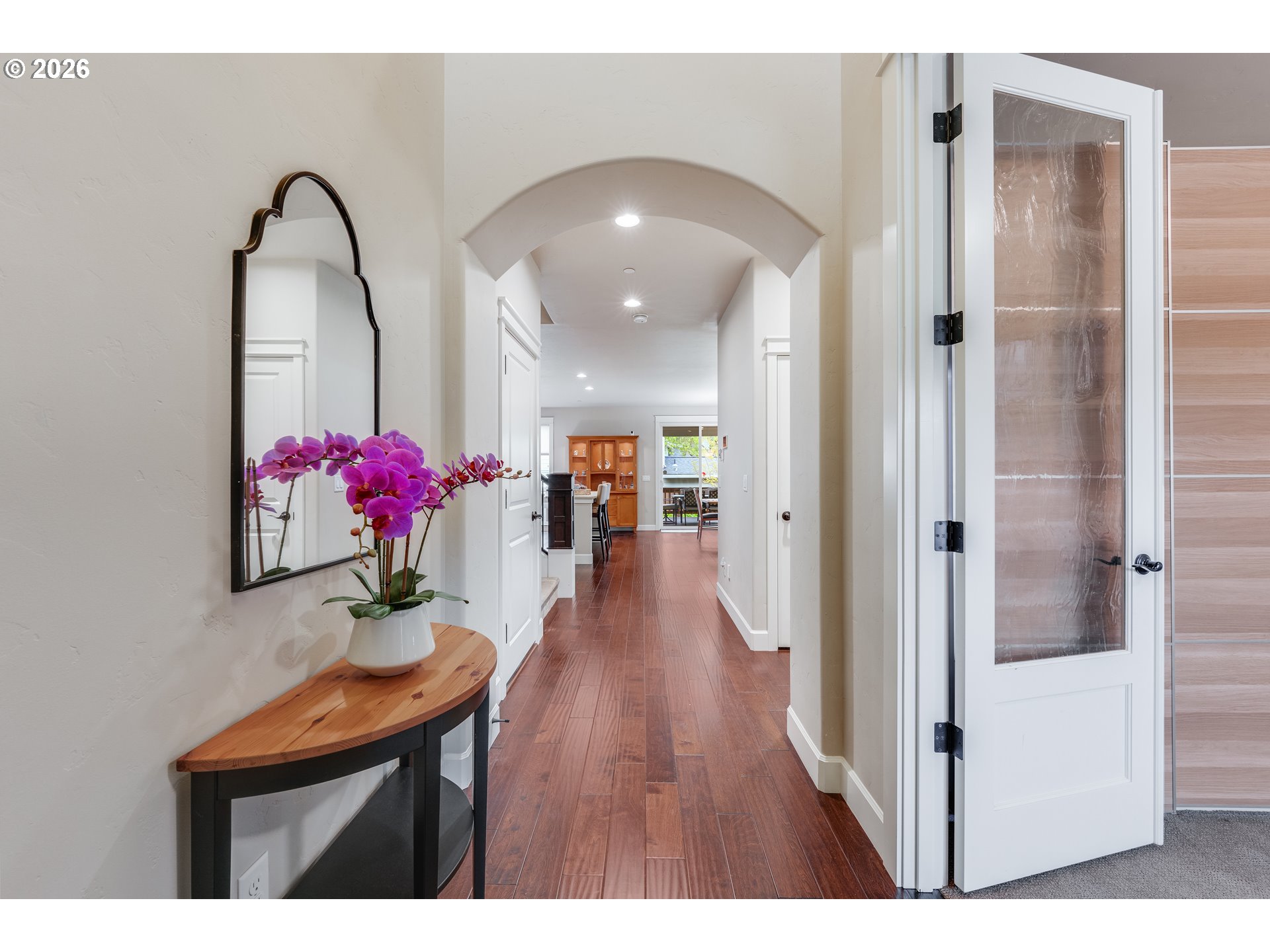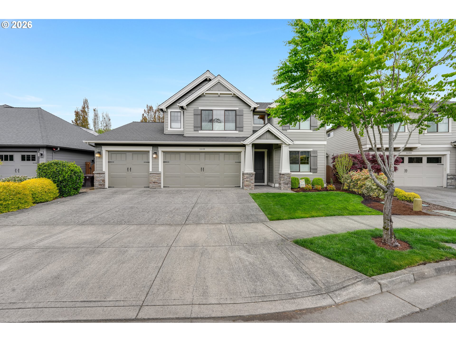 Built by Pahlisch Homes in 2014, this beautifully maintained 4-bedroom, 3-bath home in Orenco Station offers flexible living, thoughtful upgrades, and exceptional garage space rarely found in the neighborhood. Warm wood floors welcome you into the foyer, where a main-level bedroom or office sits adjacent to a full bath with walk-in shower—ideal for guests, multi-generational living, or working from home. The open-concept great room features a cozy gas fireplace, built-in bookshelves, and a spacious kitchen with quartz countertops, built-in microwave, water filtration system, and easy flow into the dining area—perfect for everyday living and entertaining alike. Step outside to the large covered patio, flagstone pathways, and sprinkler-supported landscaping designed for easy outdoor enjoyment year-round. Upstairs offers a generous bonus room, additional bedrooms, full bath, and a spacious primary suite retreat with soaking tub, walk-in closet, glass enclosed shower, and private water closet. The upstairs laundry room adds everyday convenience, and the washer, dryer, and refrigerator are included. A standout feature of this home is the heated and insulated 4-car garage with heavy epoxy floor coating, built-in workspace in the fourth bay, and utility sink—ideal for hobbies, storage, projects, or extra vehicles. Additional highlights include central air conditioning, central vacuum, recirculating hot water system, fire suppression system, and pre-wiring for solar. Located in the highly desirable Orenco Station community near parks, shopping, dining, and transit, this home combines comfort, flexibility, and modern efficiency in one exceptional package. Open Saturday from 1-3.
