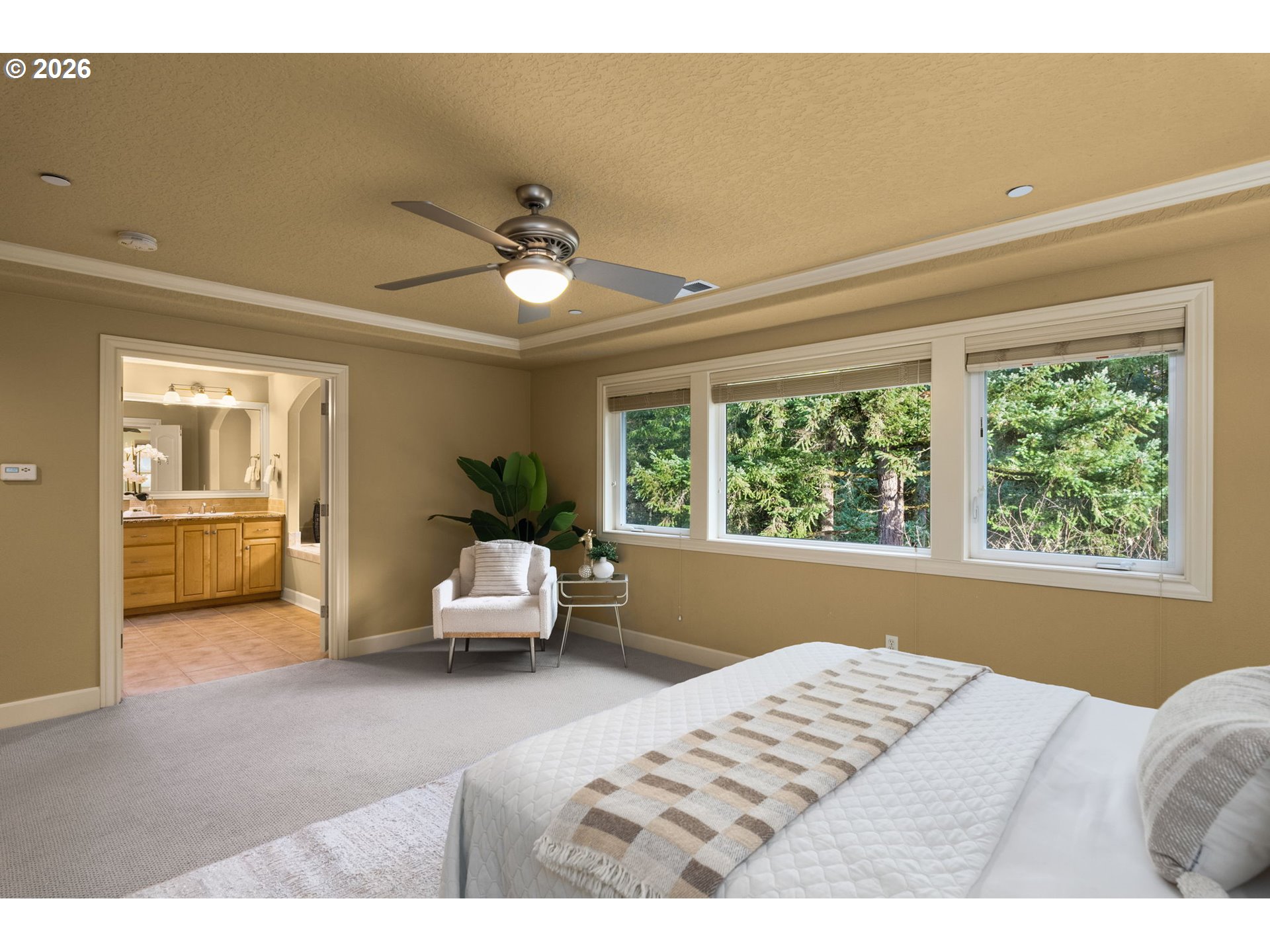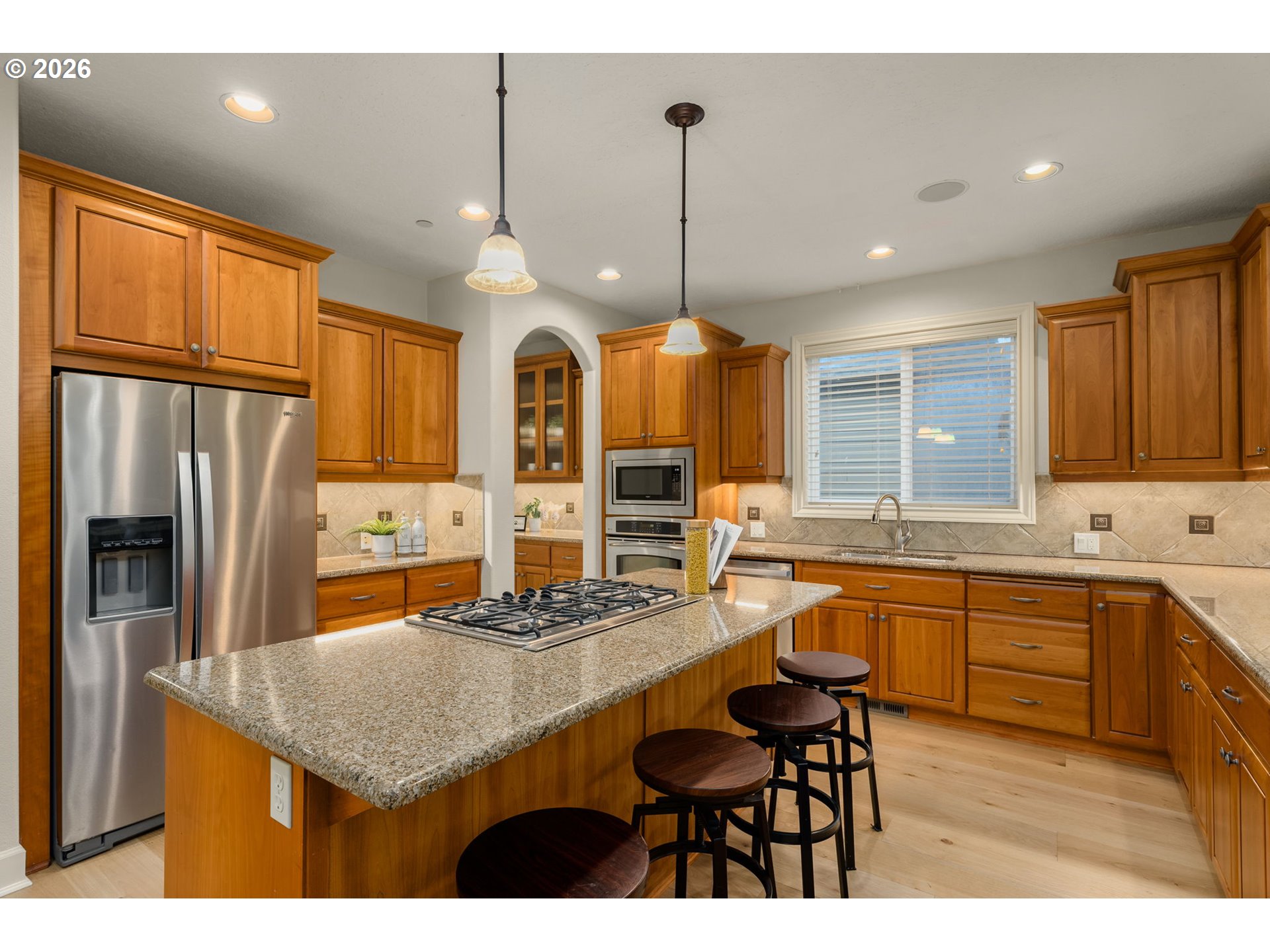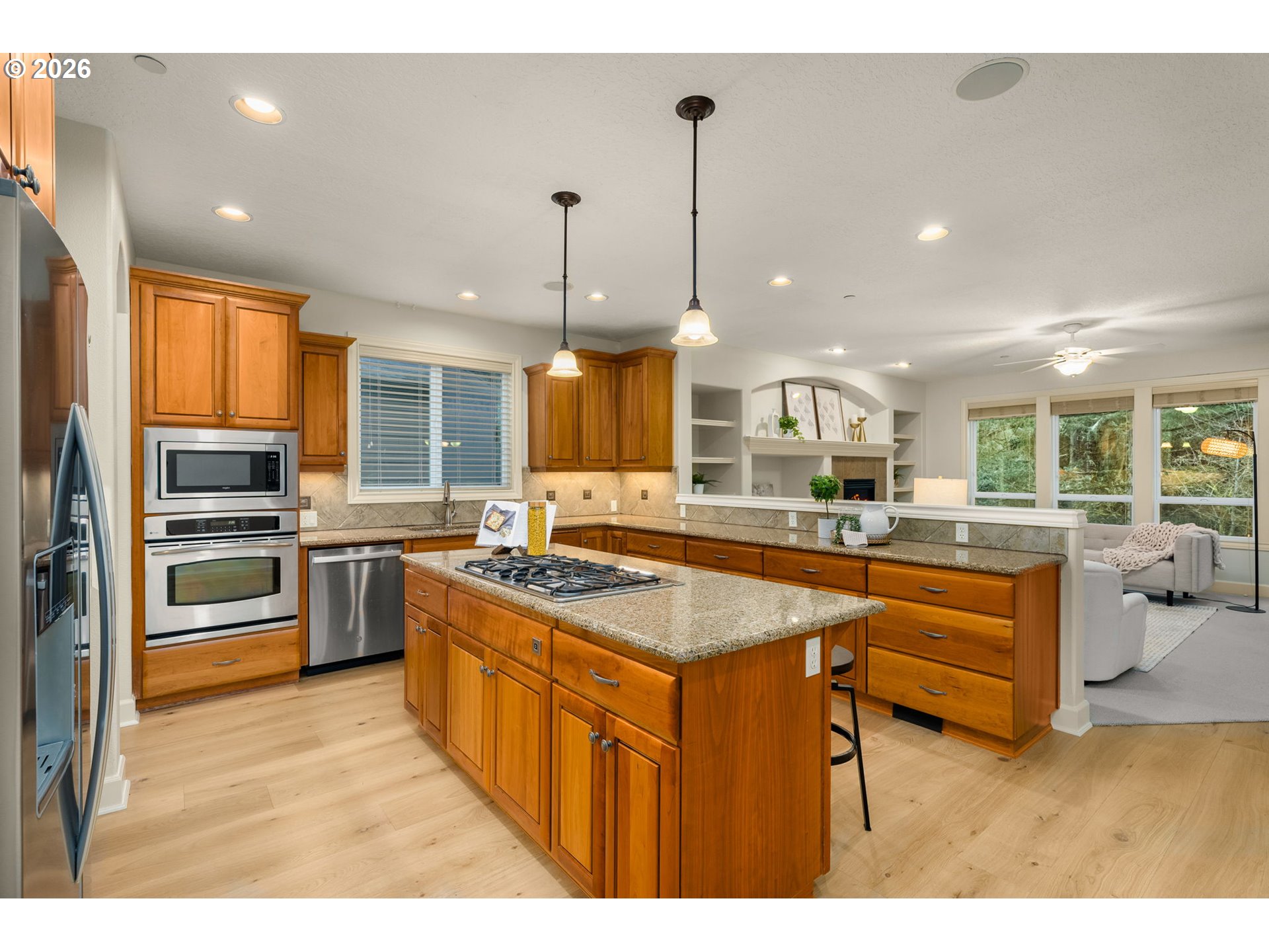 This 5BD/4BA home offers 4,466 SF across three finished levels with a craftsman exterior, recently painted siding, stacked stone entry, and 3-car garage. Main level features white oak flooring, formal dining, and a spacious kitchen with granite counters, large island with 5-burner gas cooktop, stainless appliances, butler’s pantry, and ample storage. Living room includes built-ins, gas fireplace, and forested views for added privacy. Main-level bedroom and full bath provide flexible guest or multi-gen space. Upstairs offers oversized bedrooms, built-in office workstation, bonus flex room, large laundry, and primary suite with soaking tub, walk-in closet, and skylight. Walkout lower level includes a large bonus room with projector/screen, second fireplace, additional bedroom, and full bath. Outdoor spaces include two decks, patio, and low-maintenance setting backing to green space. Community pool/playground plus quick access to Cooper Mountain Nature Park, Mountainside HS, Nike, Intel, and Kaiser.