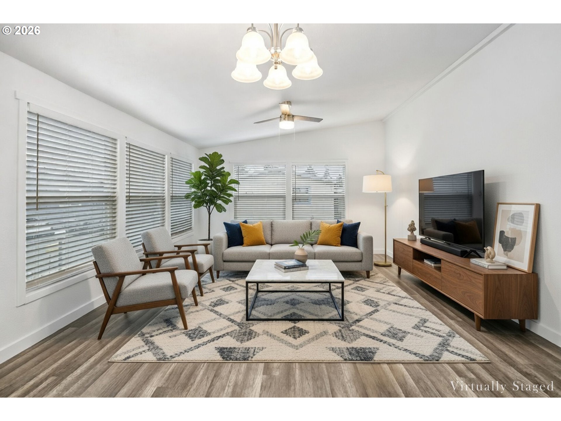 Quality and value abound in this coveted 55+ community. Nestled between the Tualatin and Sherwood communities, Angel Haven is a quiet and well maintained manufactured home community. This home has a new roof, all new interior paint, new carpet, new engineered hardwood floors, updated fixtures and updated kitchen. All kitchen appliances, washer/dryer & freezer stay with the home. This home is truly move-in ready!! Park dues are $925 / month and be aware that upon acceptance of an offer, a buyer must also make an application with the park and needs to be approved prior to closing. Seller requests OREF forms only when submitting an offer and your agent must have their MSD license. Close proximity to the Tualatin River & Tualatin River National Wildlife Refuge offering trails and tranquility. Also close proximity to shopping, restaurants, medical services and public transportation.