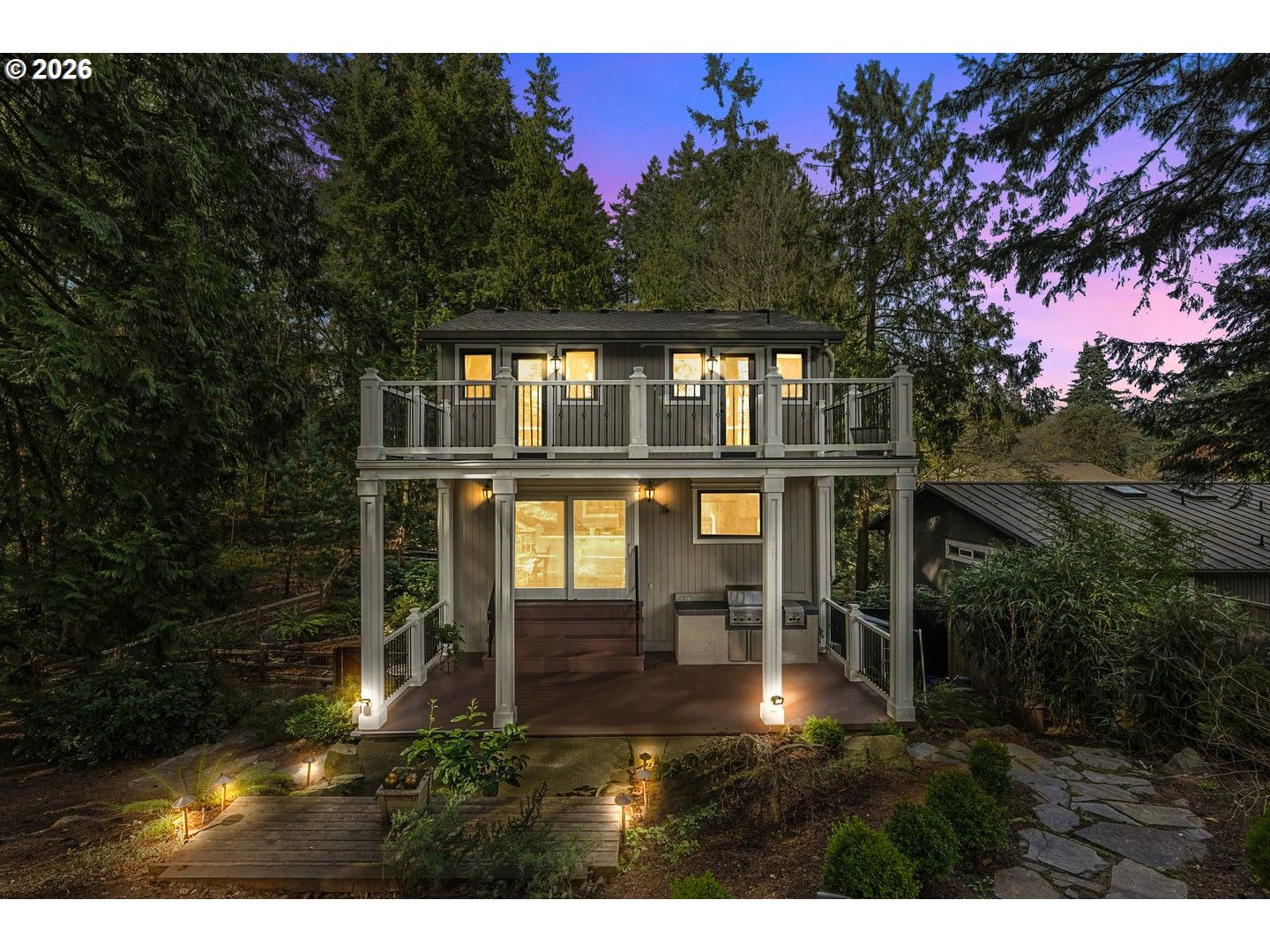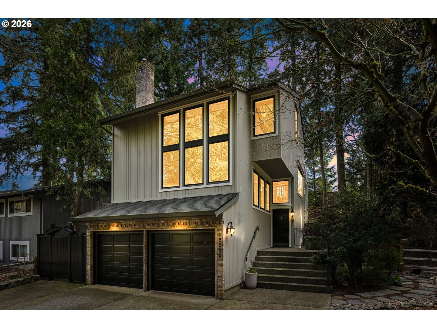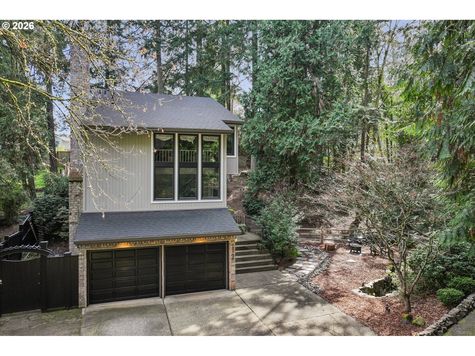Located on a private drive on Cooper Mountain, this unique Pacific Northwest Contemporary home offers privacy, modern design, and convenient access to everyday amenities. The .28-acre lot features mature trees and a creek.Inside, the home includes vaulted ceilings, large windows, and open living spaces centered around a fireplace. The kitchen provides ample storage and flows easily into the dining and living areas, making it ideal for entertaining. High-quality finishes and custom details are found throughout.A new HVAC system (installed in 2023) ensures efficient year-round comfort in this fully electric home, which also has a fully functional intercom system for added convenience.The primary suite features a walk-in closet, built-in wall safe, and an updated bathroom. Upstairs bedrooms each have private access to a shared balcony overlooking the backyard.Outdoor features include multiple seating areas including a covered deck, hot tub area, and firepit. Additional highlights include a level driveway, 2-car garage with workspace and built-ins, and generous storage throughout.Conveniently located near schools, pharmacies, grocery stores, dining, and daily essentials.