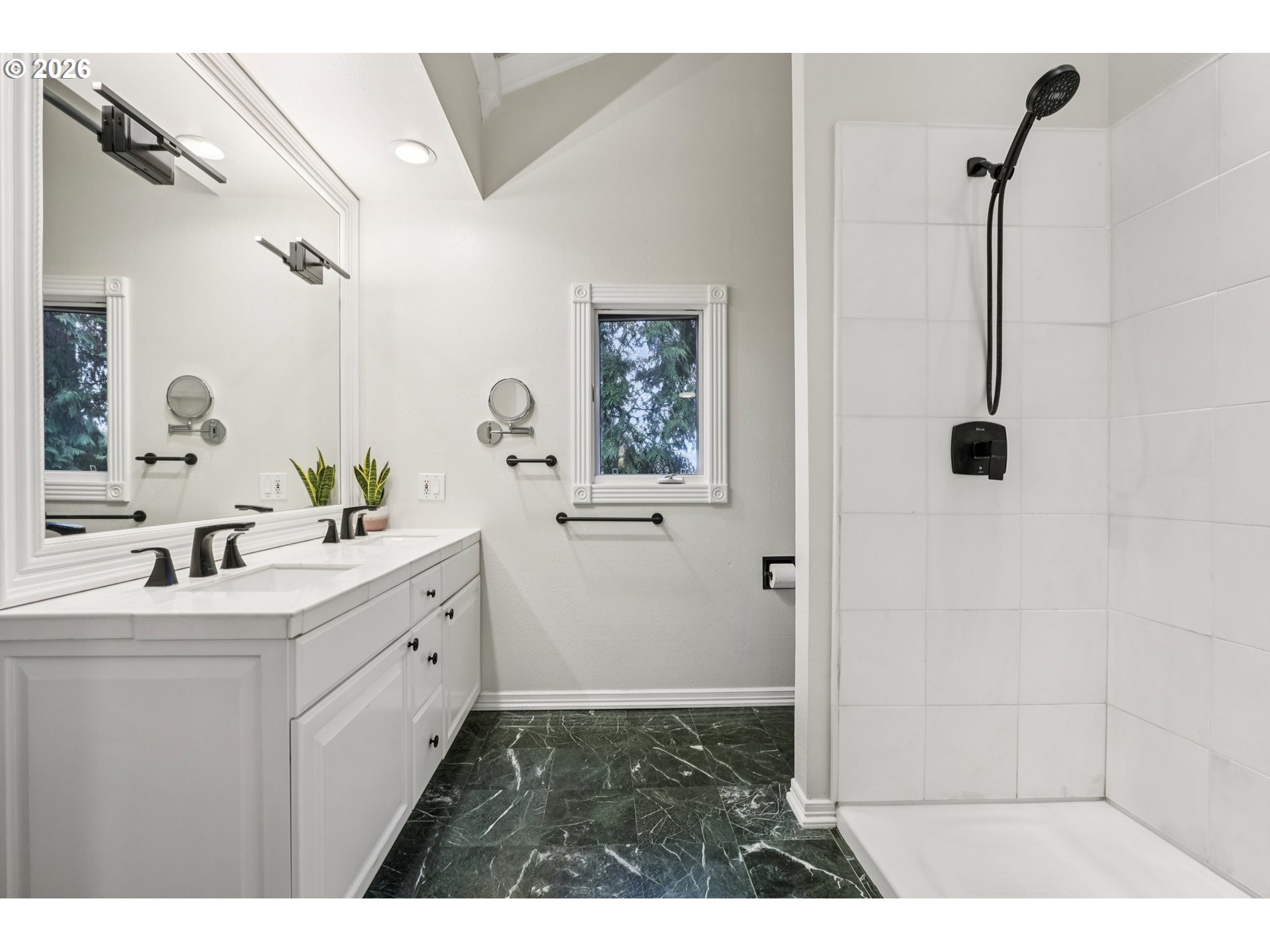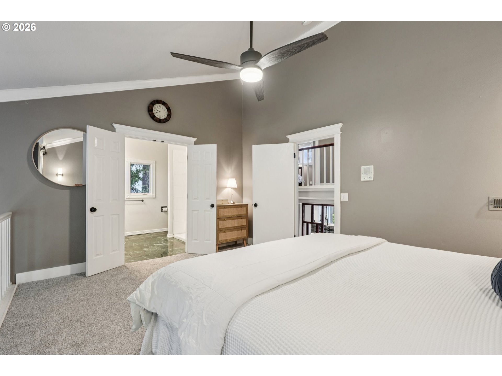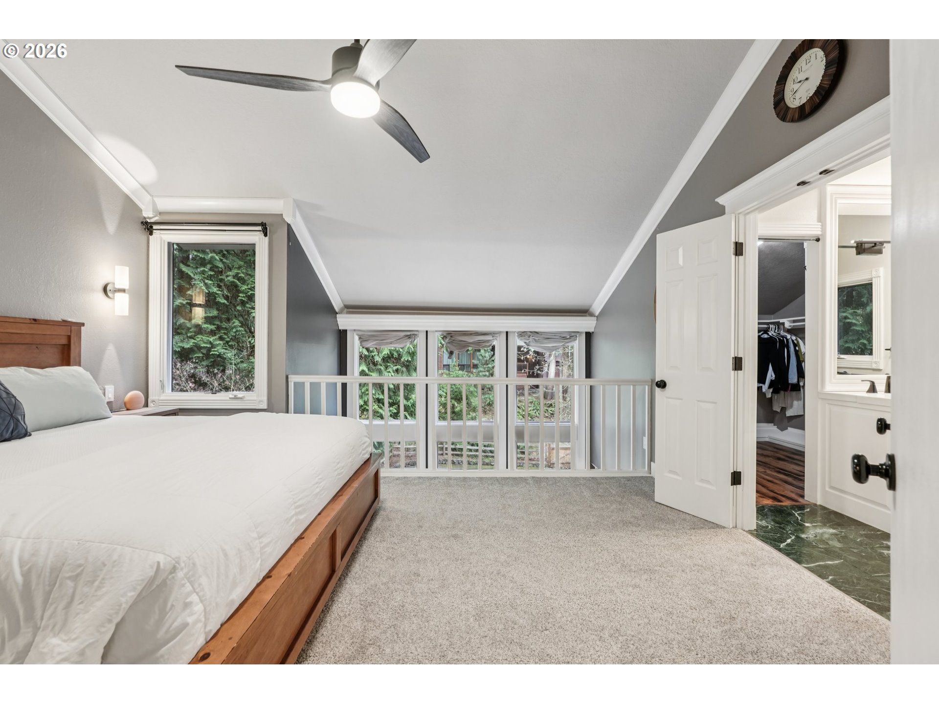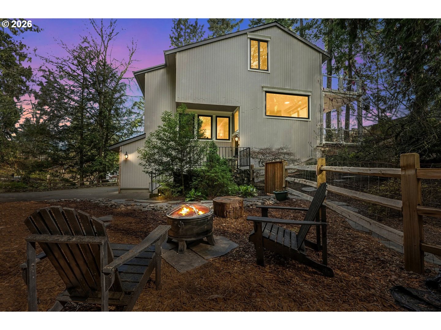 Located on a private drive on Cooper Mountain, this unique Pacific Northwest Contemporary home offers privacy, modern design, and convenient access to everyday amenities. The .28-acre lot features mature trees and a creek.Inside, the home includes vaulted ceilings, large windows, and open living spaces centered around a fireplace. The kitchen provides ample storage and flows easily into the dining and living areas, making it ideal for entertaining. High-quality finishes and custom details are found throughout.A new HVAC system (installed in 2023) ensures efficient year-round comfort in this fully electric home, which also has a fully functional intercom system for added convenience.The primary suite features a walk-in closet, built-in wall safe, and an updated bathroom. Upstairs bedrooms each have private access to a shared balcony overlooking the backyard.Outdoor features include multiple seating areas including a covered deck, hot tub area, and firepit. Additional highlights include a level driveway, 2-car garage with workspace and built-ins, and generous storage throughout.Conveniently located near schools, pharmacies, grocery stores, dining, and daily essentials.