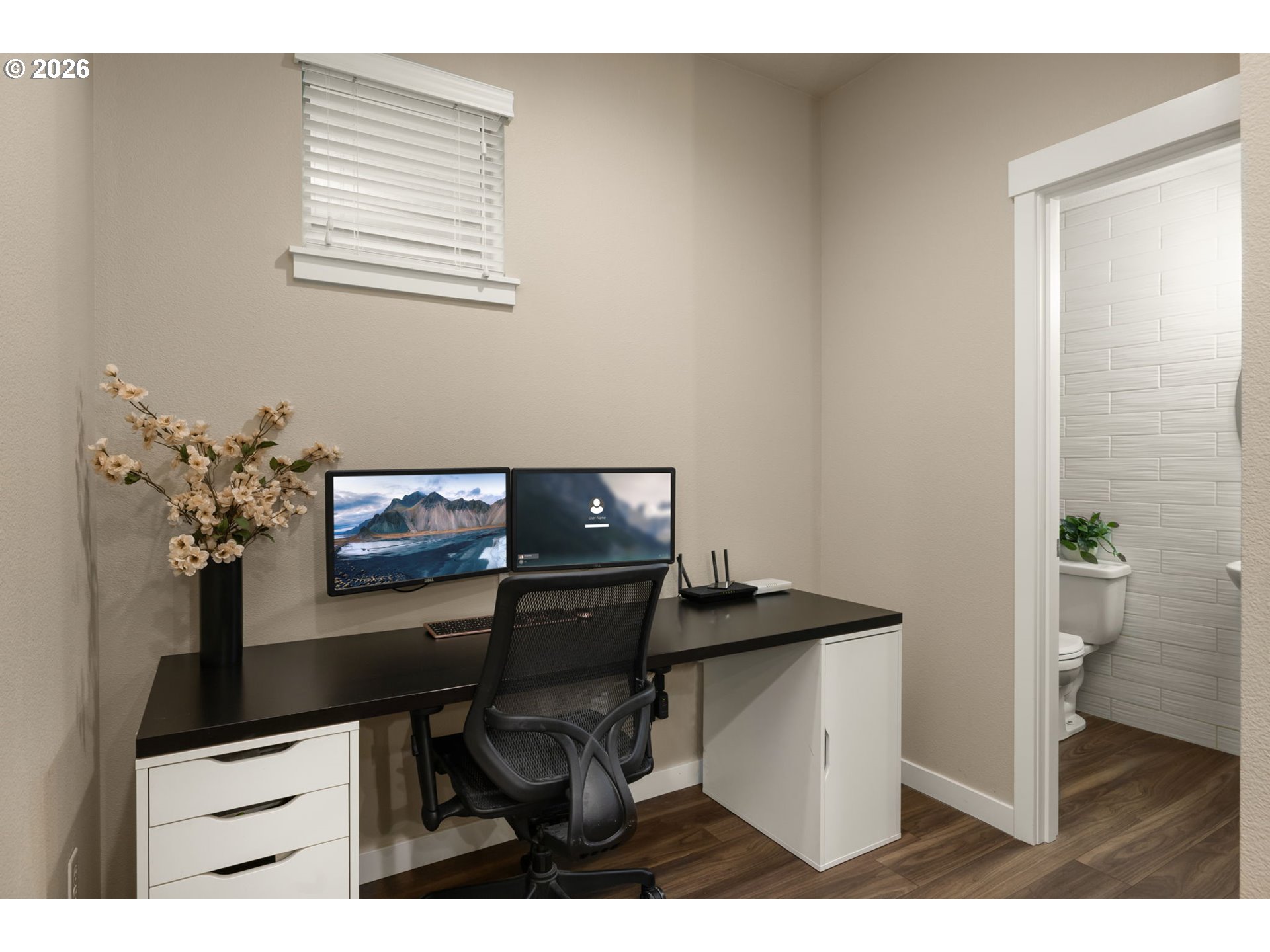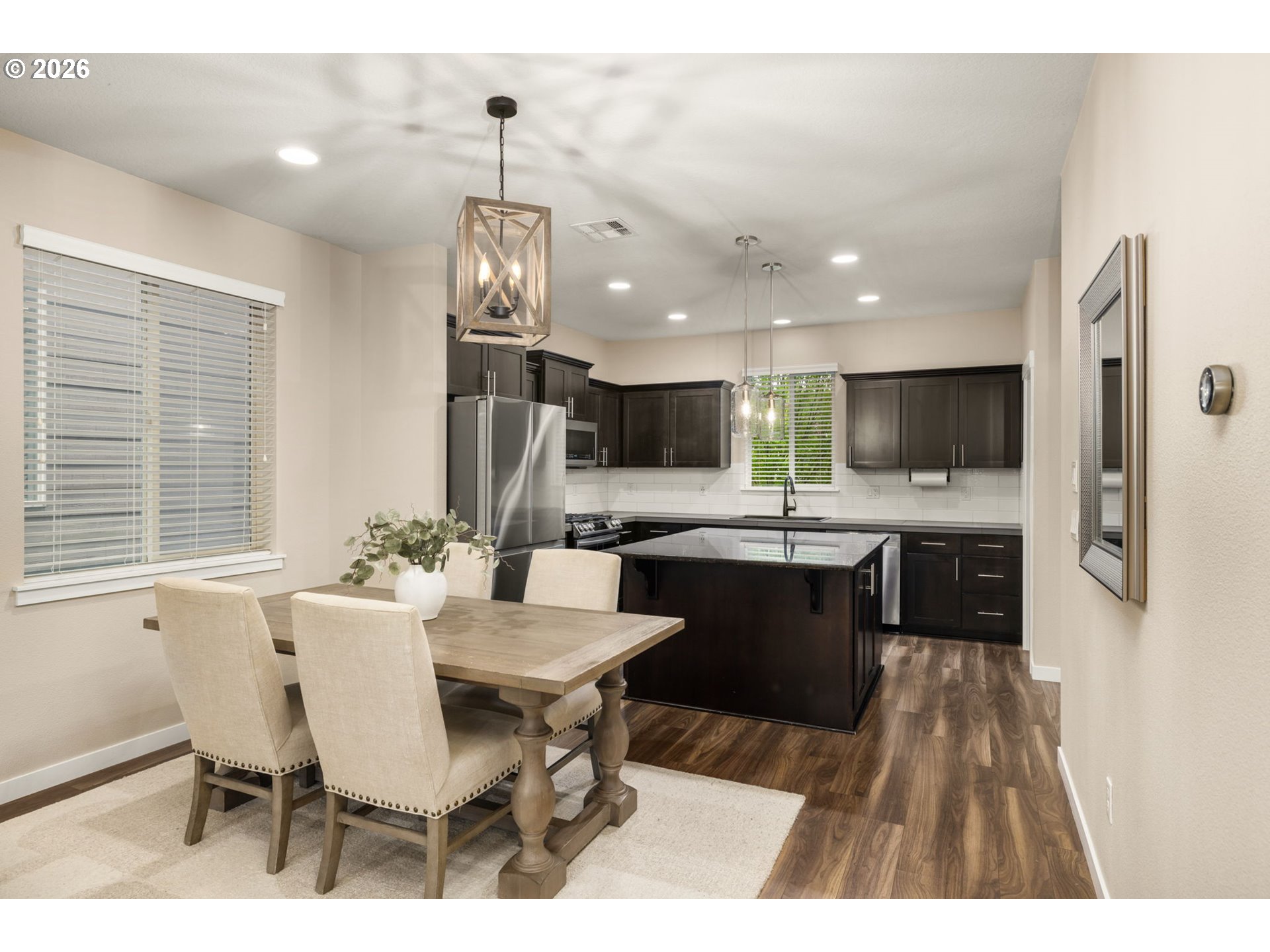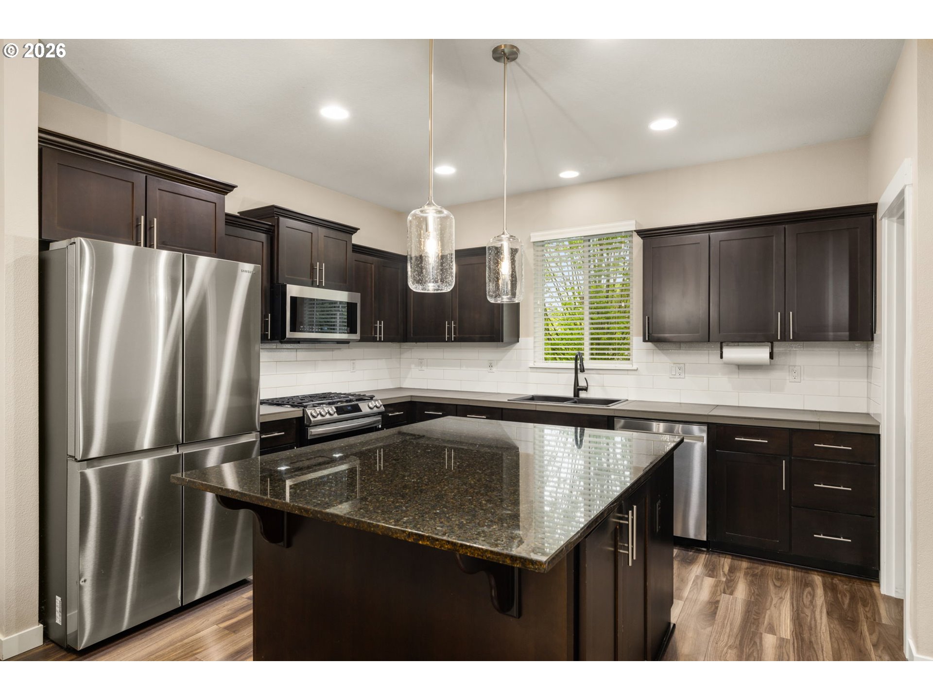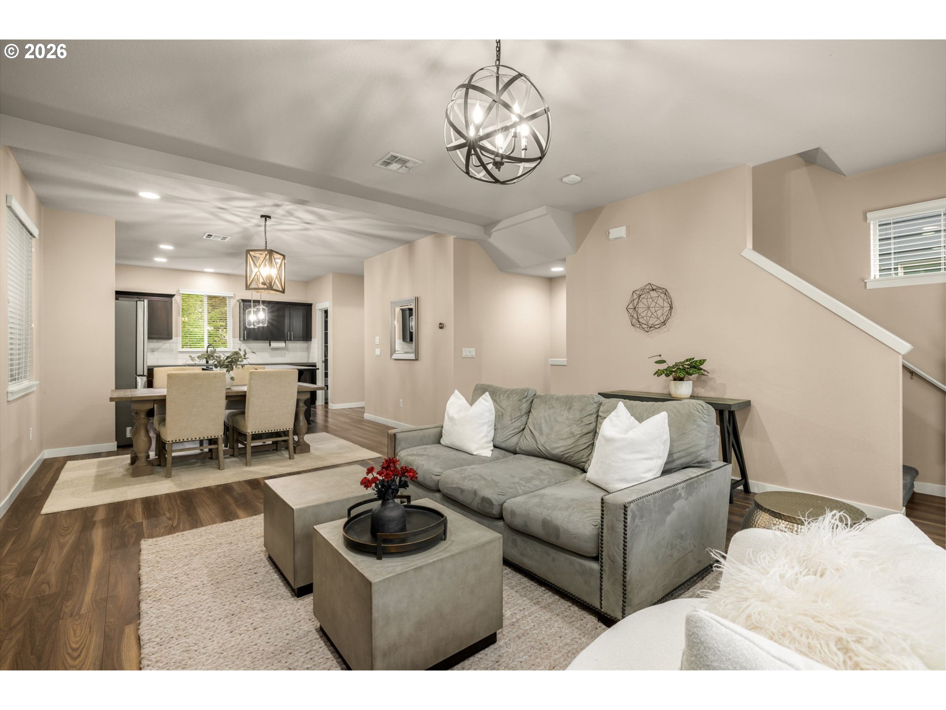 Tri-level contemporary home in a highly convenient location just minutes from VillaSport Athletic Club, Nike, Hwy 26 access, shopping, and dining! Thoughtful updates throughout include new carpet on stairs and laminate flooring throughout (2019), stainless steel appliances (2021), a custom pantry (2025), and a new air conditioning system (2024). The main level features a bright, open layout with laminate flooring throughout the kitchen, dining, and living spaces. The gourmet kitchen offers granite countertops, stainless steel appliances, a gas range, built-in microwave, tile backsplash, island workspace, and a custom pantry for additional storage. The dining area flows seamlessly into the living room, creating an easy space for everyday living and gatherings. The lower level provides an office with laminate flooring and double doors, offering a flexible workspace or additional use options. Upstairs, the primary suite includes double closets with organizers and an ensuite bathroom featuring double sinks and a tiled walk-in shower. Two additional bedrooms feature laminate flooring, closets with organizers, and ceiling fan comfort. The laundry area is conveniently located on the upper level and includes a washer and dryer. Community amenities include access to a pool, clubhouse, and fitness center for added convenience and recreation. With multiple recent updates and a location close to major employers, recreation, and everyday amenities, this home offers a functional layout and excellent accessibility!