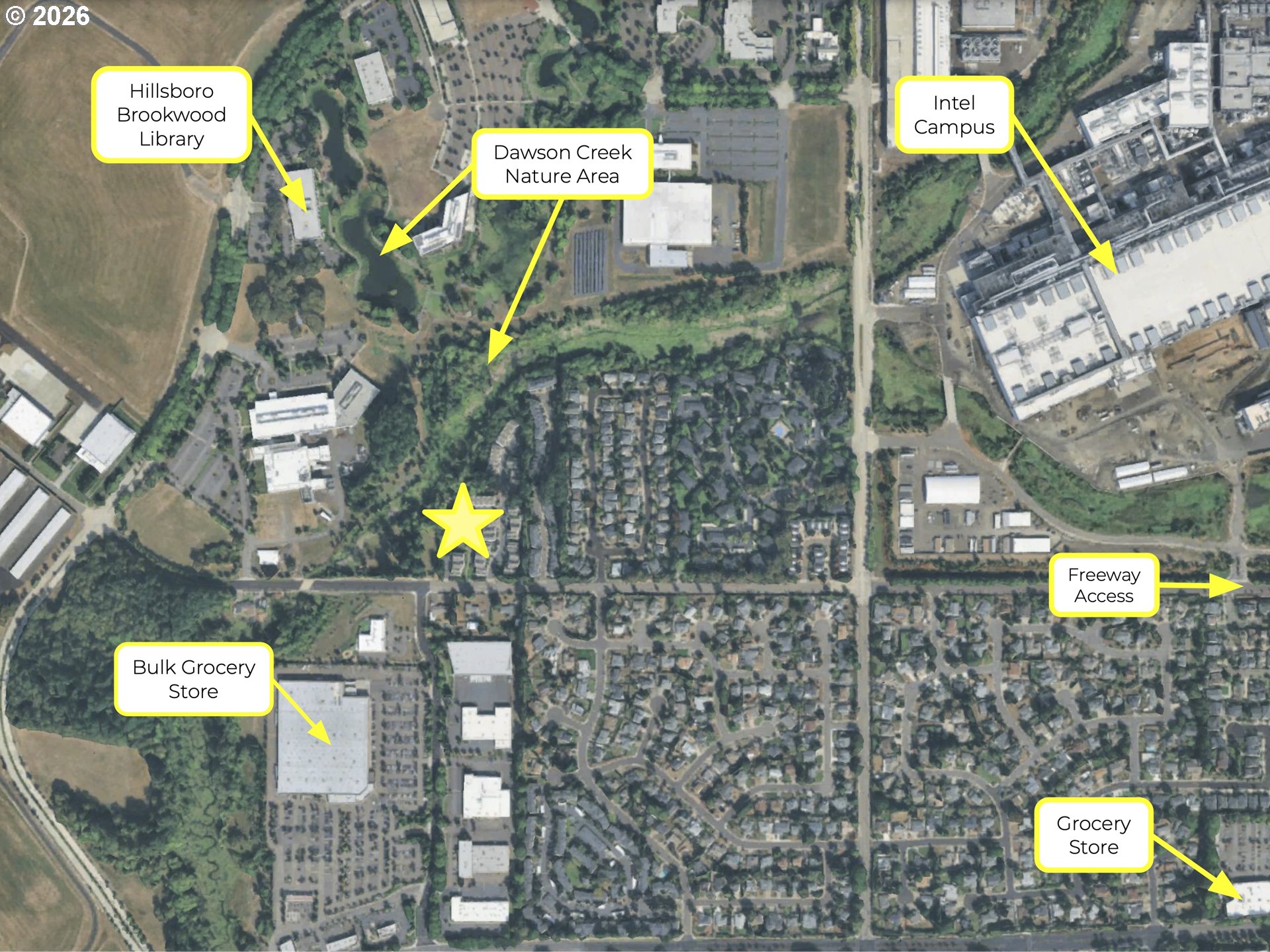 Light-filled Craftsman townhome in a prime Hillsboro location, bordering Dawson Creek Park. This 2007-build offers 1,587 sqft of thoughtfully designed living space and a serene, wooded setting just minutes from everyday conveniences. The main living level features high ceilings and hard wood floors throughout, with an open kitchen complete with granite countertops, stainless steel appliances, and a large island. Enjoy a cozy breakfast nook with access to a rear deck overlooking the common area, plus a spacious living room with sliding doors to a covered front balcony, dining area, and a convenient half bath. Upstairs, both bedrooms feature high ceilings, wall-to-wall carpet, generous closet space, and private ensuite bathrooms. A bonus room, perfect for a nursery or home office, and upstairs laundry add flexibility and everyday convenience. The attached deep tandem garage includes a Tesla charging station and an additional rear room ideal for storage, a home gym, or creative space. Located in the 30-unit Travertine Condominium community, this energy-efficient home boasts an 8/10 energy score, a 92% efficient gas furnace, double-pane windows, natural gas water heater, and A/C. HOA dues cover exterior maintenance and common areas. SE-facing windows provide excellent natural light, and the pet-friendly HOA has no breed or size restrictions. Rental cap is currently met with a waitlist. Just a quarter mile to Costco, half a mile to Brookwood Library, and less than a mile to Orenco Station’s shopping and dining—this home delivers comfort, efficiency, and location in one smart package. [Home Energy Score = 8. HES Report at https://rpt.greenbuildingregistry.com/hes/OR10244220]