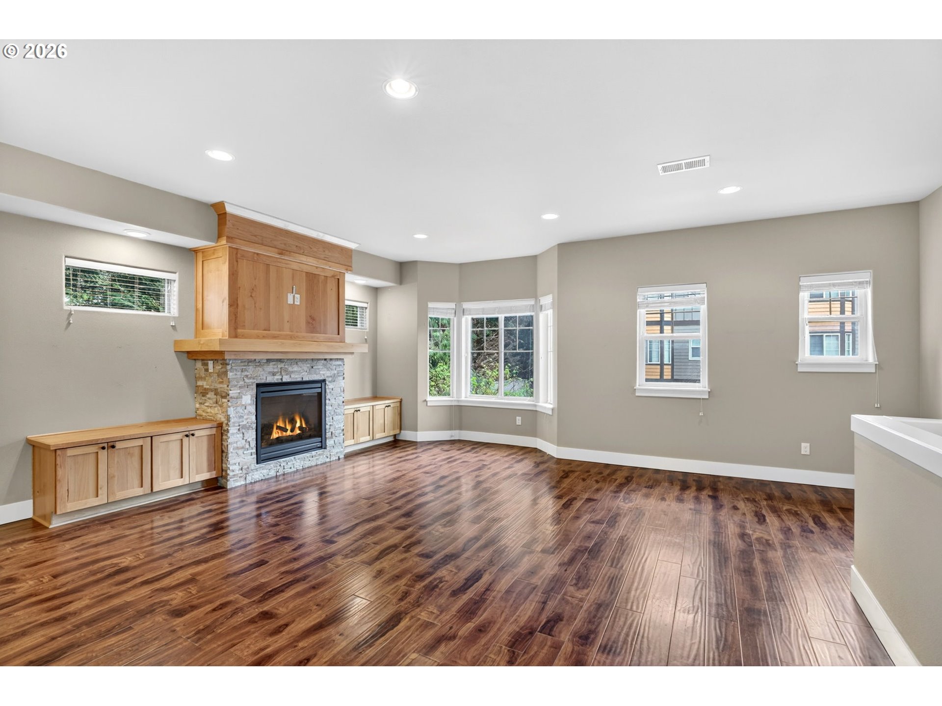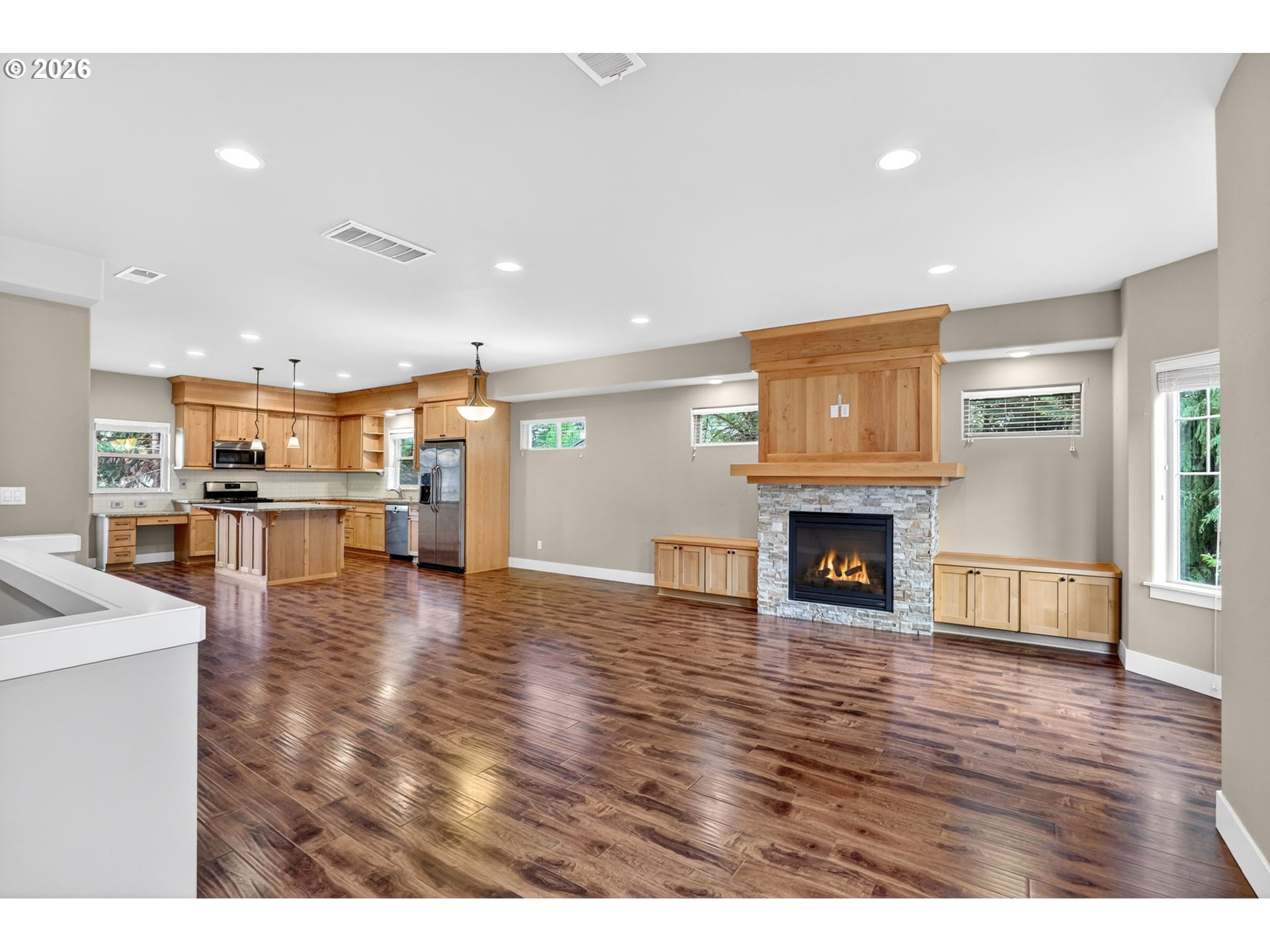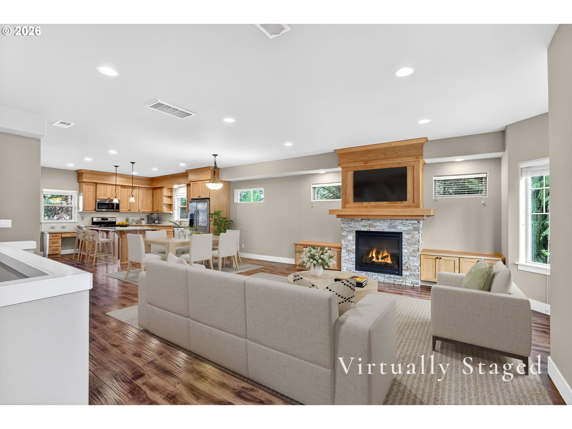 Experience the perfect blend of privacy and convenience in this sun-drenched, turnkey gem. The ground level welcomes you with a rare find: a full primary suite featuring an ensuite bath and its own exterior entrance—ideal for guests, a home office, or multigenerational living. The heart of the home shines with a gas fireplace flanked by custom built-ins, spacious pantry, and a chef’s kitchen boasting a full-height backsplash and stainless appliances. Retreat upstairs to a second primary suite with soaring vaulted ceilings. With an oversized mudroom, newer carpet, ample storage, and light rail access just a half-mile away, this home offers effortless living at every turn.