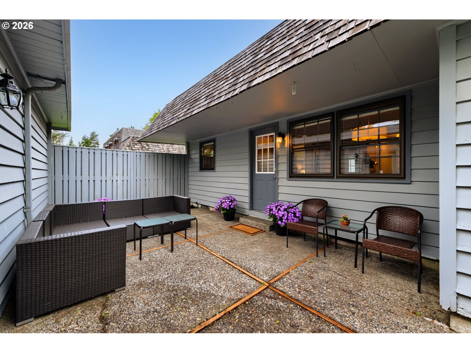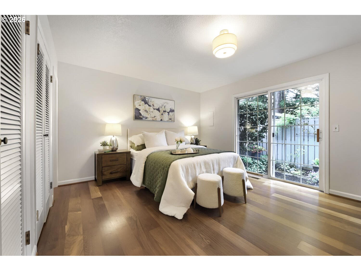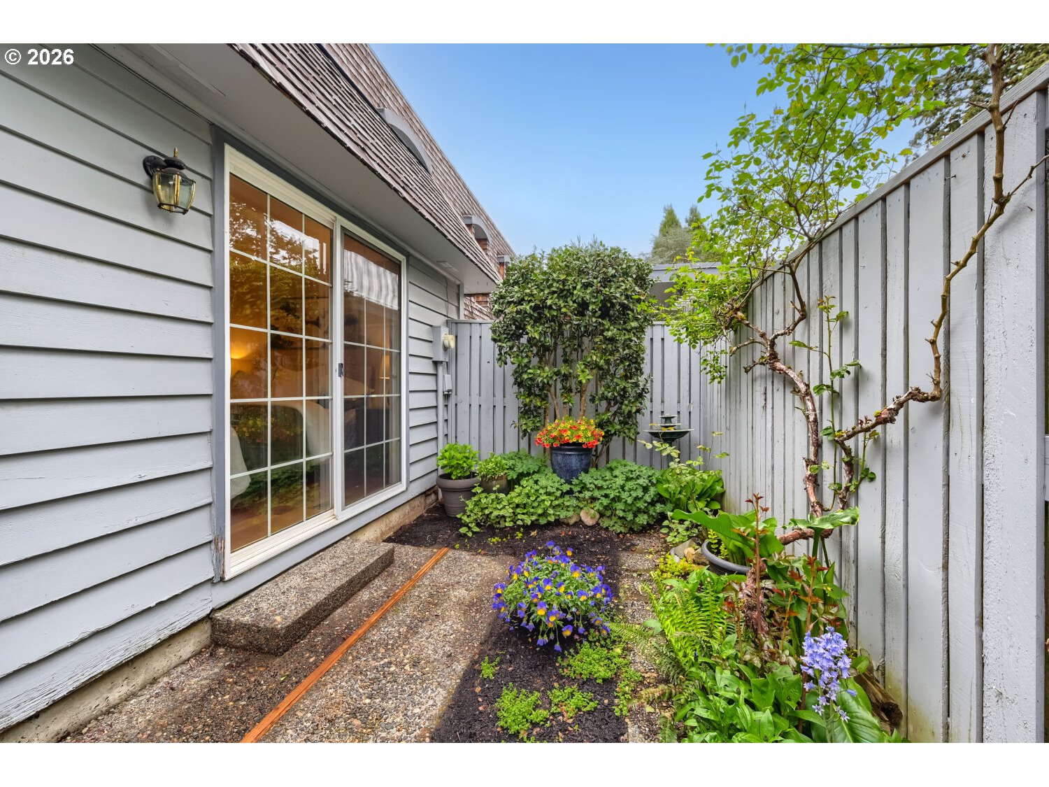 Move-in ready and beautifully maintained, this rare single-level corner unit on the ground floor offers comfort, convenience, and an exceptional location. The home features 2 bedrooms and 2 bathrooms, with expansive windows that fill the space with natural light and showcase peaceful views of the community park and pool. The gorgeous primary suite opens to the garden and has two closets. Interior highlights include Brazilian cherry hardwood floors, stainless steel appliances, central air conditioning, and recent upgrades such as new carpet, new dishwasher, fresh interior paint, and updated door hardware. The thoughtful layout extends to a private, fenced, covered patio—perfect for pets, barbecuing, and al fresco dining. Additional amenities include an oversized & insulated two-car garage, driveway parking, and ample guest parking throughout the community. This unit is just minutes from shopping and dining, and conveniently located near Rock Creek Golf Course, with an easy commute to Intel and Nike. The low HOA fee covers access to the pool, exterior maintenance, and front yard landscaping. Previously owner-occupied by a non-smoker with no pets, this home reflects pride of ownership throughout.