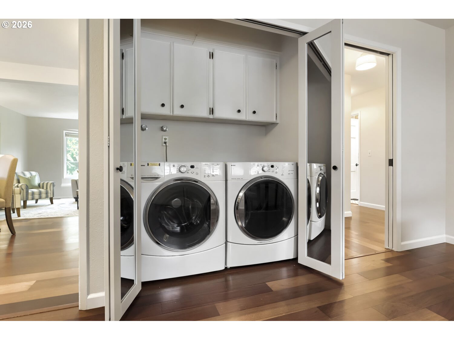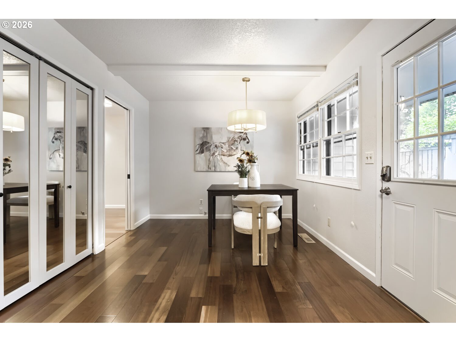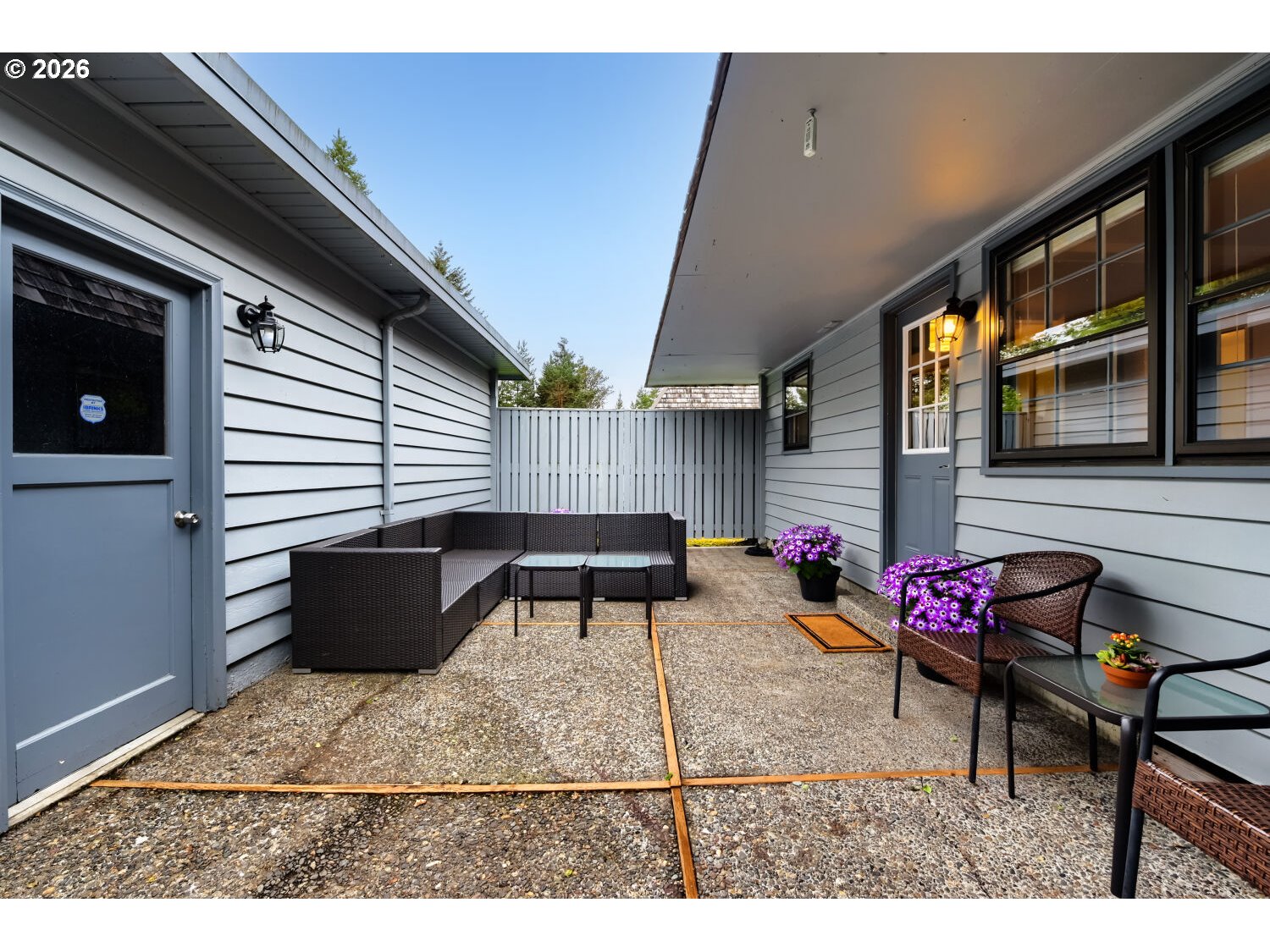 Move-in ready and beautifully maintained, this rare single-level corner unit on the ground floor offers comfort, convenience, and an exceptional location. The home features 2 bedrooms and 2 bathrooms, with expansive windows that fill the space with natural light and showcase peaceful views of the community park and pool. The gorgeous primary suite opens to the garden and has two closets. Interior highlights include Brazilian cherry hardwood floors, stainless steel appliances, central air conditioning, and recent upgrades such as new carpet, new dishwasher, fresh interior paint, and updated door hardware. The thoughtful layout extends to a private, fenced, covered patio—perfect for pets, barbecuing, and al fresco dining. Additional amenities include an oversized & insulated two-car garage, driveway parking, and ample guest parking throughout the community. This unit is just minutes from shopping and dining, and conveniently located near Rock Creek Golf Course, with an easy commute to Intel and Nike. The low HOA fee covers access to the pool, exterior maintenance, and front yard landscaping. Previously owner-occupied by a non-smoker with no pets, this home reflects pride of ownership throughout.