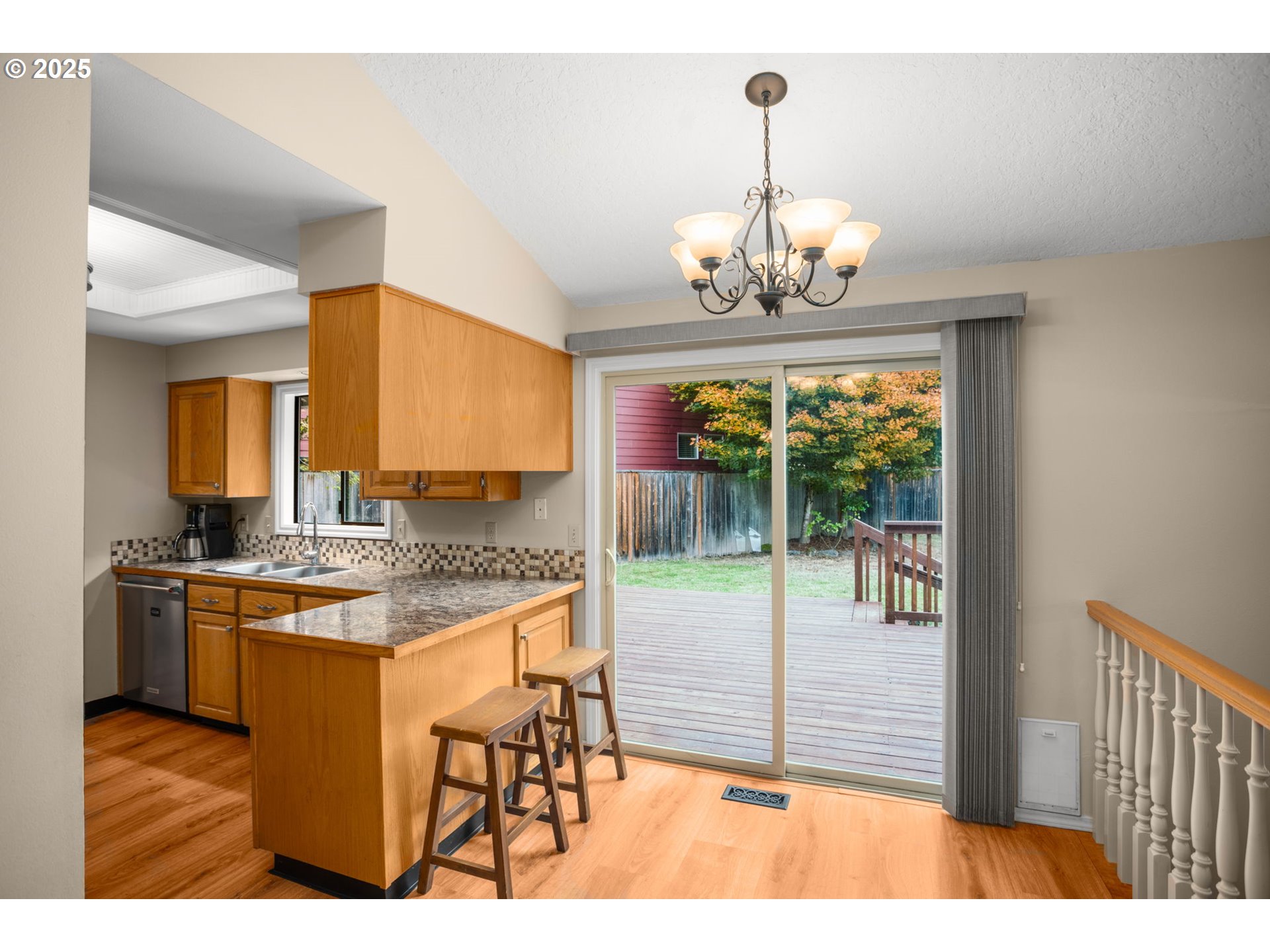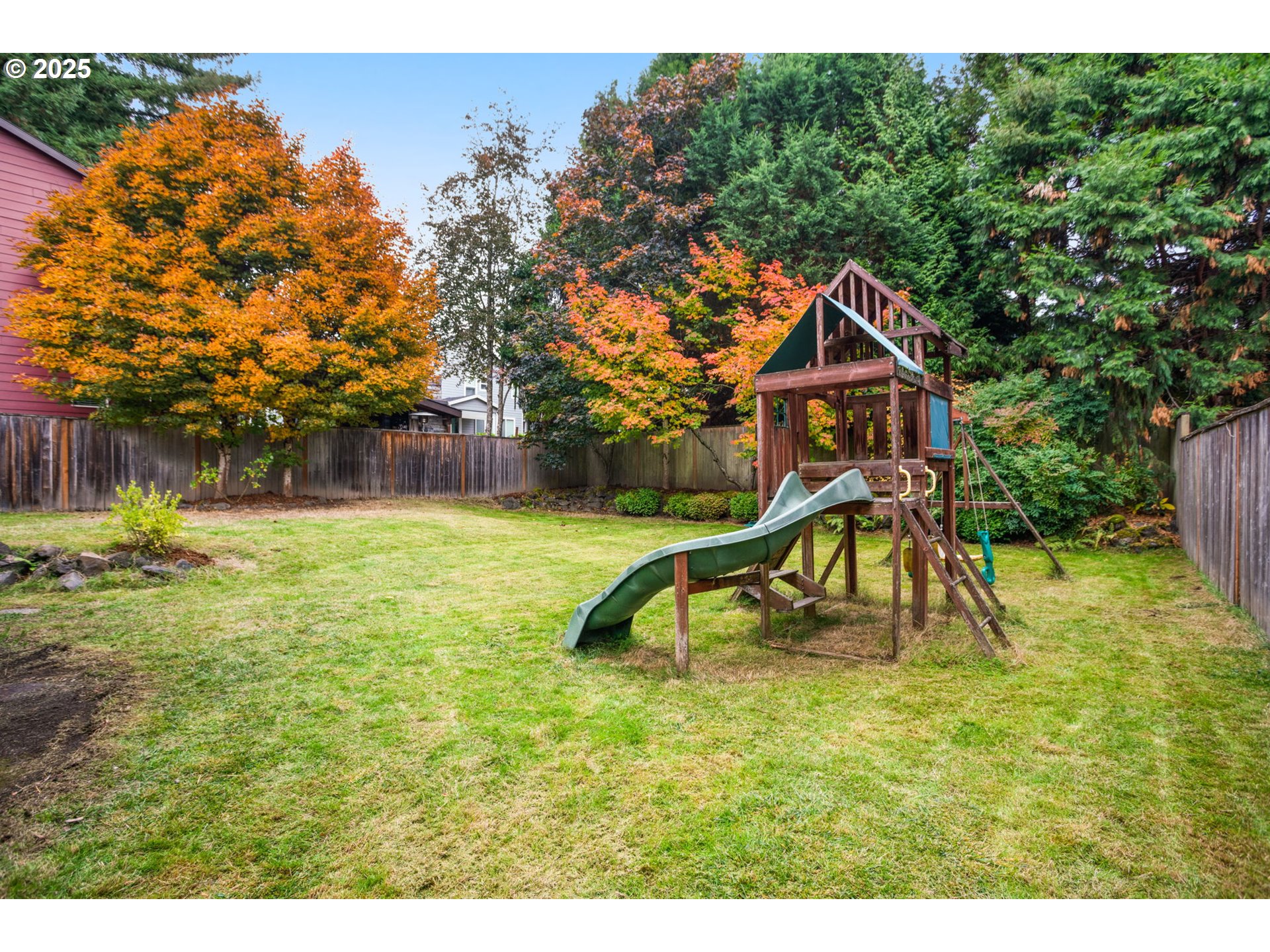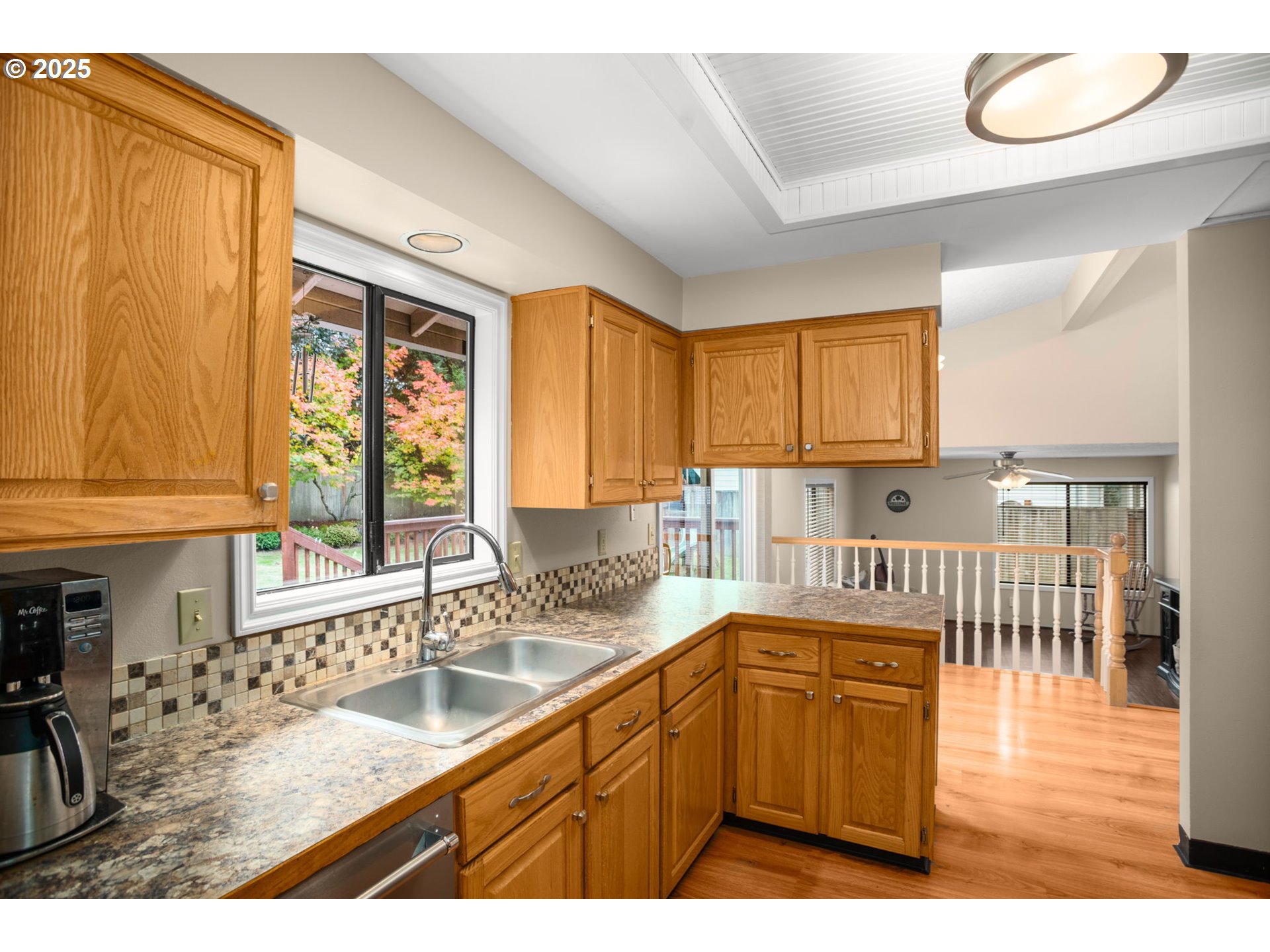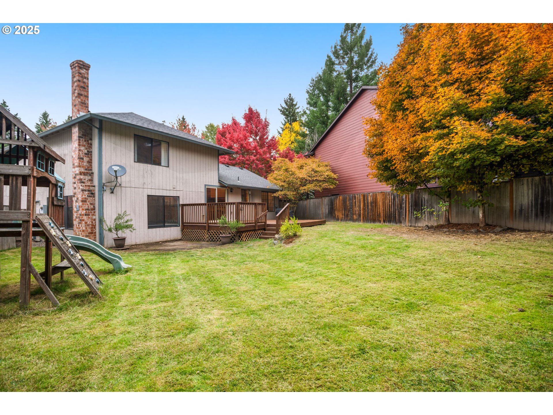 Spacious 2-level home tucked back at the end of a quiet street with plenty of privacy! Inviting entryway with skylight, vaulted ceilings, and tons of windows throughout offering plenty of natural light and beautiful views of trees and foliage. Huge fenced backyard with newer deck, perfect for entertaining, outdoor recreation, and pets. Main level features sturdy vinyl wood floors in each room and storage beneath stairs. Kitchen features stainless-steel appliances, comes with bar counter seating and breakfast nook looking out to a cozy sunken family room. Upstairs, generous sized bedrooms including the primary suite with walk-in closet and attached bathroom. Interior has brand new paint along with new blinds, water heater replaced in 2021. Greenway/pond in neighborhood to enjoy nature and wildlife, also convenient to schools, parks, grocery, Nike, and Intel!