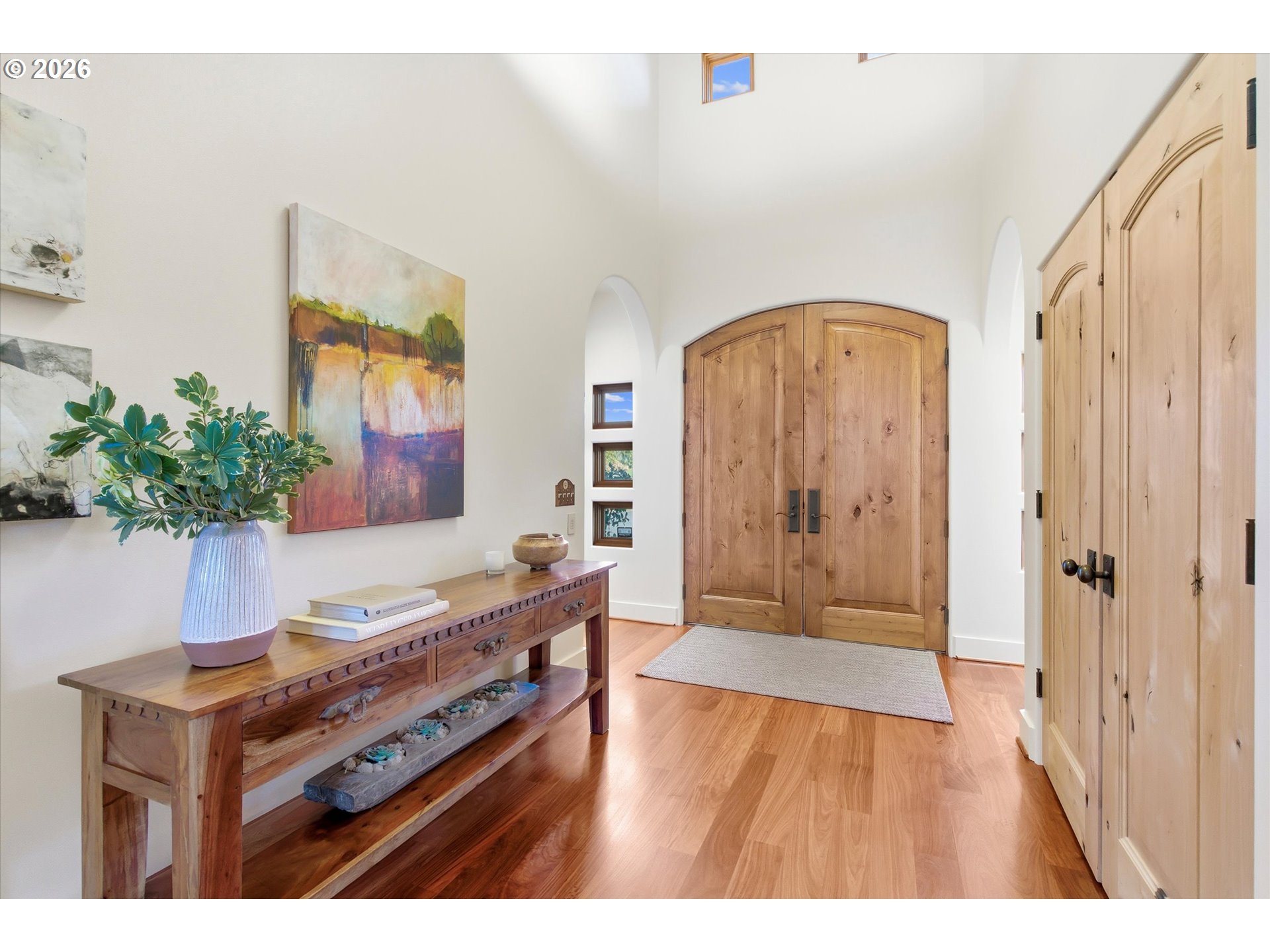 (503) 893-8874Properties of this architectural scale and land profile are rarely brought to market. Framed by a circular drive, this single level estate spans 3.33 private acres within the Groner enclave, shaped by land, privacy, and architectural intention. A grand entry reveals soaring wood clad ceilings and substantial exposed timber beams that establish immediate scale and structural presence. Expansive sightlines create volume without excess, while separated living spaces balance openness with intention. Meticulously hand selected wood detailing reflects a level of craftsmanship and timber scale rarely found today. Hardwood floors, curved archways, thick plaster walls, and wood framed windows reinforce the home’s architectural integrity. Westerly sunset views stretch across protected reserve land as indoor and outdoor living connect seamlessly through a large covered courtyard with fireplace. Adobe and stone fireplaces introduce warmth and character across the main living areas. Sub Zero, Dacor, and Miele appliances anchor a kitchen with custom cabinetry, positioned as the true heart of the home. A spacious family or bonus room includes custom built ins, a fireplace, and a generous sitting area. The primary suite is privately positioned and designed as its own retreat, featuring a fireplace, sitting area, private patio, spa like bath, walk in closet, and direct access to the covered outdoor living space. Grounds designed by renowned landscape architect Michael Schultz feature established landscaping, orchard trees, greenhouse, and usable acreage. A finished 1,700 sq ft creative structure with full bath includes a dedicated woodshop and art studio, offering substantial space for makers, collectors, or extended living. A separate 448 sq ft studio provides versatile space ideal for wellness, creative work, or private retreat. Private in setting, yet well connected to dining, shopping, and daily conveniences. An estate of this scale and distinction is rarely available.