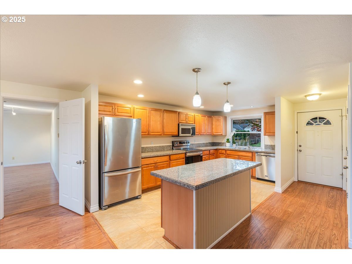 Beautiful Single-Level Home with OWNED Solar panels, gardens & private backyard feel! Welcome to this move-in-ready one-level home offering comfort, efficiency, and incredible outdoor spaces. Featuring a newer roof, owned solar panels, and all hard-surface flooring, this home is designed for easy living and long-term savings. Fresh interior paint throughout. Updated kitchen with granite countertops, extensive wood cabinetry, and stainless-steel appliances including freestanding refrigerator. Open living room with electric fireplace, and dining room perfect for entertaining. Separate family room. Spacious primary suite with bath, sliding door to deck & backyard. 2 additional bedrooms. 2 full bathrooms, both with tub/shower combos. Double-pane windows for comfort and efficiency. Laundry area in large 2-car garage with storage shelving. Out front features a seasonal, gorgeous English-style front garden bursting with color nearly year-round. Private fenced backyard with decks, lawn area, and garden beds, garden/tool shed for storage. This property is backing to a large open field space at the neighboring school. Energy & Solar Benefits: The solar system is tied to the PGE Meter system and produces energy credits during sunny months. Extra credits can be banked for winter use or donated to families in need — a rare, meaningful feature. You will find the perfect blend of comfort, efficiency & outdoor beauty in this well-maintained home, with the gift of established landscaping, the convenience of single-level living, and the benefits of modern efficiency upgrades. A unique opportunity in a peaceful, garden-like setting! HES (home energy score)is a 10! [Home Energy Score = 10. HES Report at https://rpt.greenbuildingregistry.com/hes/OR10233583]