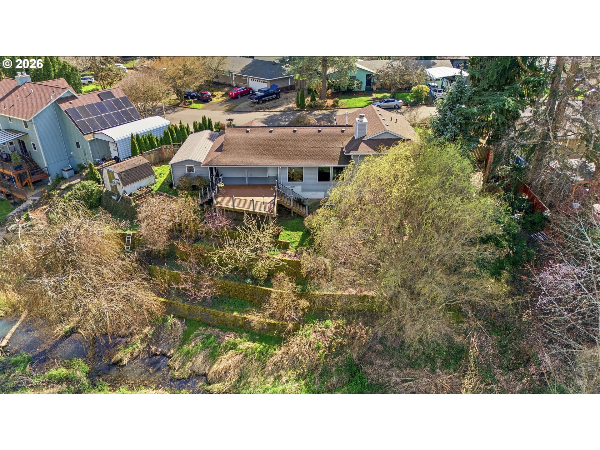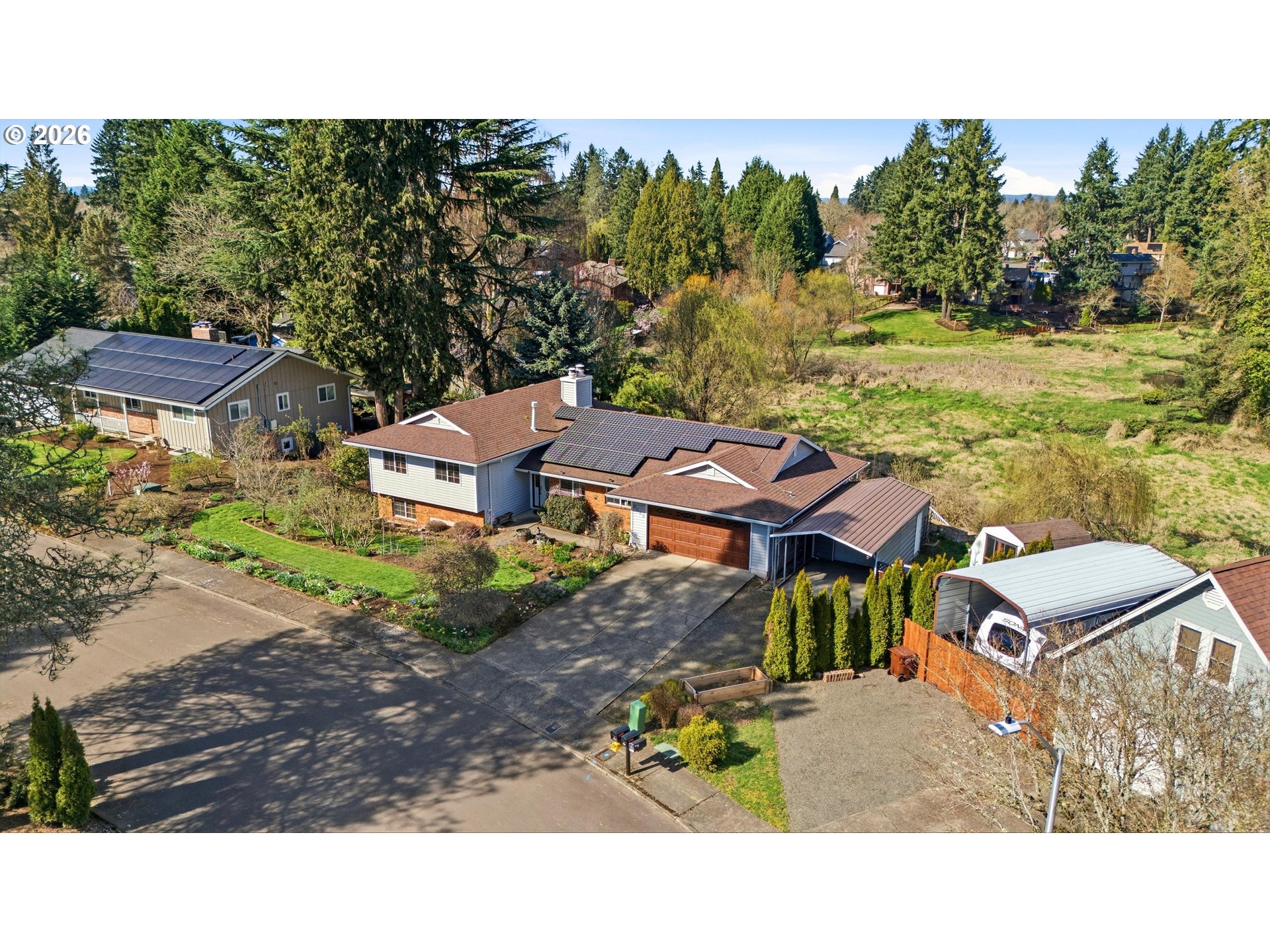 (503) 893-8874In the heart of Hillsboro, tucked into a quiet neighborhood, this home offers a rare blend of suburban convenience by front and a peaceful retreat in the back.Step inside and you’re welcomed by abundant natural light filling the main level through large windows, with bamboo flooring and a cozy fireplace creating a warm, inviting space. Through the living room and then dining area, step out to the covered patio and expansive Trex deck, your ideal place to start mornings with coffee, watch birds drift through the wetlands, and occasionally catch a glimpse of herons, ducks, geese and "Barlett" the Beaver along the creek. With space for all, in the evenings gather with friends/family or simply unwind while taking in the quiet beauty that surrounds you.The backyard, terraced and thoughtfully designed by the seller, overlooks the protected wetlands and Turner creek with ever-changing scenery. Garden beds, established fruit trees including plum, pear, apple, apricot, and fig, along with grapes, raspberries, and lilac, create a space perfect for gardening, hobbies, and enjoying the outdoors. Back inside, the kitchen features tile flooring, stainless steel appliances, a double oven, pantry and a cozy nook perfect for small meals or evening tea.Upstairs you'll find the primary suite offering double closets and attached bath and down the hallway, two additional rooms and a full bath. The lower level provides added flexibility with a 4th bedroom, laundry room, full bath and spacious family room with a wood-burning fireplace and direct access to the backyard.Additional features include solar panels for energy efficiency, distinctive Tiffany lighting, unique hand-painted switch plates, a garden shed, extra deep garage and an aluminum carport with attached workshop for projects or storage.Located 1 mile from Hillsboro Medical Center and less than 5 miles from Intel, this home offers a unique opportunity to enjoy nature and creativity, without sacrificing location convenience. [Home Energy Score = 8. HES Report at https://rpt.greenbuildingregistry.com/hes/OR10245915]