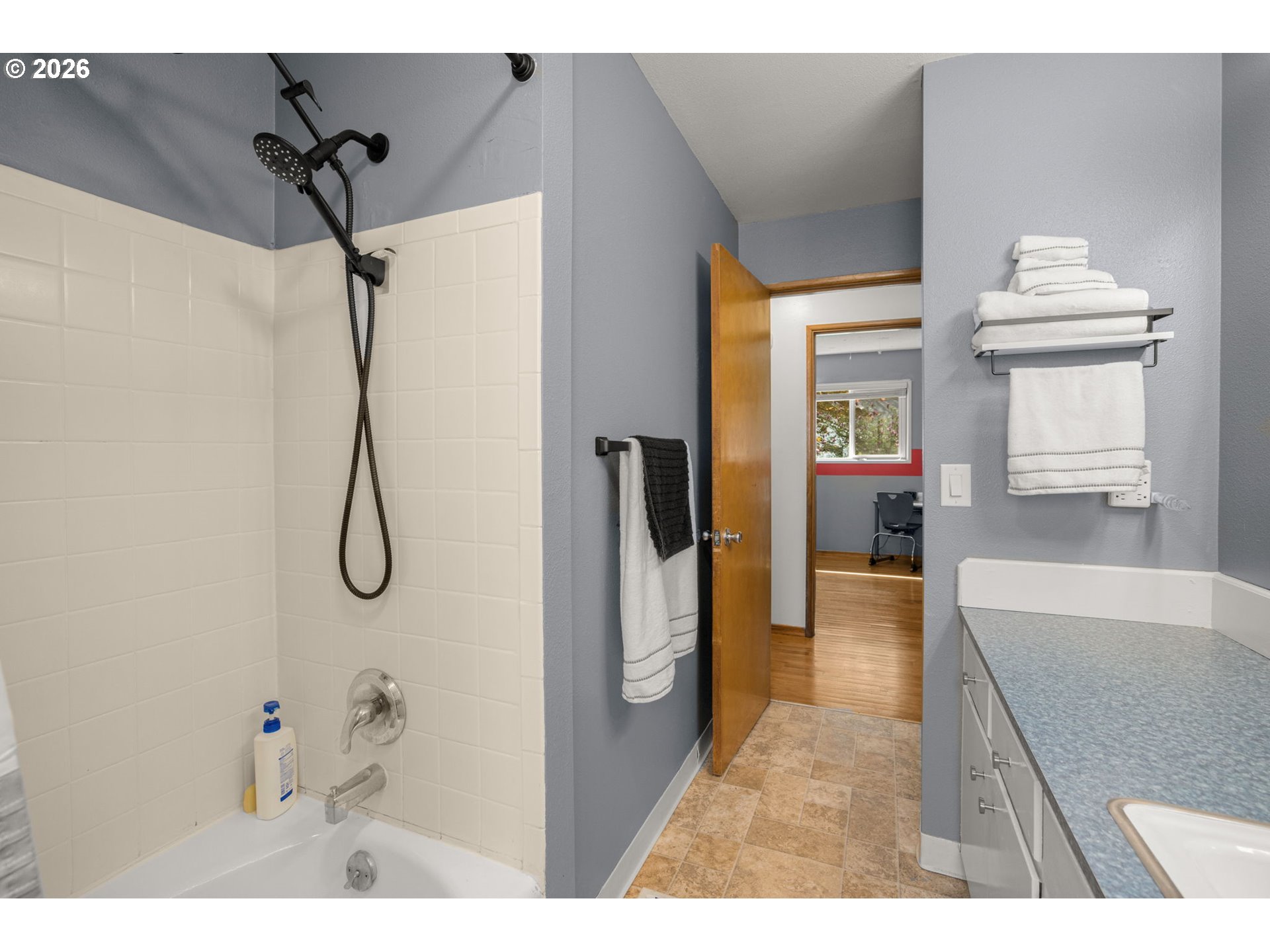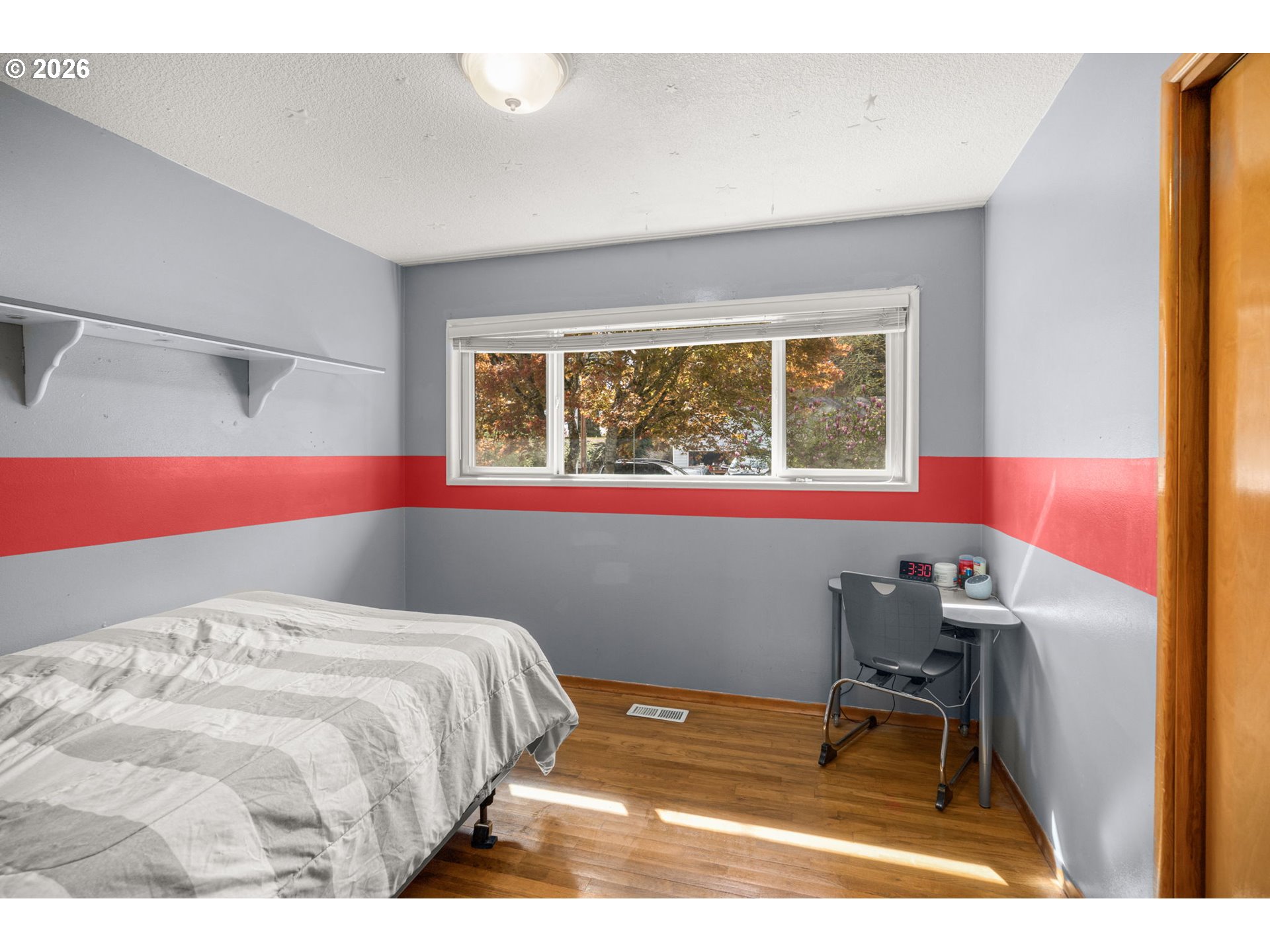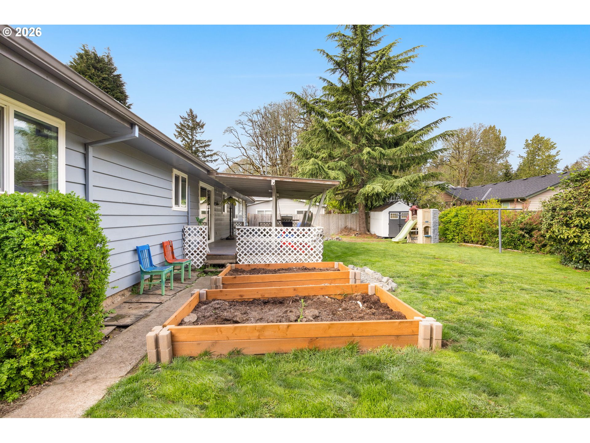 Opportunity to own a detached home on a spacious lot tucked on a quiet, dead end street. Original hardwood floors run through the living room, dining room, hallway, and three bedrooms, adding warmth and character. The light-filled living room features a large picture window and a classic wood-burning brick fireplace. Sliding doors open to a covered deck overlooking the large, level backyard, fully fenced with raised garden beds and a new storage shed, ideal for outdoor living and gardening.The kitchen offers an adjacent eating area, while the laundry/mud room provides additional exterior access, a utility sink, and built-ins for added functionality. Recent updates include newer windows, a heat pump, solar attic fan, fresh interior paint, and a new front door. Move-in ready with room to personalize and make it your own. Conveniently located near schools, restaurants, shopping, and everyday amenities.