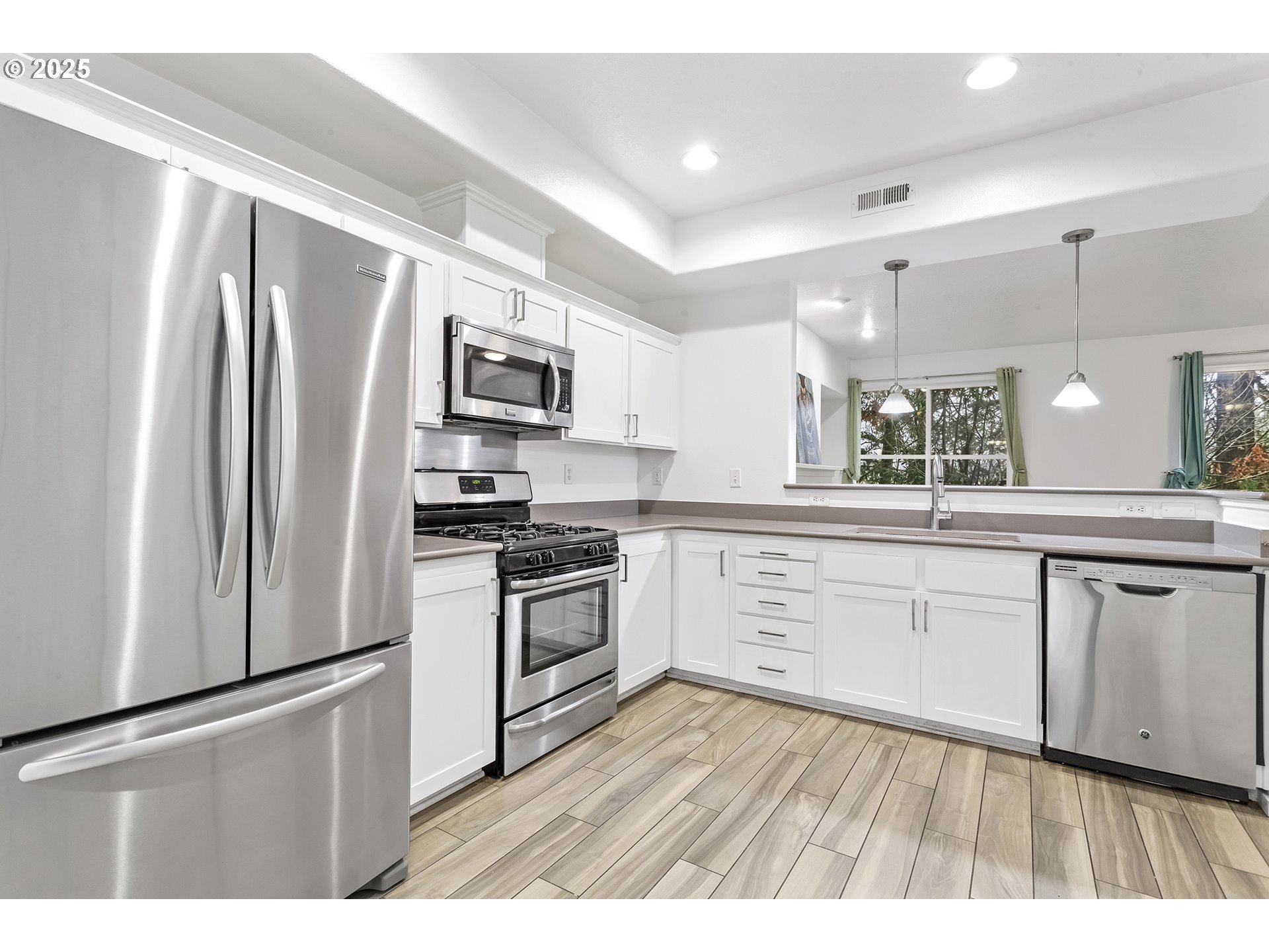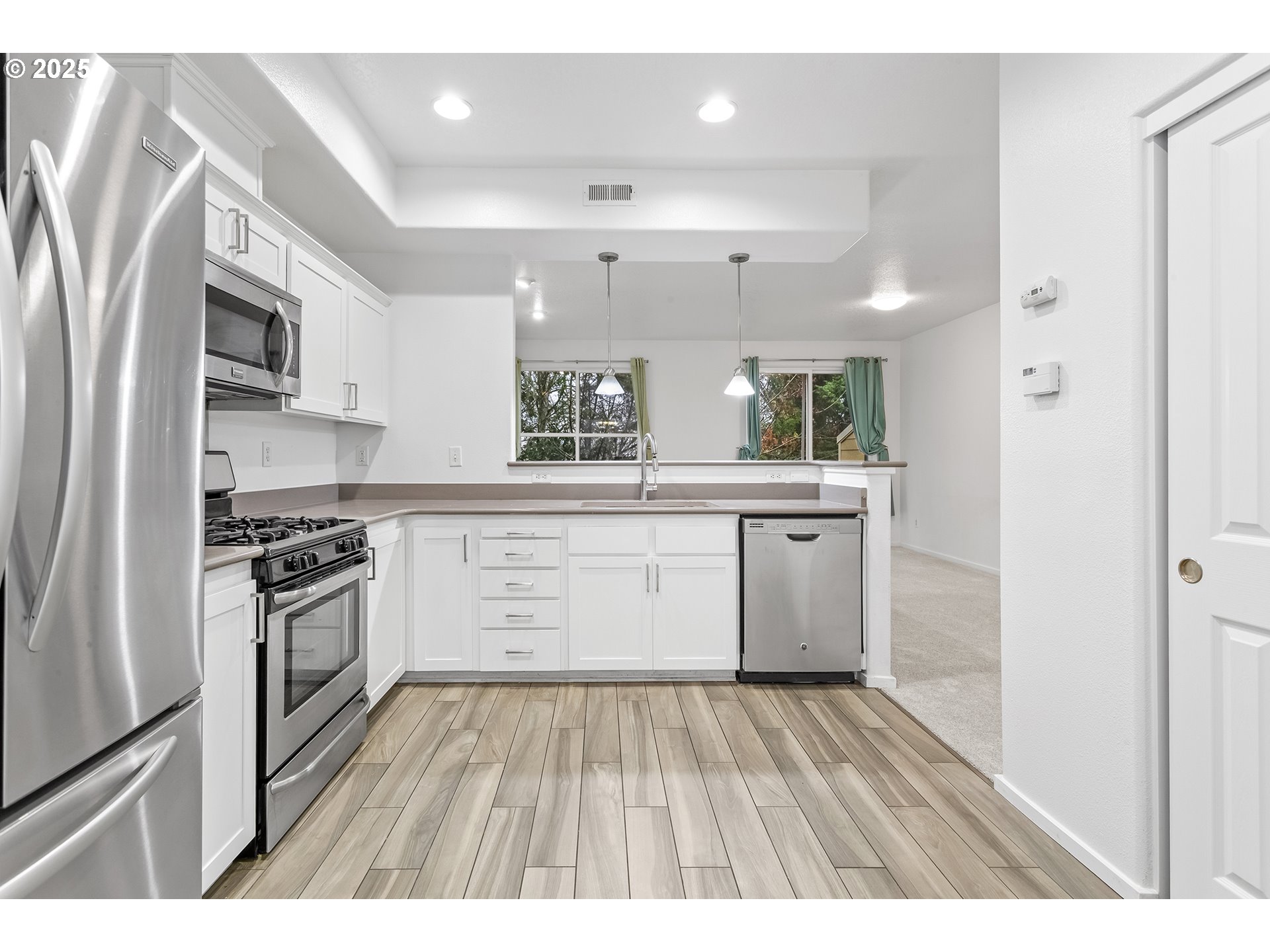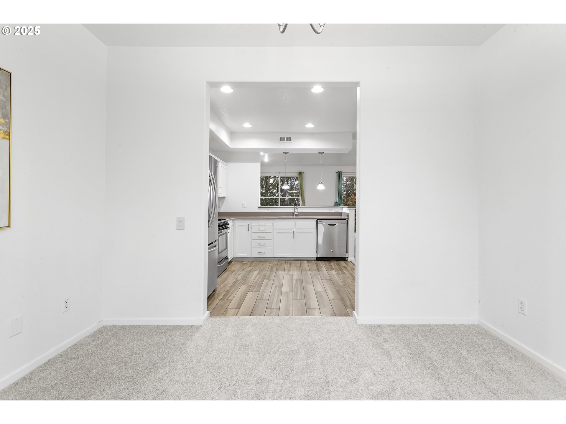 This charming townhome offers a peaceful setting with beautiful greenspace views with Rock Creek in the winter and lush greenery in the summer. Open space and designated areas to make the home your very own on the main level, Cozy fireplace in the living room with large windows and slider to the deck. The kitchen open to the living room with eating bar with a pantry. Formal dinning room. Two bedroom and 2 full bathrooms upstairs with vaulted ceilings. New carpet through out.No rent cap [Home Energy Score = 7. HES Report at https://rpt.greenbuildingregistry.com/hes/OR10242847]