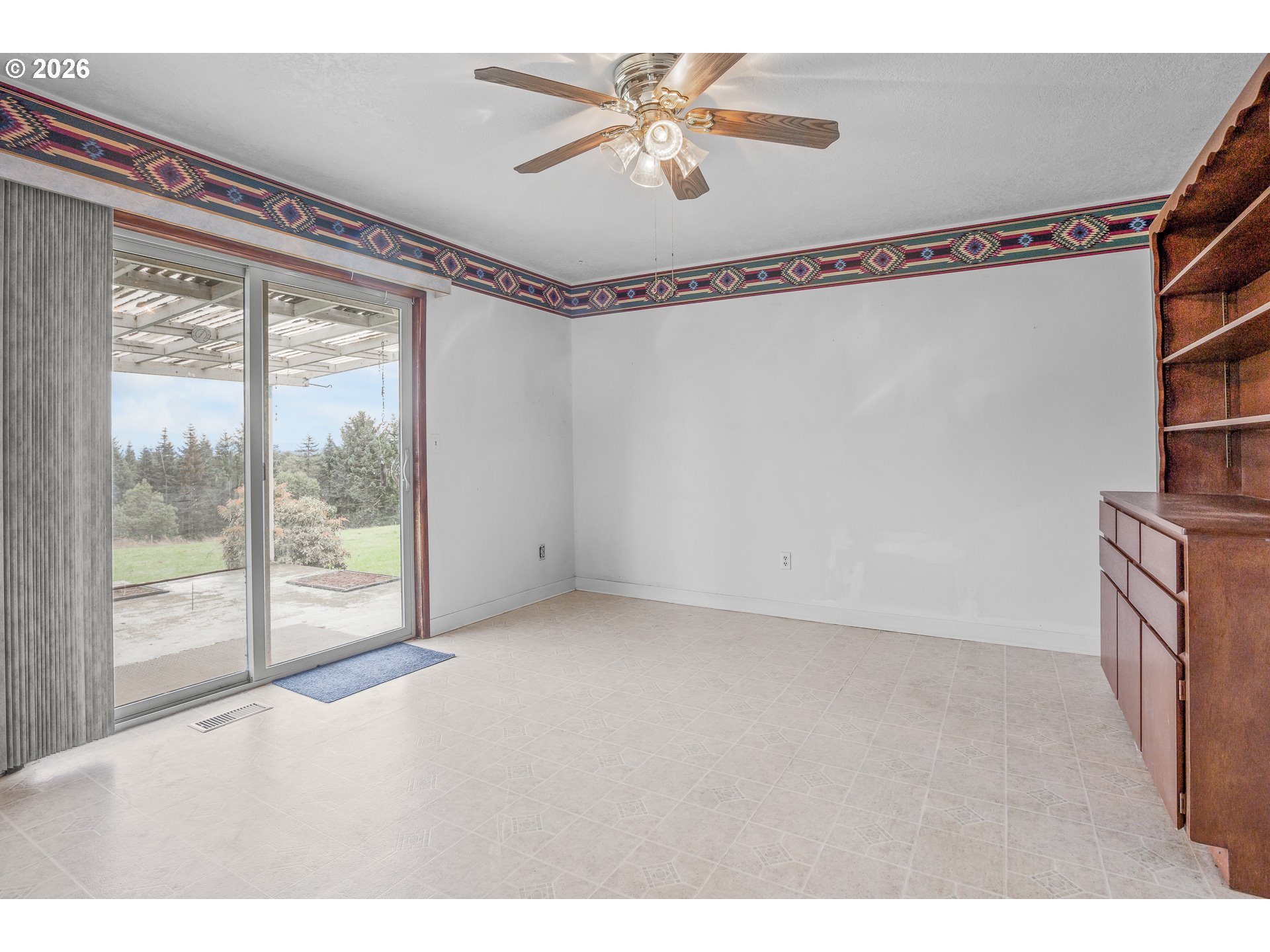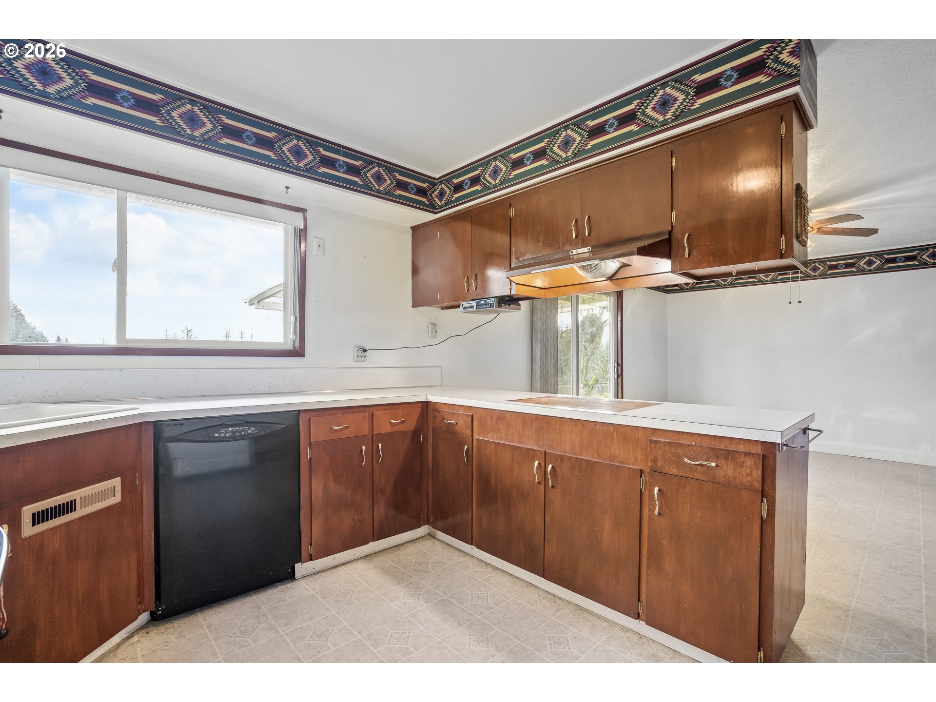 One-level country living on prime mountain-view acreage just minutes from town with four-car garage parking and a shop/barn with stalls. Inside: Welcoming living room with brick hearth and pellet stove opens to a kitchen/dining combo space with a covered back patio, perfect for outdoor entertaining with a scenic backdrop. The kitchen is peninsula-style with stainless oven/range and black dishwasher. Still plumbed for drop-in range, if preferred. Forced-air heat and double-pane vinyl windows assure your comfort in any season. Attached garage space combined comprises 1,056 square feet. Convert one garage to add 500 sf additional living space for a rainy day play room, home gym or family room-- so much potential -- or retain it to park all your toys and extra vehicles. Bedroom floors are walnut. The house is well away from the road and backs to a former Christmas Tree farm, making it both private and peaceful, and the terrain is level enough for horses and livestock or extensive gardens. This is your chance to own Sherwood acreage affordably!