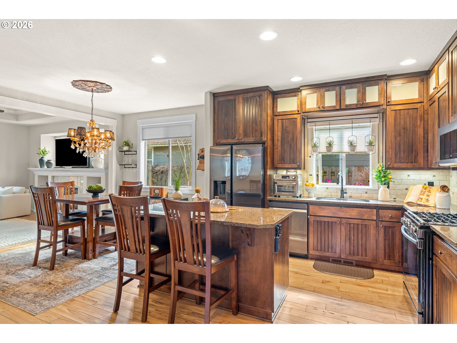 Custom luxury Craftsman with a main-level primary suite in a quiet, private setting. Beautiful hardwood floors, travertine, wainscoting, crown molding, and high ceilings create a light-filled space that’s perfect for both everyday living and entertaining.The kitchen features custom cabinetry, under-cabinet lighting, granite countertops, all-new Samsung appliances, and an island with eat-in bar seating. The living room is warm and inviting, with a coved ceiling, built-in shelving, and a stunning fireplace finished with Italian marble. French doors lead to the private main-level primary suite with built-ins, a coved ceiling, a fireplace, and a walk-in closet with its own laundry. The ensuite bath offers travertine floors and countertops, dual sinks, a soaking tub, and a walk-in shower.Upstairs, you'll find two bedrooms, a built-in desk nook, a full bathroom, and a second laundry room with cabinetry. The backyard is a gardener’s dream, with a paver patio and pergola surrounded by grapevines, banana, and fig trees, plus red and yellow raspberries. A side yard offers even more space for gardening. Additional features and seller upgrades totaling over $30k include a whole-house water filtration system, HRV high efficiency whole-home air filtration and HEPA system, new cabinetry and a stainless steel sink in the finished 2 car garage. Keep cool this summer with nearly new AC. Conveniently located near parks, bus lines, Nike, Intel, shopping, and easy highway access.