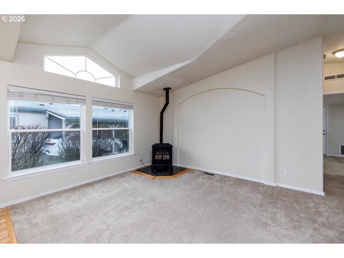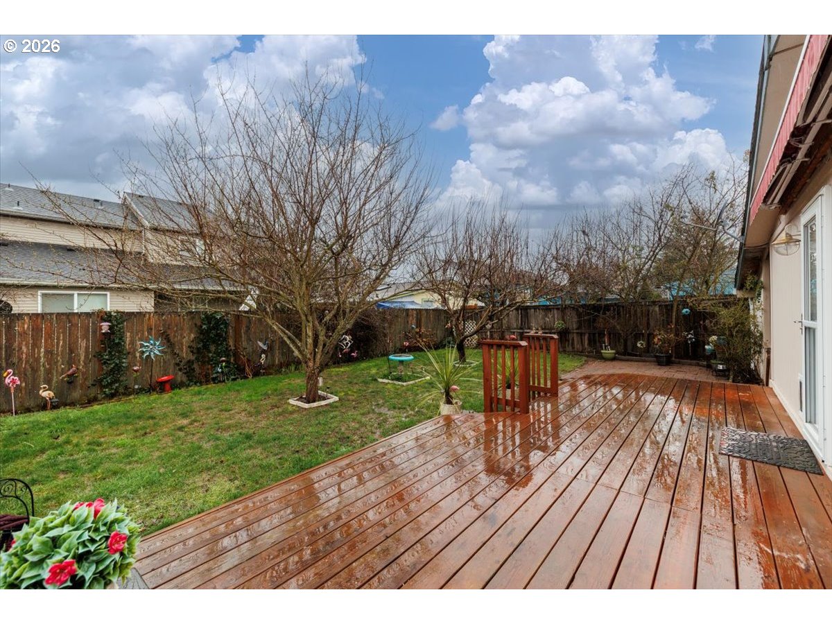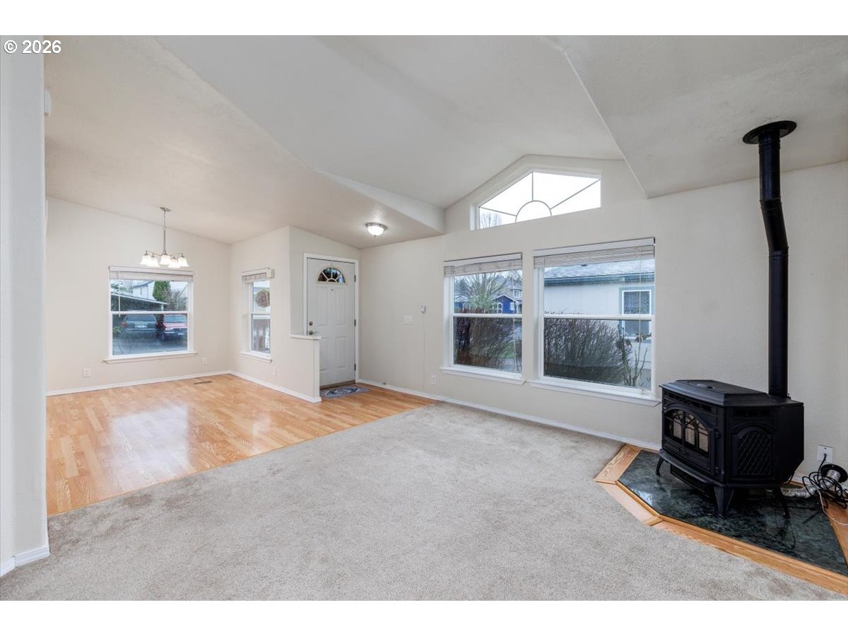 Welcome home to this charming, move-in-ready single-level gem! Thoughtfully updated with new gutters, double-pane vinyl windows, engineered hardwood floors, and a cozy pellet stove. Vaulted ceilings add an airy, open feel, while stainless steel appliances—plus fridge, washer, and dryer—make settling in easy. Step outside to a private, fenced backyard featuring a retractable awning over the deck, raised garden beds, a storage shed, and fruit trees—perfect for relaxing or entertaining. Convenient Hillsboro location close to shopping, dining, and public transportation. Open Sunday 11-1pm