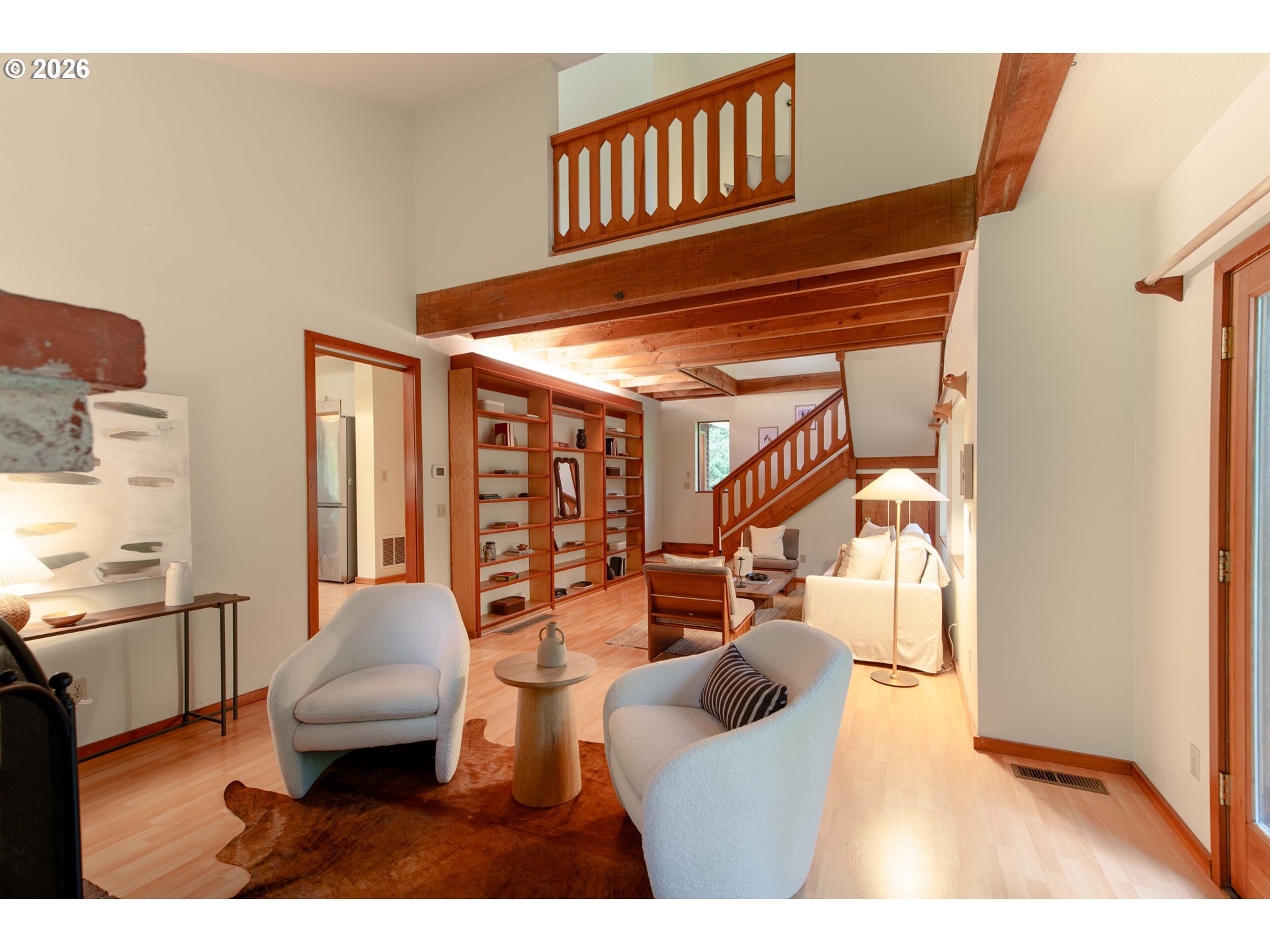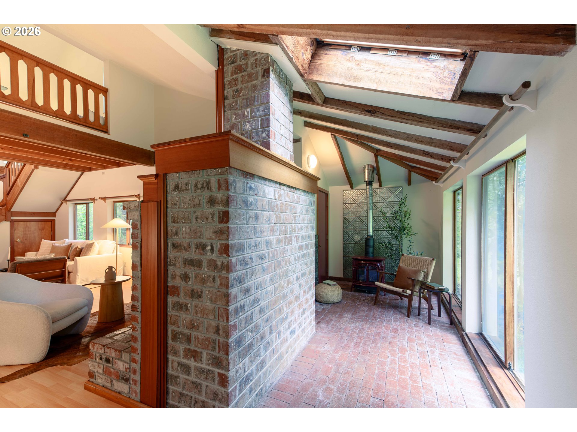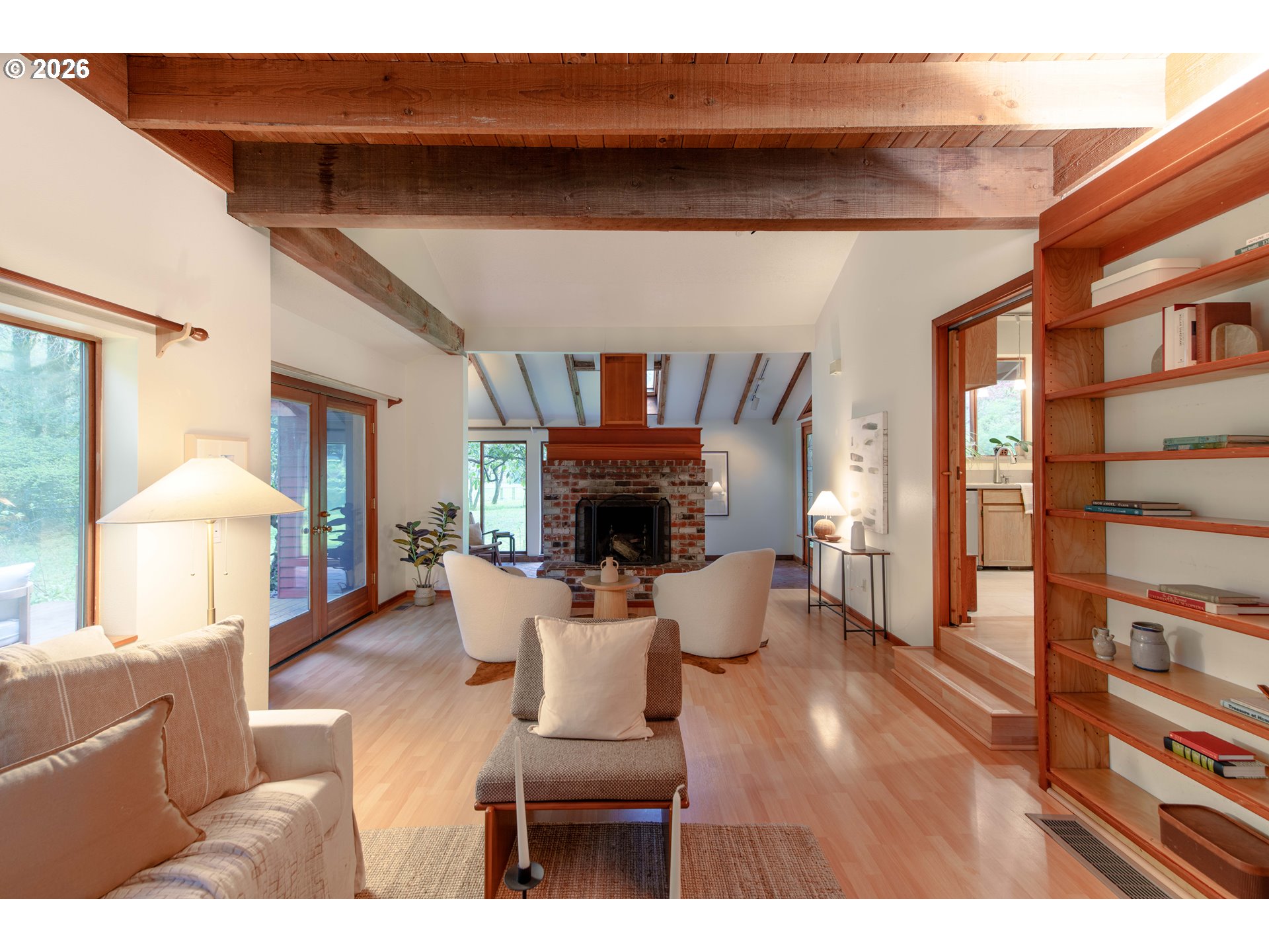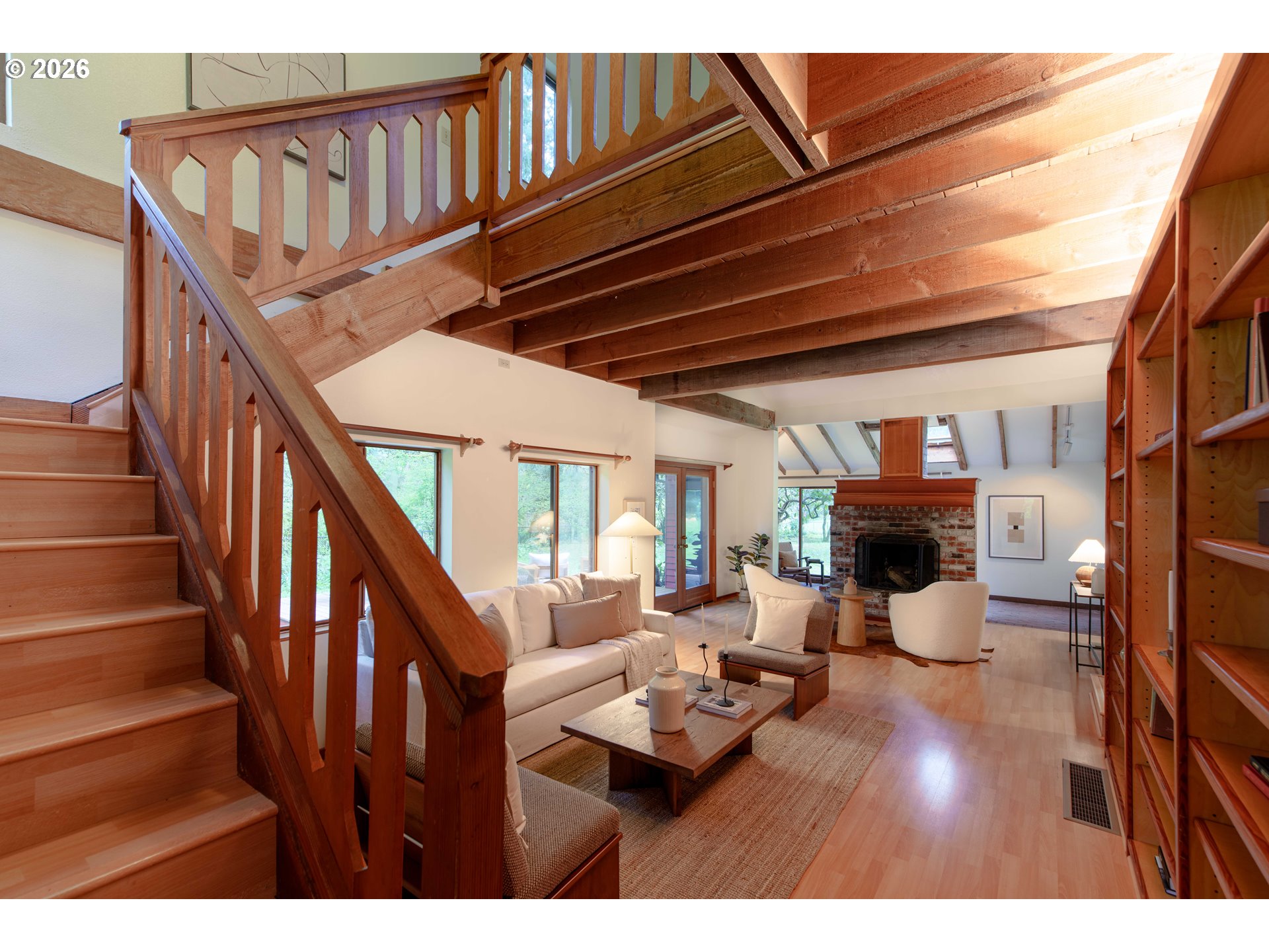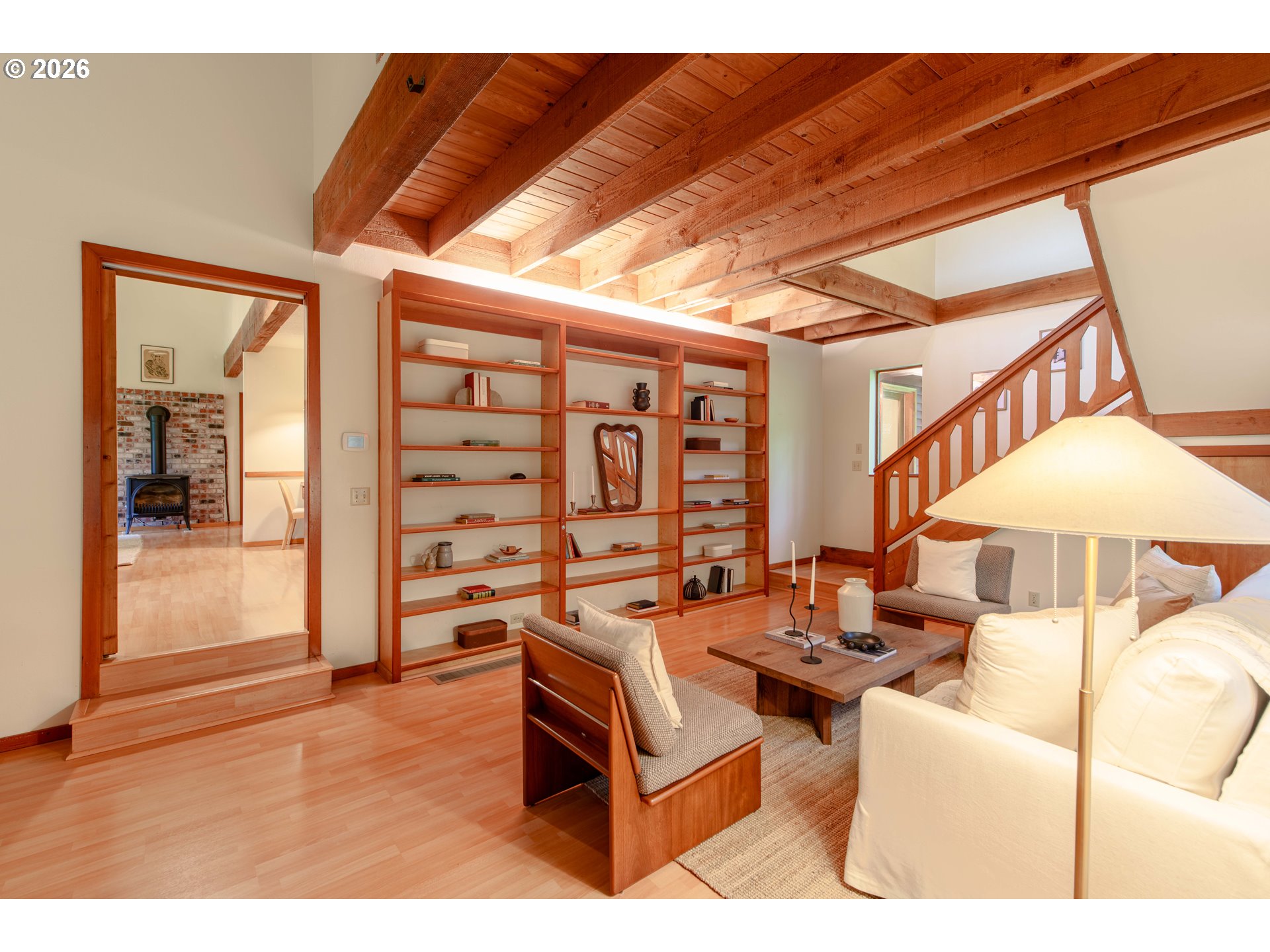 BeamedCeilings, Bookcases, BuiltinFeatures, Deck, Fireplace