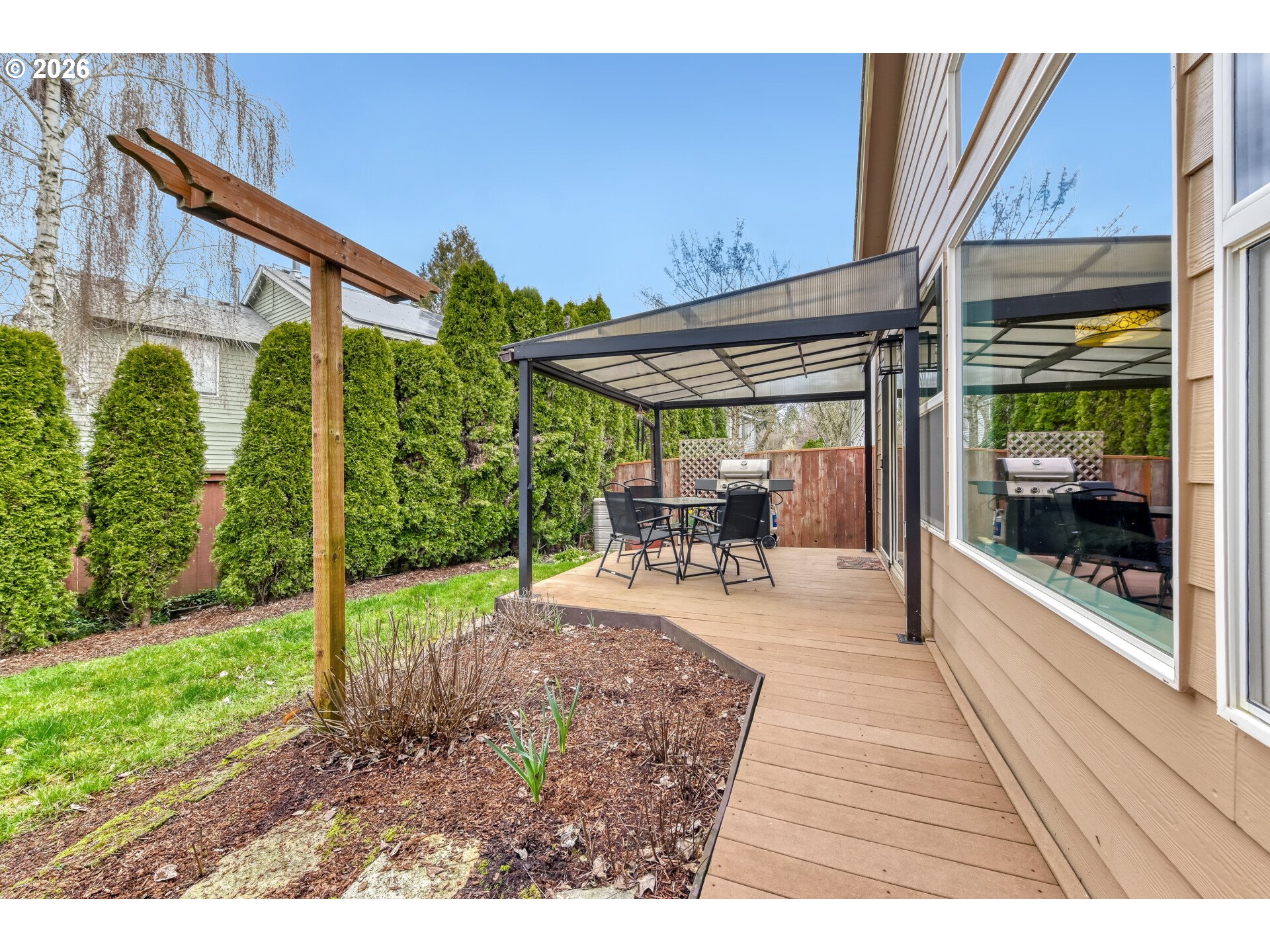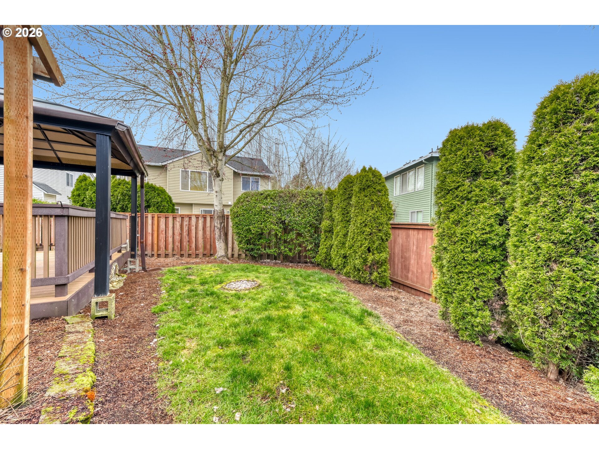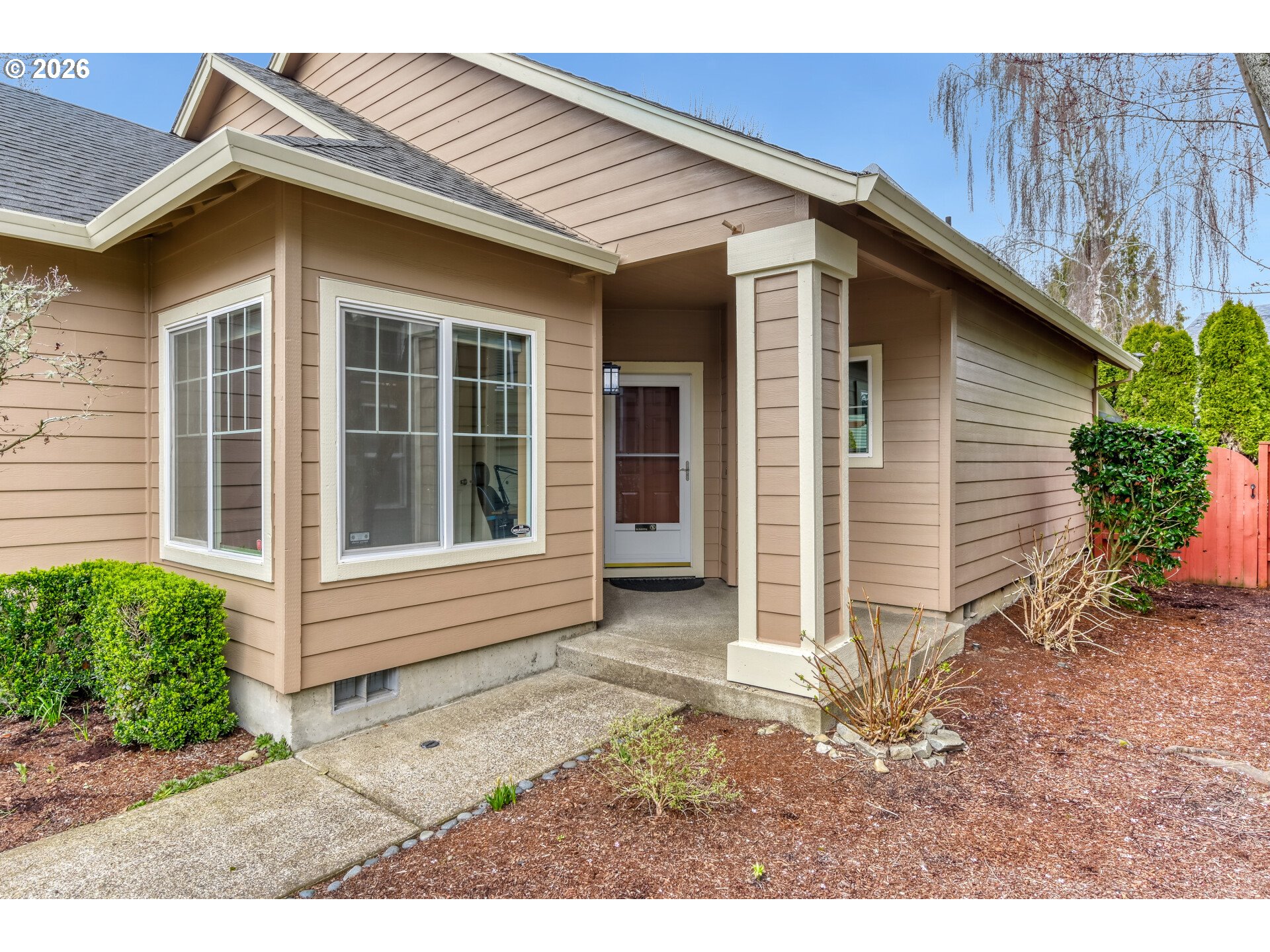 Located in the desirable Coffee Creek at Jones Farm neighborhood, this beautifully maintained home offers comfort, convenience, and easy living in a quiet community directly across from a neighborhood park. The inviting layout features vaulted ceilings in the kitchen, living room, and primary suite, along with tall ceilings throughout the rest of the home, creating an open and airy feel. The living space centers around a cozy gas fireplace and flows into the kitchen with updated stainless steel appliances. New Mohawk laminate wood flooring runs throughout the home, offering a modern look with durable scratch and stain resistance. The home includes three bedrooms and two bathrooms, including a spacious primary suite with vaulted ceilings and a walk in shower. Recent updates include a brand new water heater, and the home is equipped with a gas furnace and central air conditioning for year round comfort. The washer, dryer, and refrigerator are all included, making the home truly move in ready. Outside, enjoy an oversized Trex deck overlooking a spacious backyard with planter boxes, perfect for entertaining, relaxing, or gardening. The oversized two car garage features an epoxy floor for a clean and durable finish. A standout feature is the HOA maintained landscaping for both the front and backyard, providing beautifully kept grounds without the maintenance. With its excellent condition, thoughtful updates, and park side setting, this home offers a rare blend of comfort, convenience, and low maintenance living in the sought after Jones Farm community. [Home Energy Score = 7. HES Report at https://rpt.greenbuildingregistry.com/hes/OR10236207]