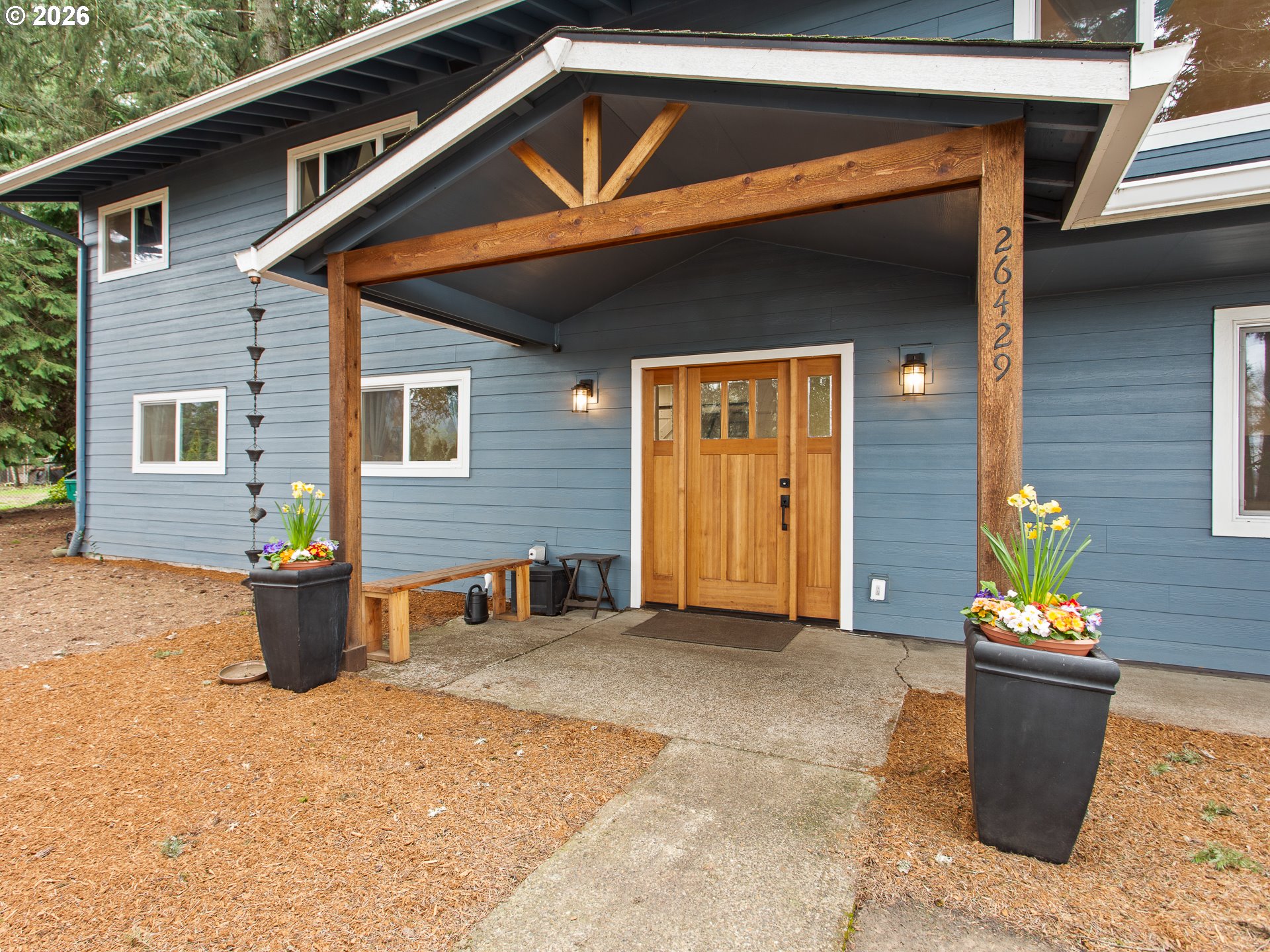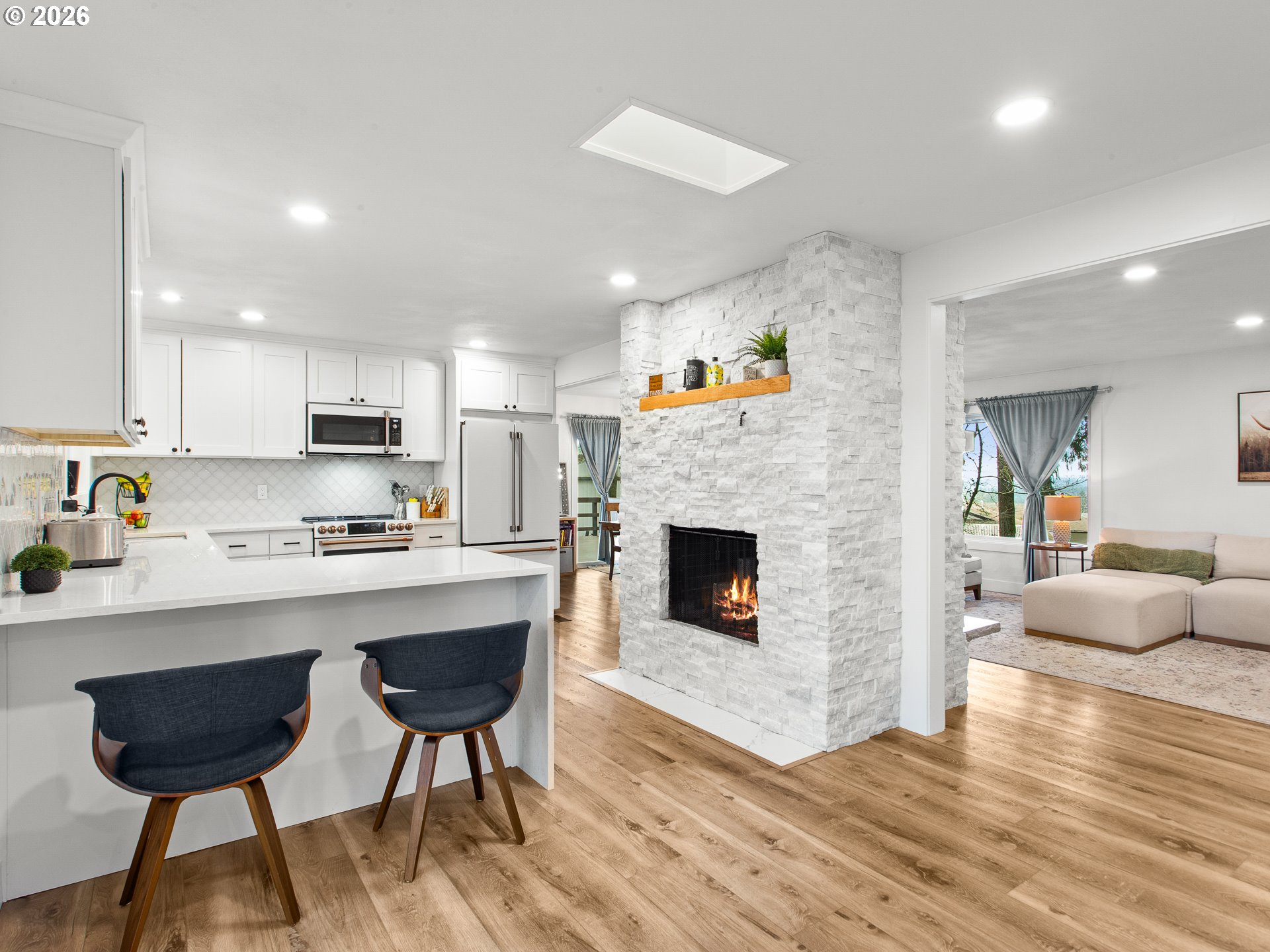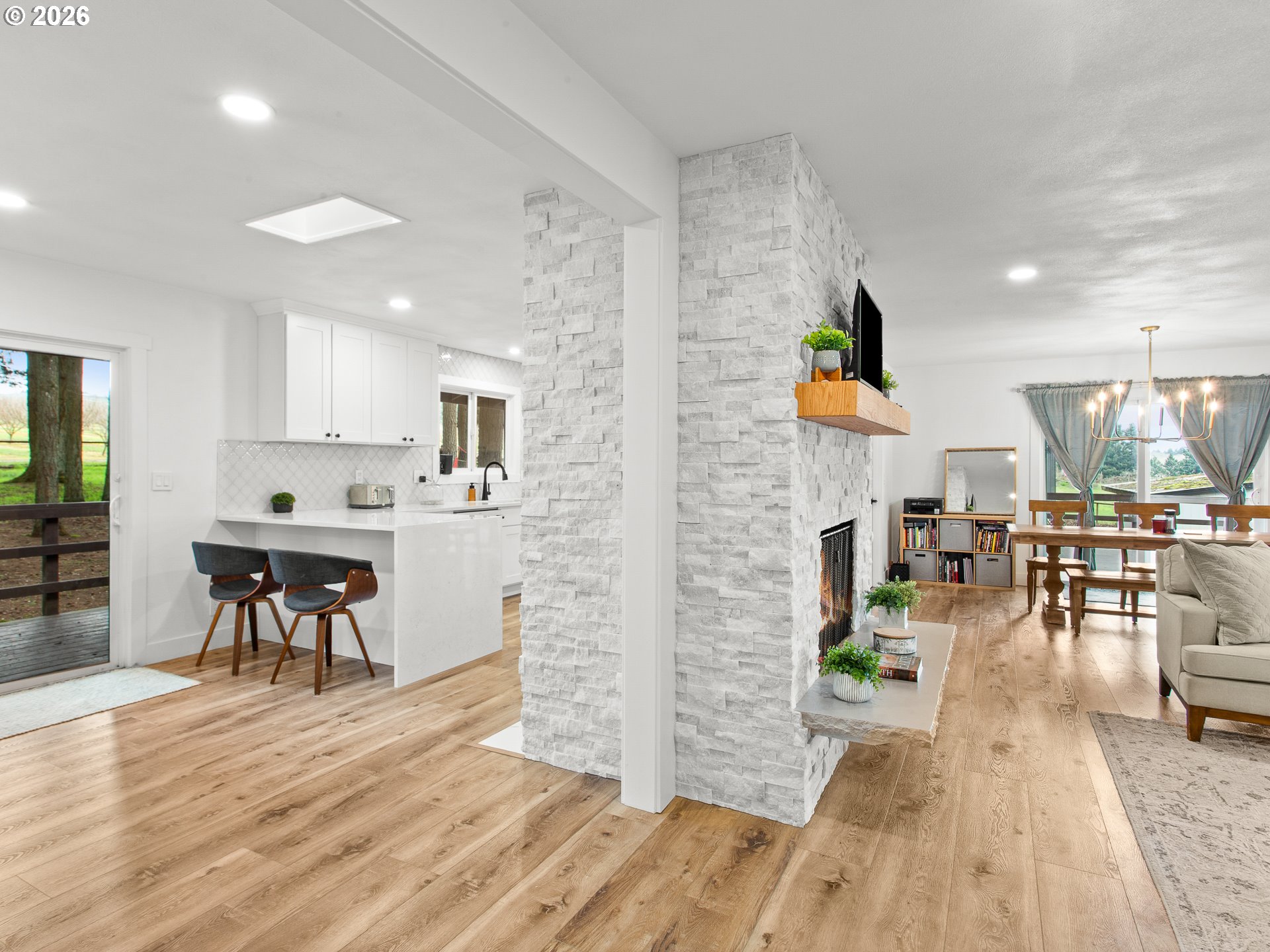 Completely renovated and fully permitted between 2020–2025, this 3,572 sq ft Sherwood residence blends modern craftsmanship with rare privacy and flexibility. Located on a quiet cul-de-sac and backing to a hazelnut orchard with views of vineyards, territory, and Mt. St. Helens—this home offers space and setting that are increasingly hard to find. The 2025 main-level renovation introduced a designer kitchen with custom 36” cabinetry, quartz waterfall counters, counter-to-ceiling backsplash, and premium GE Café appliances. Solid core doors, upgraded trim, wraparound marble fireplace detailing, luxury vinyl Cali Bamboo flooring, new LED lighting, and two fully remodeled bathrooms complete the transformation. The lower level was taken to the studs and rebuilt with new plumbing, electrical panel, insulation, and independent zoned heating. Three bedrooms, a remodeled bath, full kitchenette, laundry, and a conditioned 400 sq ft studio with private entrance create true multi-generational or income flexibility. The lower level has generated $20,000+ in short-term rental income since 2024. Exterior renovations (2022) include new dual-pane argon-filled windows and sliders, Hardiplank siding, cedar trim, vaulted front entry gable, updated doors, lighting, fencing with double swing gates, and expansive decking with sweeping territorial views. Two sets of washers and dryers, shared community well, private septic system, and shared access easement. Orchard access granted by neighboring farmer. A rare opportunity to own a comprehensively rebuilt home offering privacy, flexibility, and long-term confidence.