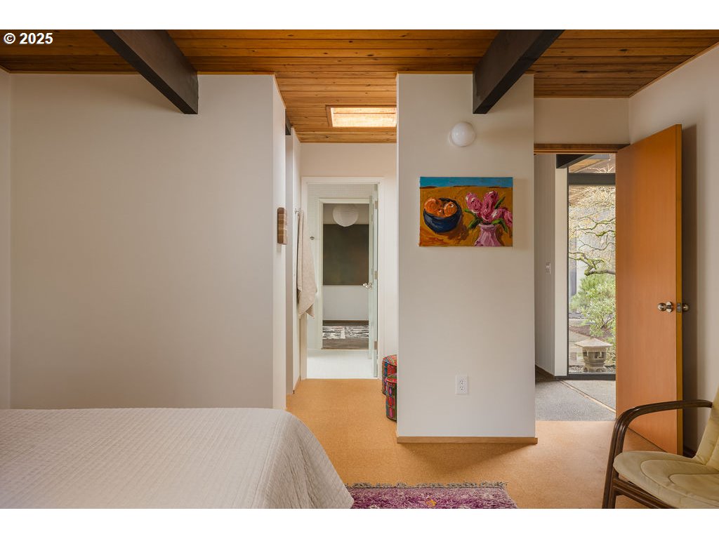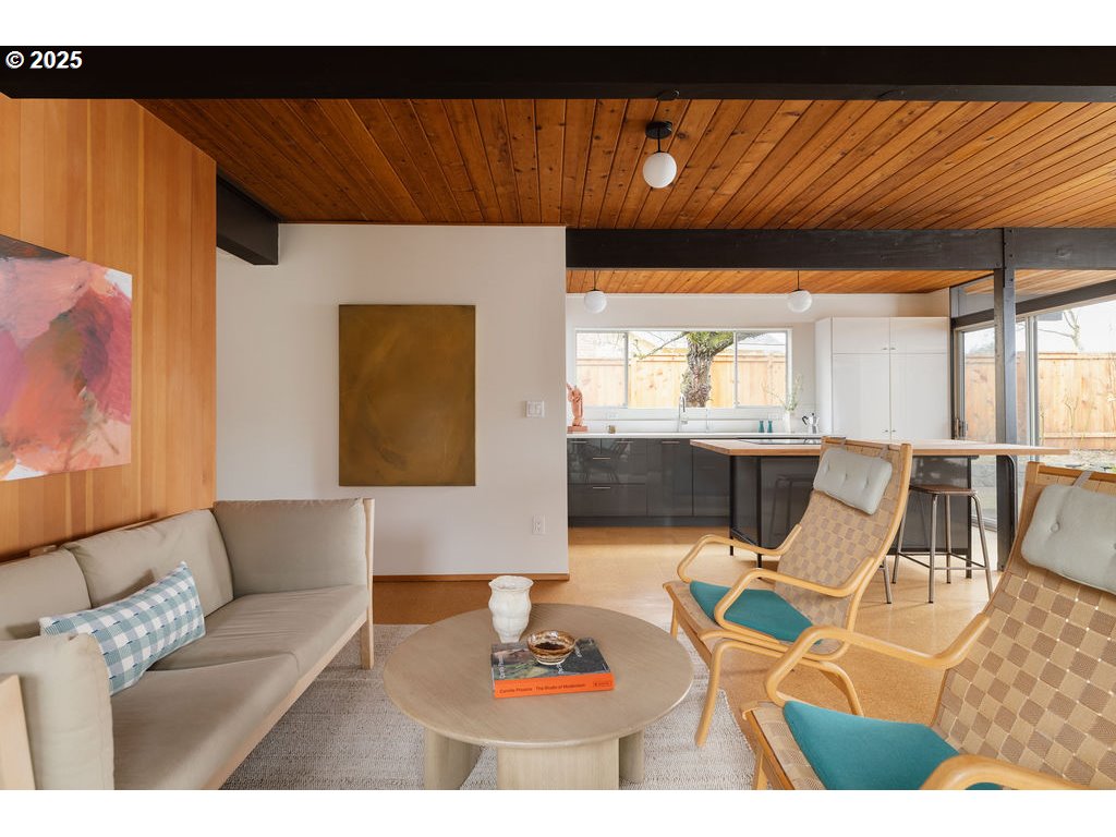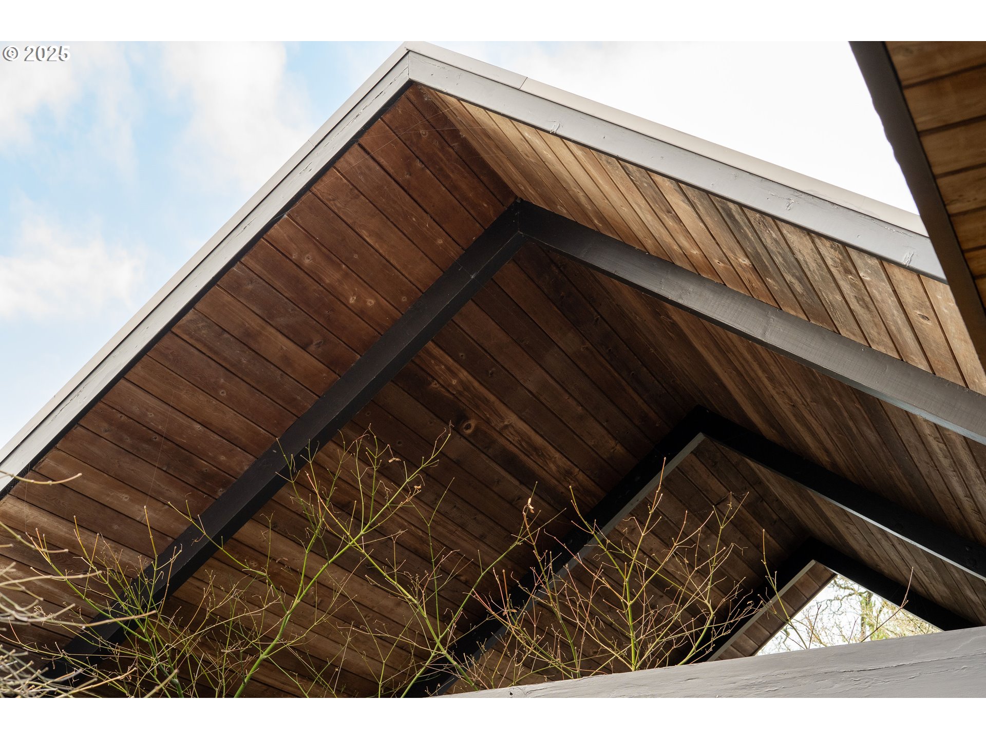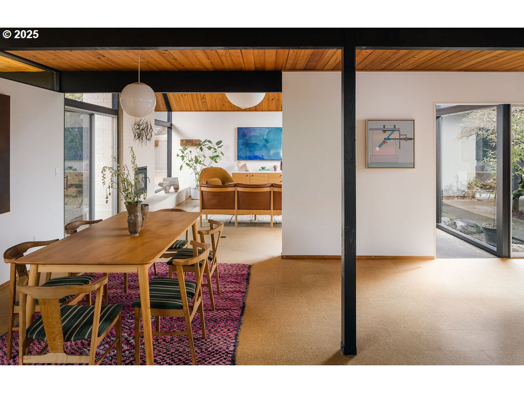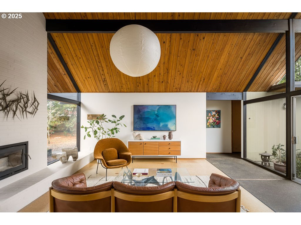 Rare Double Gable Rummer built home, model GB-276 inspired by architect A.Quincy Jones designs is one of the largest floor plans. This unique architectural mid century modern gem features a dual A-frame roofline that provides soaring tongue and groove wood vaulted ceilings and exposed beams within. Enter through the central open air natural light+plant filled atrium that seamlessly blends the indoor and outdoor spaces. The main living space features floor to ceiling windows overlooking the greenspace, a wood burning fireplace while cork flooring with radiant heating provides visual and physical warmth throughout the home. The updated kitchen has plenty of built-in storage and a cooking island overlooks the open dining and great room flex space.Two bedrooms, and open office/flex space and 1.5 baths are located on one wing of the home while the primary suite and additional bedroom/office are located on the opposite wing. The primary suite offers a freshly updated sunken Roman bath which was the original design and something Rummer homes are known for and a walk-in closet. The one-level floorplan wraps around the central atrium providing natural light to the interior spaces throughout and connecting the inhabitants with the surrounding nature.The attached double car garage + carport and a large driveway provides plenty of off street parking. Located on a very rare lot in the Historic Oak Hills neighborhood, this property backs to the greenspace on 2 sides providing plenty of privacy. Oak Hills has a recreation center, pool, tennis courts and dedicated greenspace and is close to Nike, Intel.