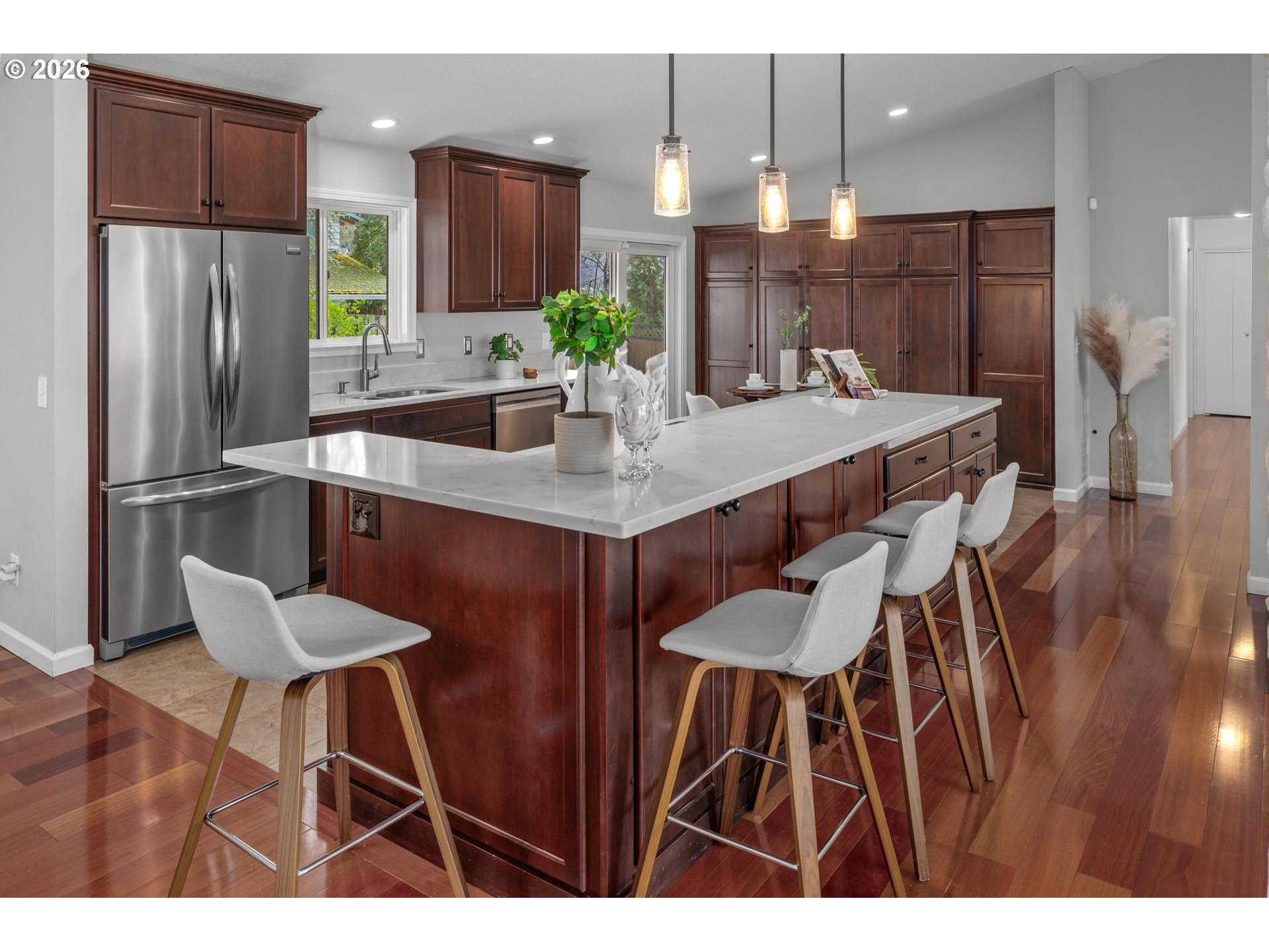 Spacious home in coveted Cedar Hills! 4 bedroom, 3 bath split level home built in 1965. Open floorplan with extensive hardwood floors on the main level. Vaulted Living Room with fireplace and filled with sunshine with West windows. Remodeled custom kitchen with stainless steel appliances, quartz countertops and huge cook island with eat bar. Abundant storage plus pantry. Eat nook plus formal dining area. Bonus area off kitchen has full wall of built-in cabinetry and would be great for a cozy sitting area, home office, television area, etc. Huge hall bathroom is completely remodeled. Primary Suite and 2 additional bedrooms on main level. 4th Bedroom downstairs is non-conforming. Family room downstairs is light-filled with fireplace and room for family and movie nights. Utility Room with sink and storage cabinetry. Oversized garage w/ storage room. Spacious corner lot is nearly 1/3 acre. Fenced yard w/ covered patio and mature landscaping. Gas heat and central air conditioning.Convenient location with easy access to Hwy 217 and Sunset Hwy. Open House Sat 1/17 & Sun 1/18 from 12-3pm
