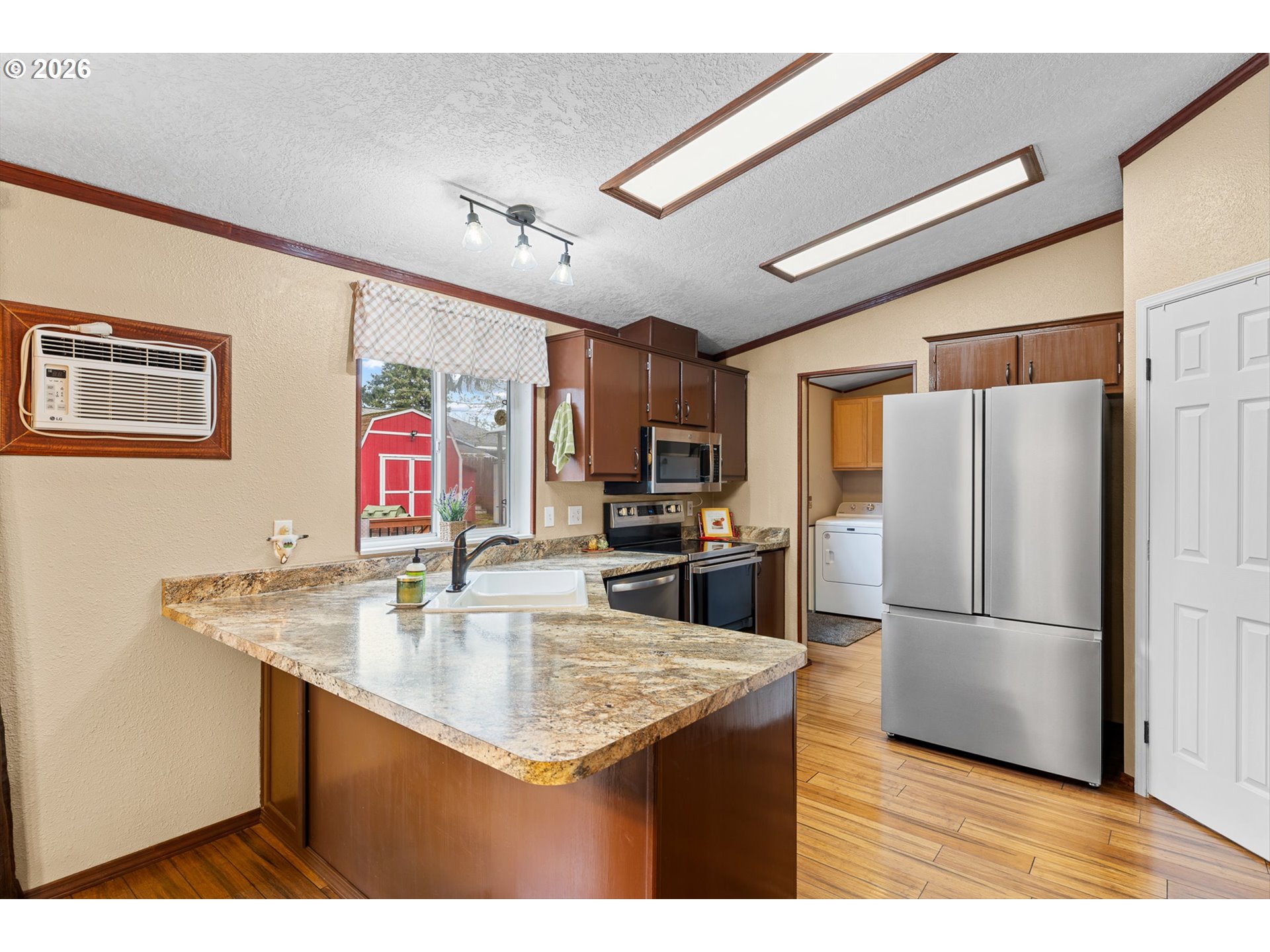 Great opportunity to own a well-maintained manufactured home on a spacious corner lot—nearly a quarter of an acre—with room to truly spread out.Inside, you’ll find a comfortable, functional layout with the primary suite on one end and two additional bedrooms and a full bath on the other. The kitchen features stainless steel appliances, a pantry for added storage, and the dining area opens to the deck and your own private oasis.The real standout is the outdoor living. Step into a fully fenced backyard designed to be enjoyed, with beautifully curated garden areas, a peaceful pond, and a fire pit perfect for gathering year-round. Whether it’s quiet mornings by the water or evenings under the stars, this space was made for relaxing and entertaining.New Roof approximately 3 years old.The property also offers RV parking, boat and toy parking, two driveways, and two hobby sheds—ideal for woodworking, projects, storage, or a private escape.A rare combination of space, versatility, and exceptional outdoor living in a great location—this one is a must-see.