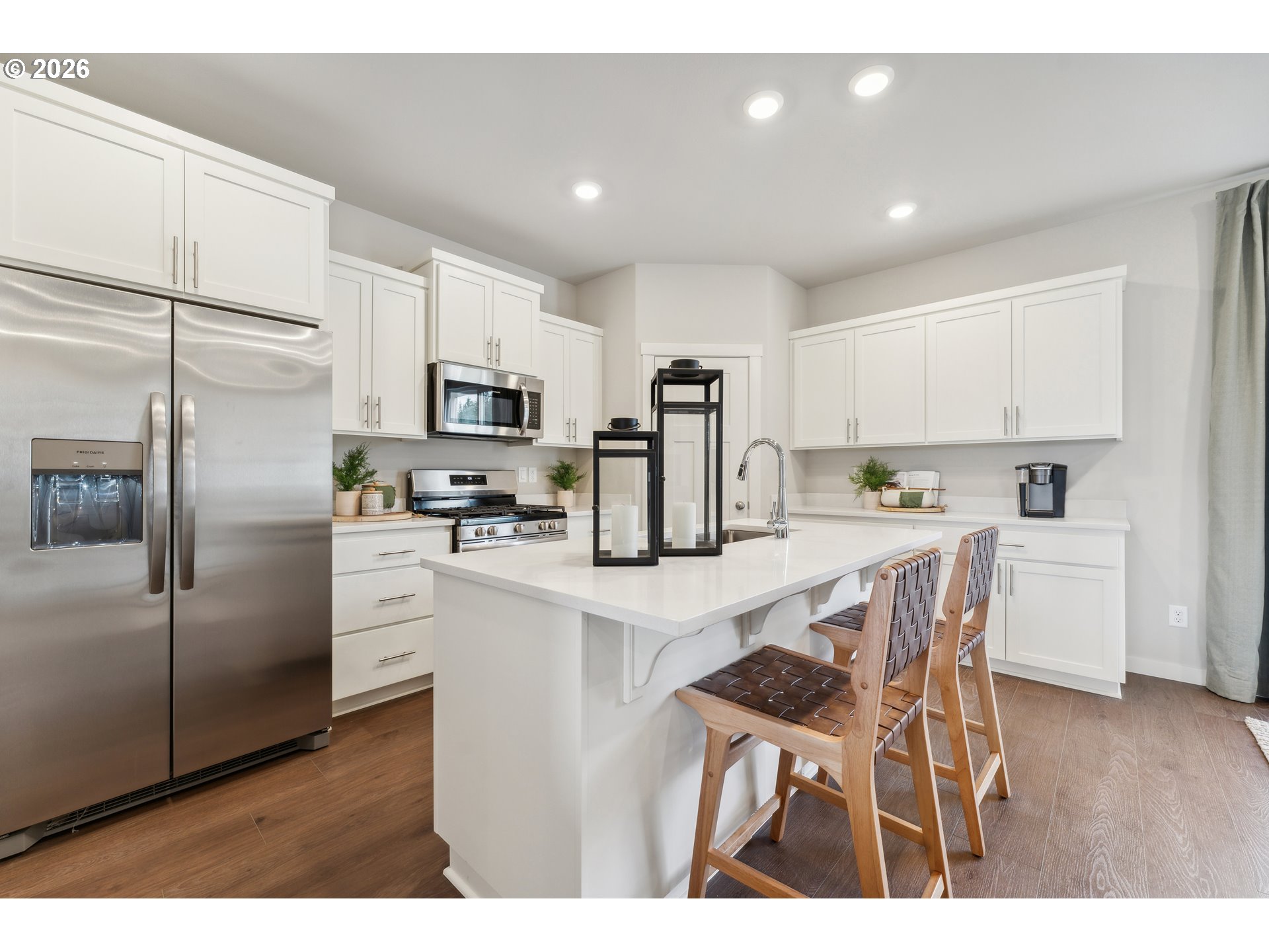 Rare opportunity to own a never-lived-in Hazel model by Lennar in the highly sought-after Parkview Terrace community in Forest Grove! This 3 bed, 2.5 bath, 2,263 sq ft three-story home offers a versatile, modern layout with designer upgrades throughout. The first level features a flexible bonus room—perfect for a media space, home office, or guest retreat. The main level showcases an open-concept great room, dining area, and kitchen with seamless access to the patio, plus a private den tucked away for added functionality.The kitchen is beautifully appointed with quartz countertops, shaker-style cabinetry with crown molding, stainless steel appliances including a gas range and refrigerator, undermount sink, Moen pull-down faucet, and LED recessed lighting.Upstairs, you’ll find all three bedrooms, including a spacious owner’s suite featuring a walk-in closet, dual sinks, quartz vanity, and a well-appointed ensuite bath.Step outside to enjoy the large, fully fenced and usable backyard with patio—ideal for entertaining, pets, or everyday outdoor living.Additional features include washer & dryer, luxury vinyl tile flooring in baths and laundry, designer exterior color scheme, and a 2-car garage (conversion to be completed prior to closing). Model home furniture is negotiable.Move-in ready, never occupied, and loaded with upgrades—this is a rare model home resale opportunity. Appointment required for showings.