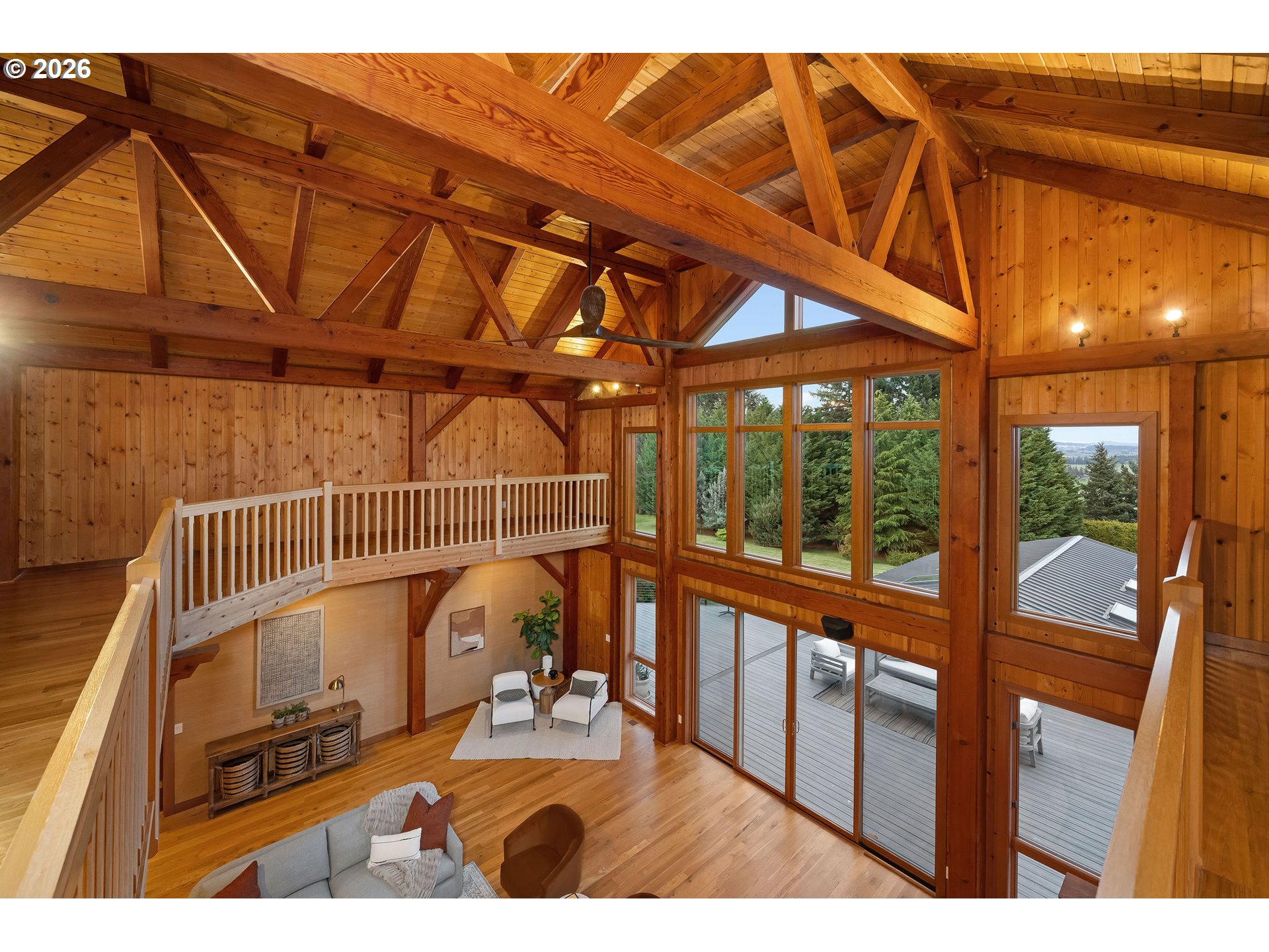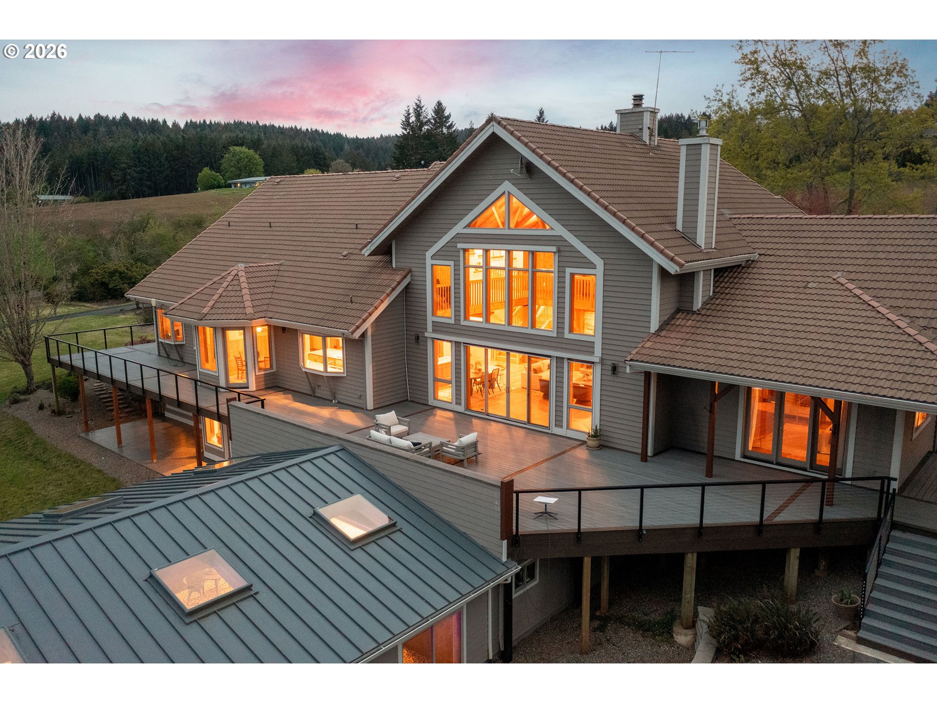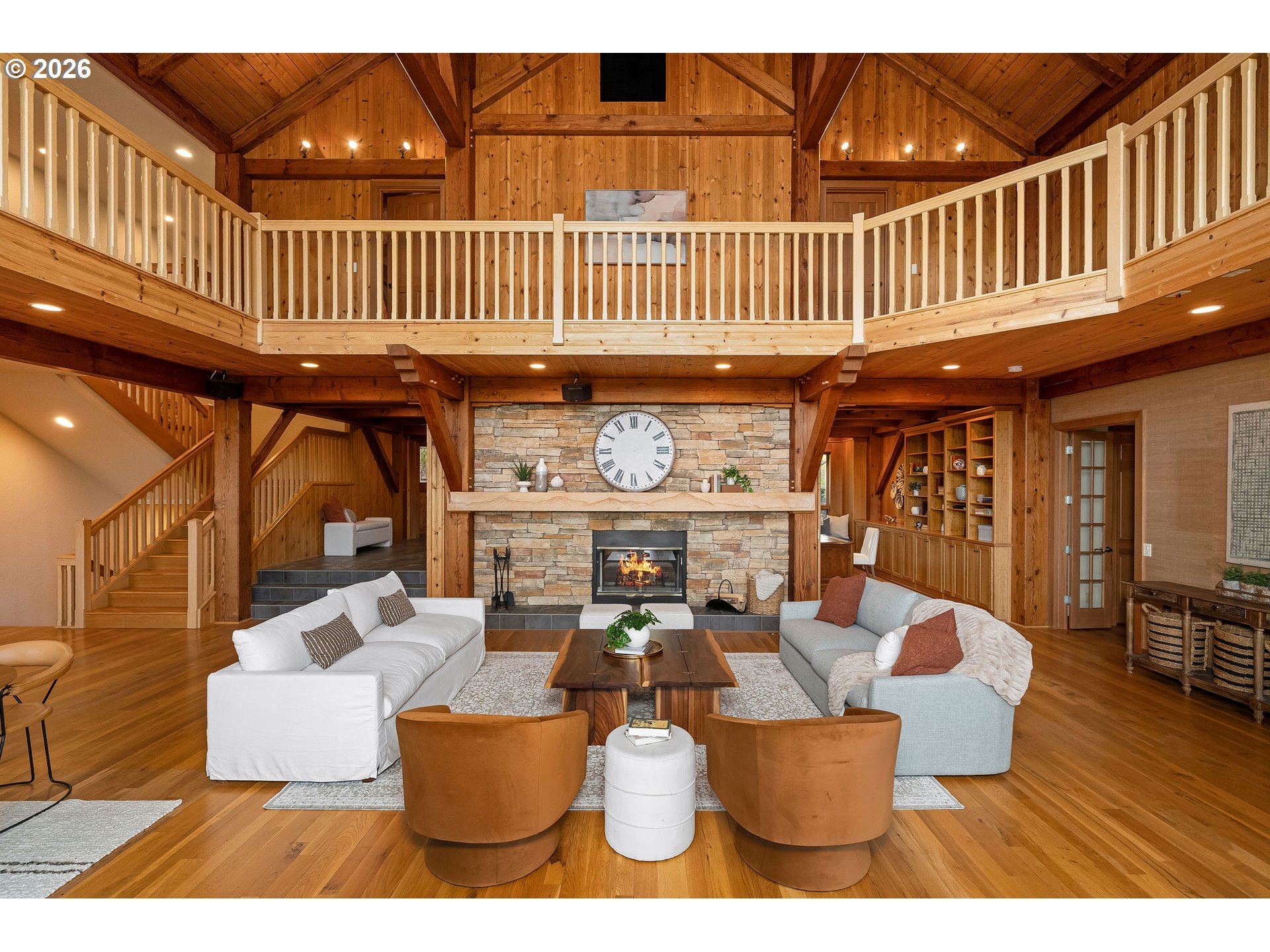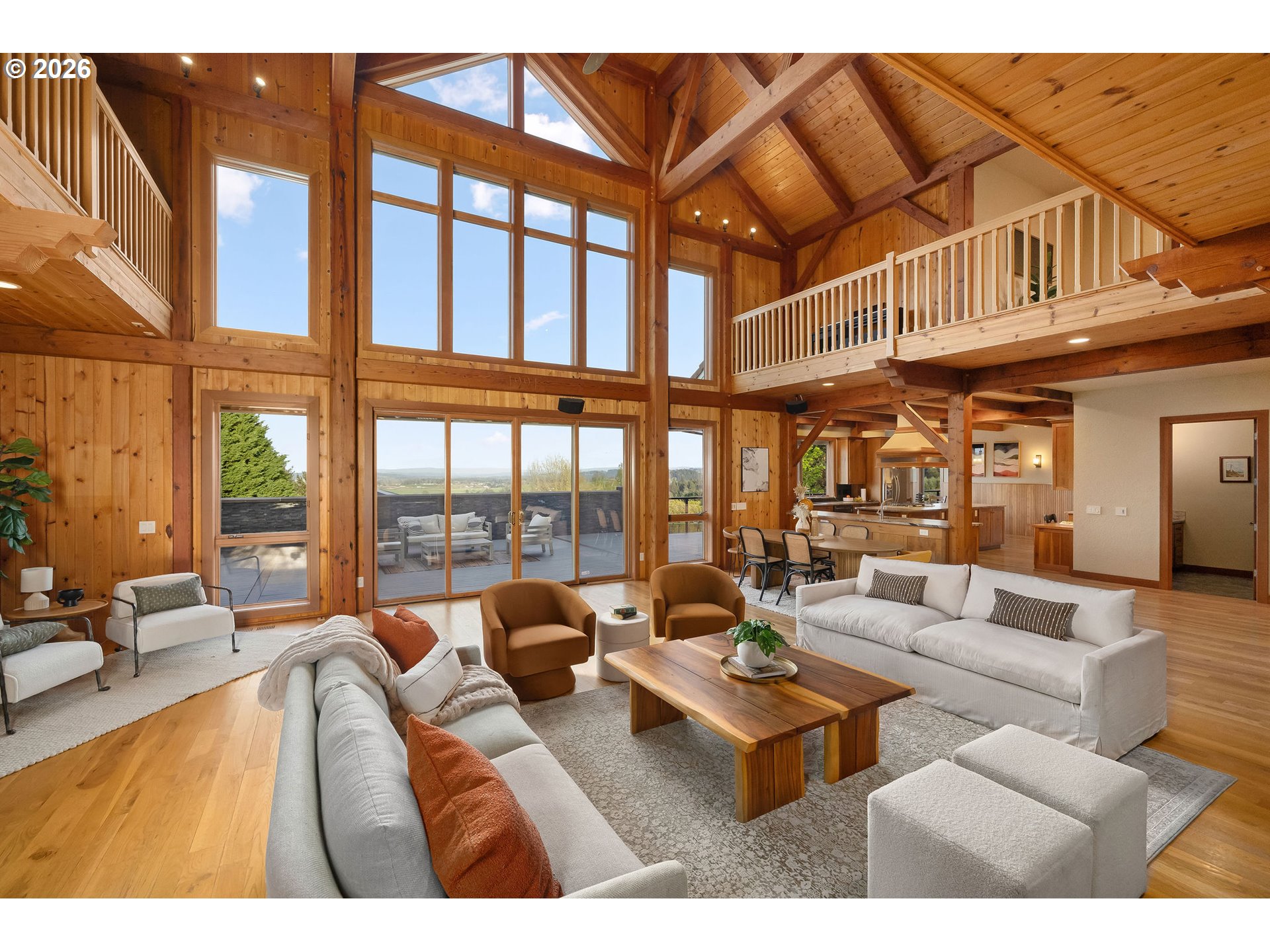 Open THURS, FRI Twilight, Sat & Sun! Rare 10-acre estate offering 12,007 sq ft of exceptional craftsmanship and versatility. This one-of-a-kind timberframe home features 5 bedrooms and 4.5 baths, constructed with stunning reclaimed wood dating back to the 1880s and sourced from the historic Bumble Bee Cannery in Astoria and a mill in Longview. Rich architectural details, exposed beams showing the joinery construction, and five fireplaces create warmth and character throughout. Five peaks visible from property, with Hood views from 24-foot soaring windows in great room, kitchen, dual offices, primary, and deck. St Helens, Rainier, Adams and Jefferson from different vantage points. A custom carved mantle shows all five mountains.Designed for both everyday living and entertaining, the home includes a stunning indoor saltwater pool and hot tub, complete with radiant heat flooring on pool deck, gym, theatre with 12-foot screen, billiards space, and stately library. True chef's kitchen with 12-foot leathered granite slab island and counters, double Electrolux convection ovens, 5 burner gas cooktop with commercial grade hood, and walk-in pantry.A separate upstairs apartment with loft provides ideal guest or multi-generational living. Whole-home generator offers year-round peace of mind.This expansive home with serious lodge resort vibes offers equestrian and winery potential. Volcanic rich soil perfect for Oregon's award-winning pinot noir grapes. Set on 10 rolling acres, the property includes a large barn with equipment, greenhouse, darkroom, and extensive storage throughout.A rare opportunity to own a legacy property that blends history, function, and lifestyle—just minutes from wine country and within reach of Portland.
