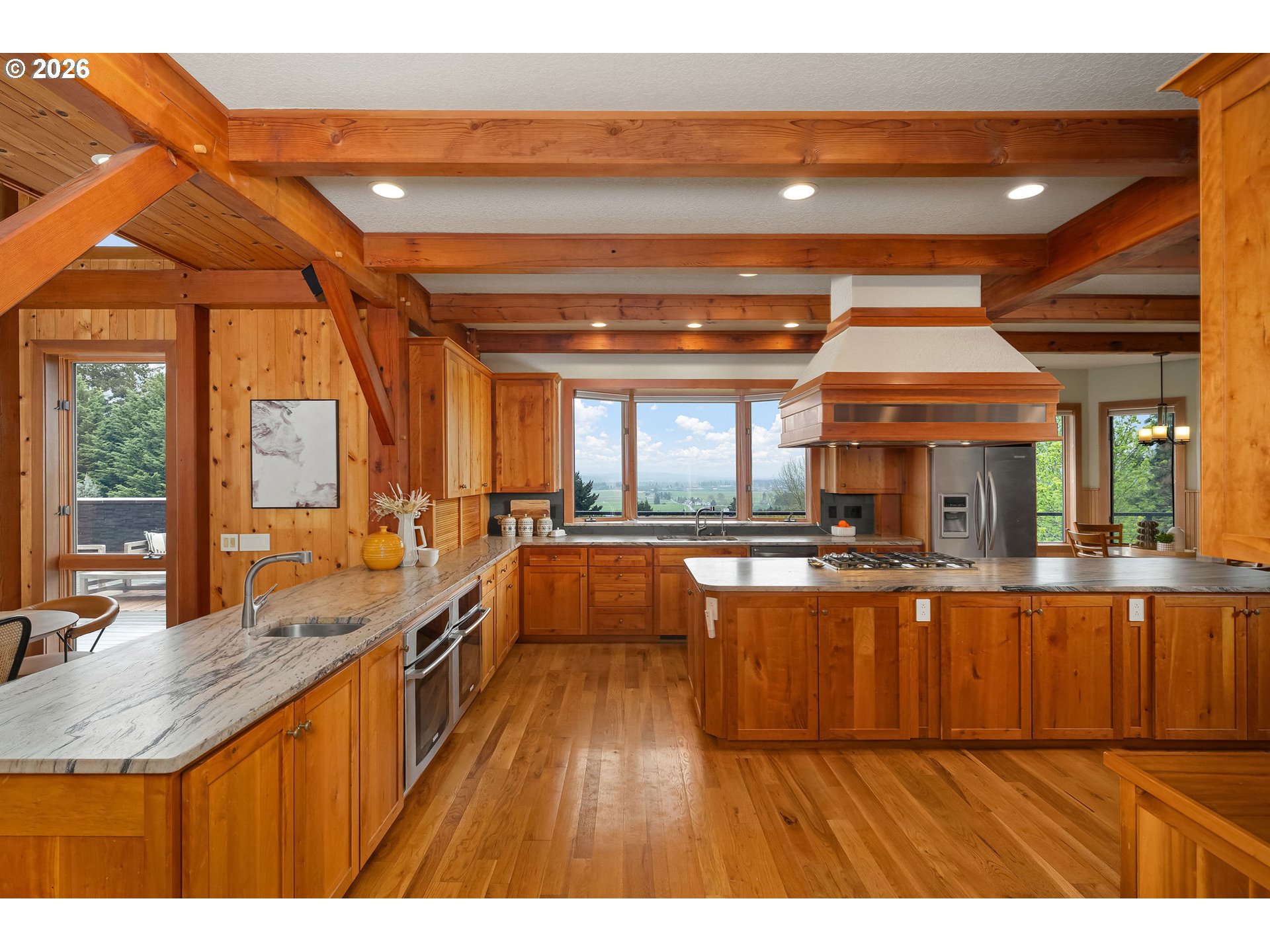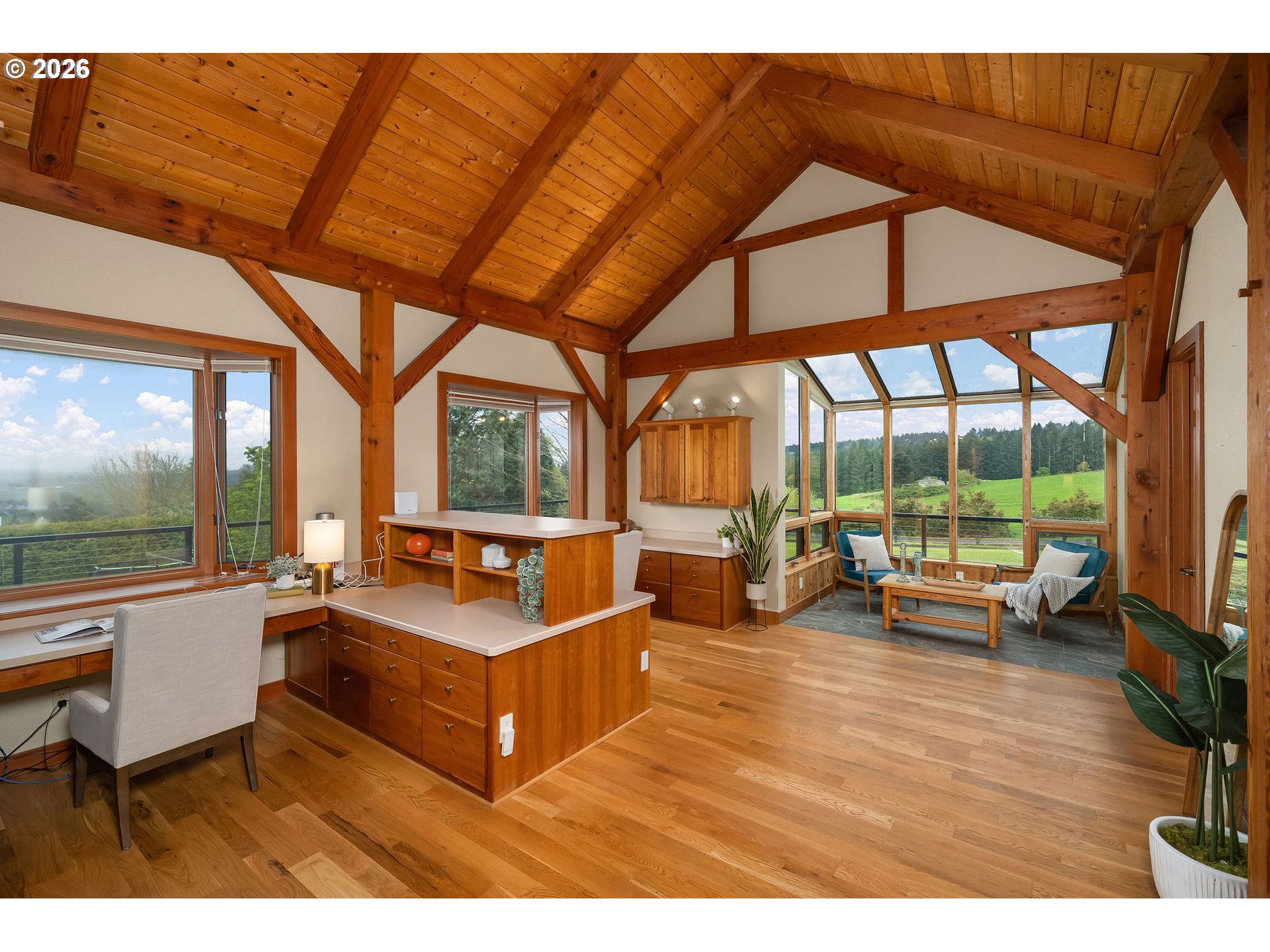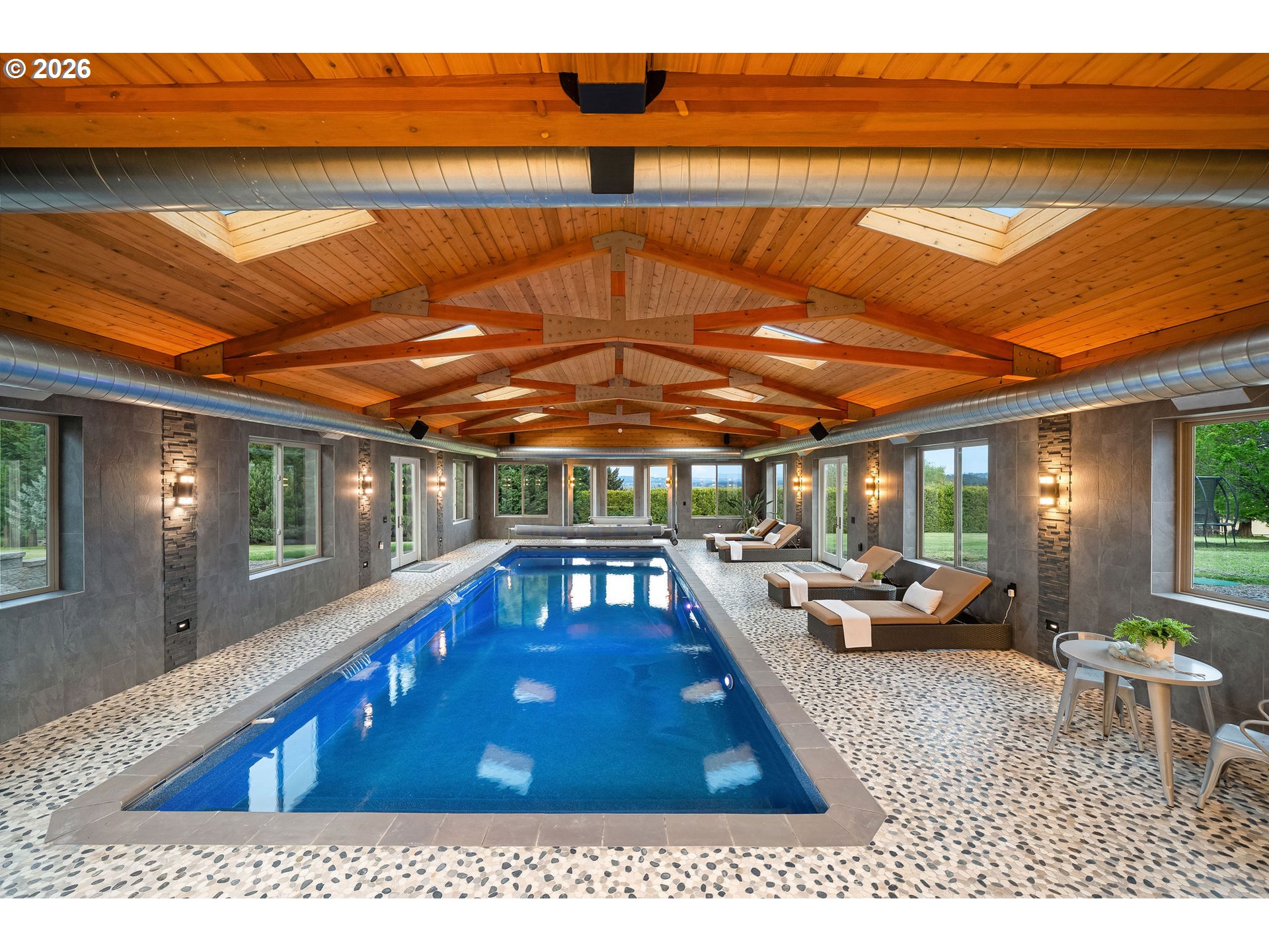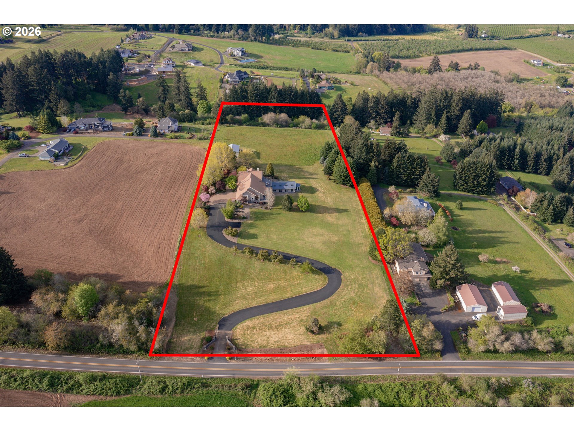 Open THURS, FRI Twilight, Sat & Sun! Rare 10-acre estate offering 12,007 sq ft of exceptional craftsmanship and versatility. This one-of-a-kind timberframe home features 5 bedrooms and 4.5 baths, constructed with stunning reclaimed wood dating back to the 1880s and sourced from the historic Bumble Bee Cannery in Astoria and a mill in Longview. Rich architectural details, exposed beams showing the joinery construction, and five fireplaces create warmth and character throughout. Five peaks visible from property, with Hood views from 24-foot soaring windows in great room, kitchen, dual offices, primary, and deck. St Helens, Rainier, Adams and Jefferson from different vantage points. A custom carved mantle shows all five mountains.Designed for both everyday living and entertaining, the home includes a stunning indoor saltwater pool and hot tub, complete with radiant heat flooring on pool deck, gym, theatre with 12-foot screen, billiards space, and stately library. True chef's kitchen with 12-foot leathered granite slab island and counters, double Electrolux convection ovens, 5 burner gas cooktop with commercial grade hood, and walk-in pantry.A separate upstairs apartment with loft provides ideal guest or multi-generational living. Whole-home generator offers year-round peace of mind.This expansive home with serious lodge resort vibes offers equestrian and winery potential. Volcanic rich soil perfect for Oregon's award-winning pinot noir grapes. Set on 10 rolling acres, the property includes a large barn with equipment, greenhouse, darkroom, and extensive storage throughout.A rare opportunity to own a legacy property that blends history, function, and lifestyle—just minutes from wine country and within reach of Portland.