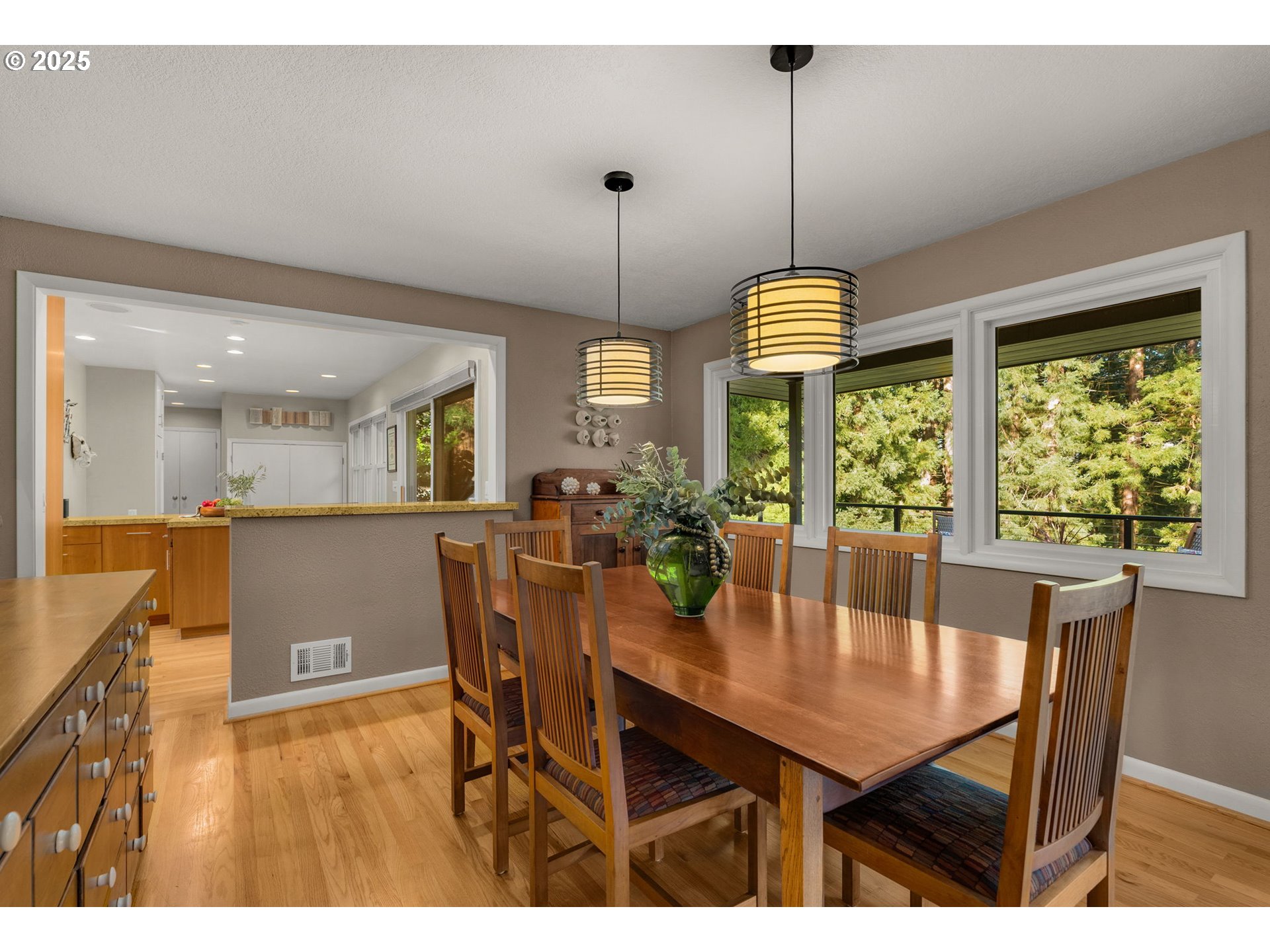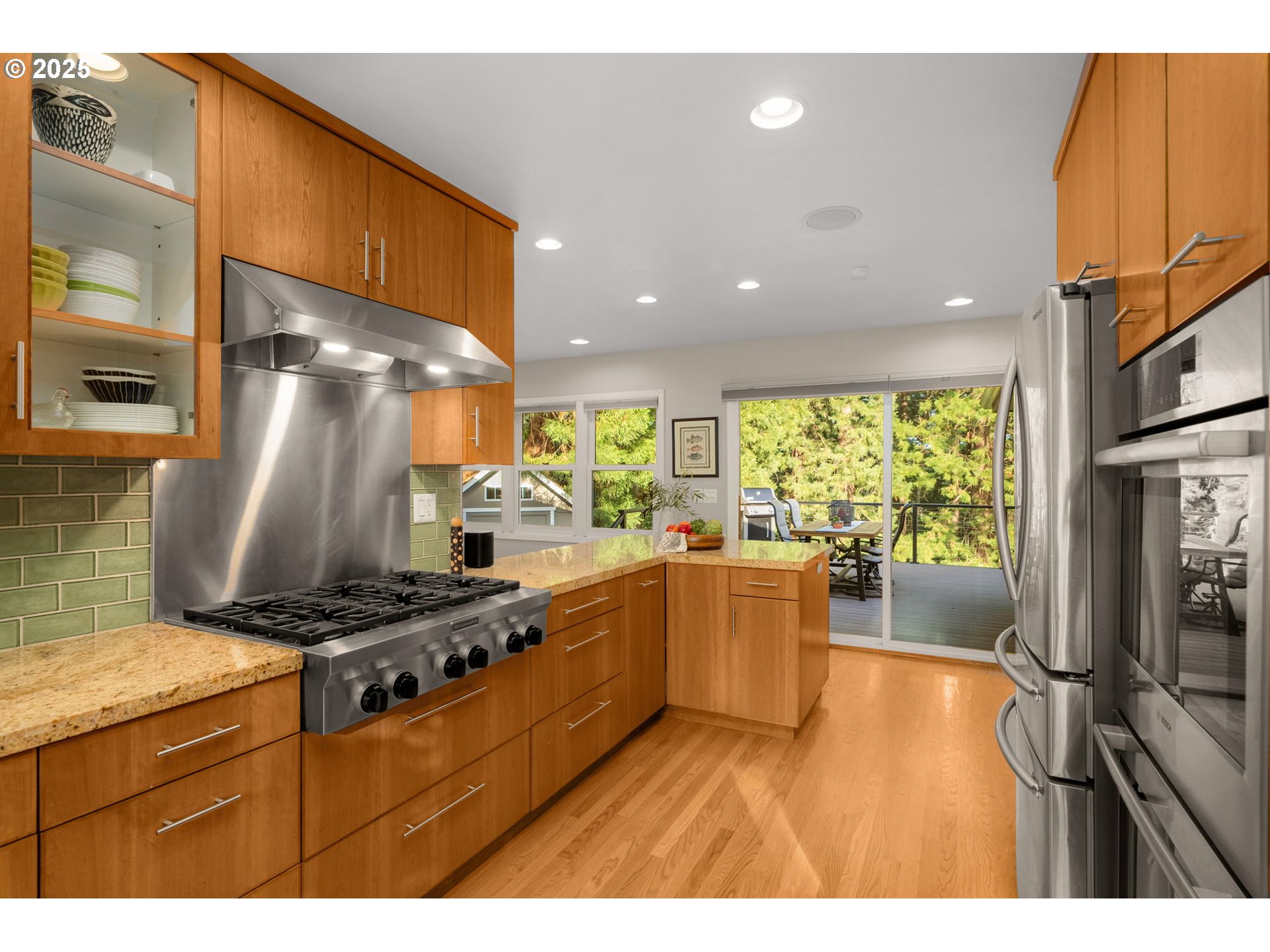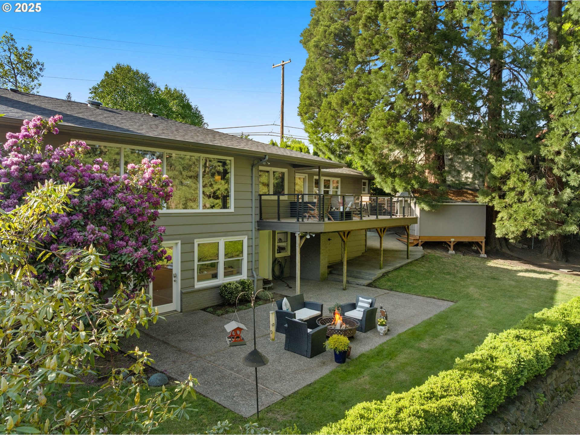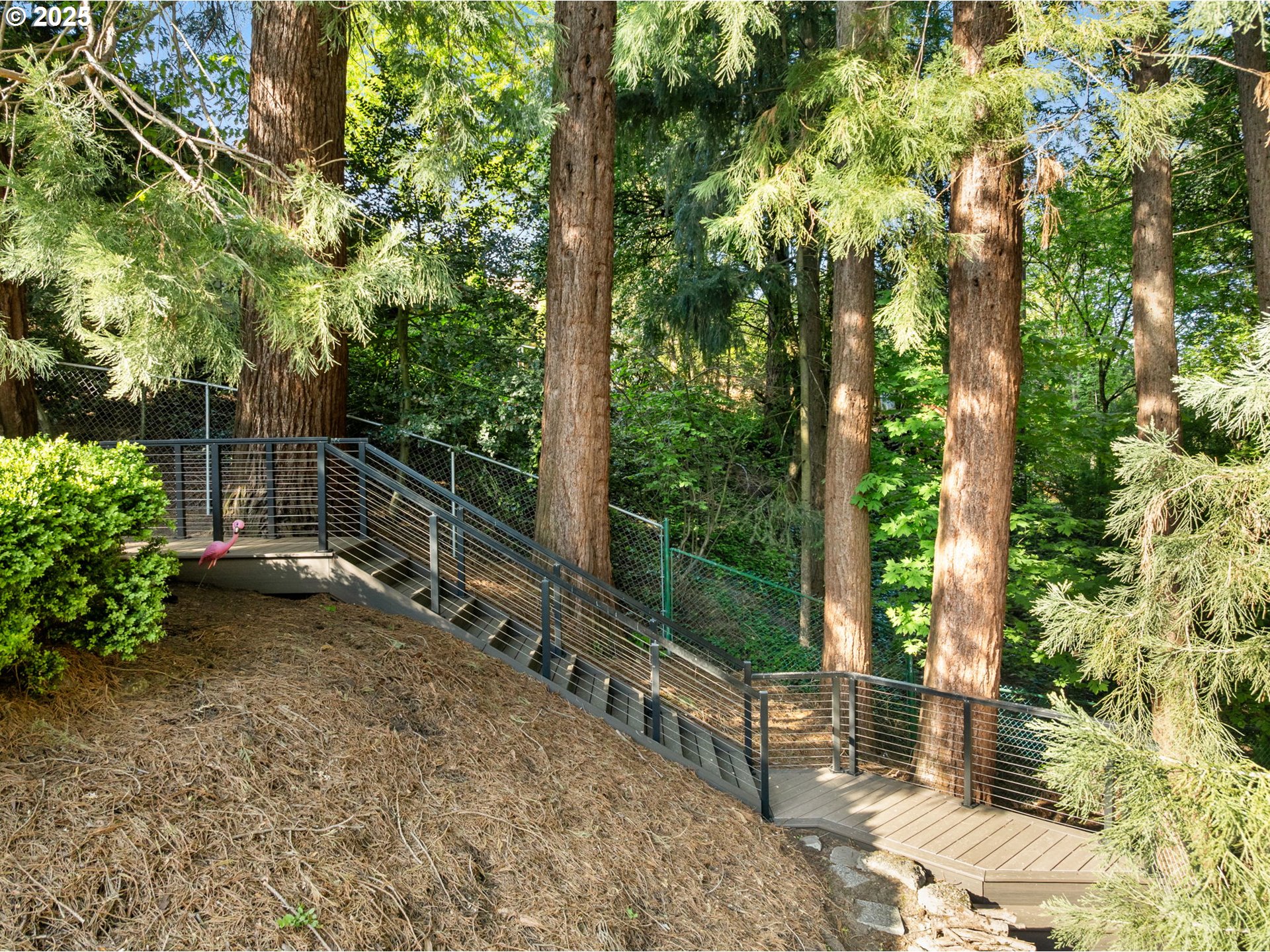 On a quiet, private street in the prestigious Vista Hills neighborhood, this unique mid-century raised ranch offers a rare blend of forested serenity, timeless charm, and thoughtful updates—all just minutes from the city. Built in 1951 on over half an acre, the property evokes the peaceful feel of a woodland retreat with the convenience of suburban living. Inside, natural light floods the home through large windows that frame picturesque views of the tree-lined grounds. The flowing floor plan connects cozy living spaces, including two wood-burning fireplaces and a spacious second-story deck—perfect for morning coffee or evening wine amidst the trees. The main level features a spacious living room, dining room, and primary suite. The kitchen is both beautiful and functional, with rich cherry cabinetry (some glass-front), granite countertops, a sage subway tile backsplash, and premium Bosch appliances, including a gas cooktop, double ovens, and integrated dishwasher. A coffee nook and countertop bar create inviting spaces to gather. Downstairs, in addition to a bedroom and bath, find custom built-in shelving, track lighting, and a long hallway ideal for an art gallery or display space. A versatile bonus room serves perfectly as an art studio, office, playroom, or craft area. Additional highlights include central A/C, a finished garage, raised garden beds, detached storage, and a fully fenced yard. Among the home’s most enchanting features is a winding timber staircase leading into a private forest sanctuary—ideal for forest bathing or quiet exploration under the giant sequoias. With top-rated schools (OES, Catlin Gabel, Jesuit, Sunset High) nearby, plus quick access to shops, nature preserves, and downtown Portland, this rare gem offers both tranquility and convenience.