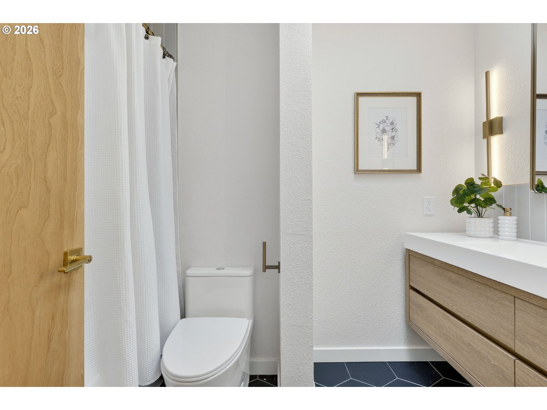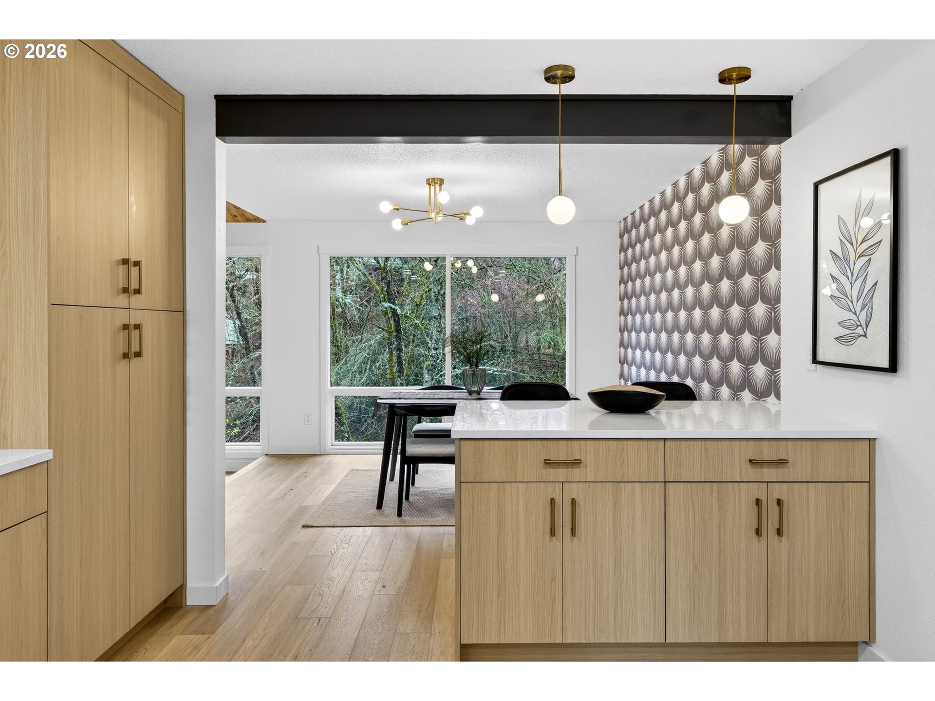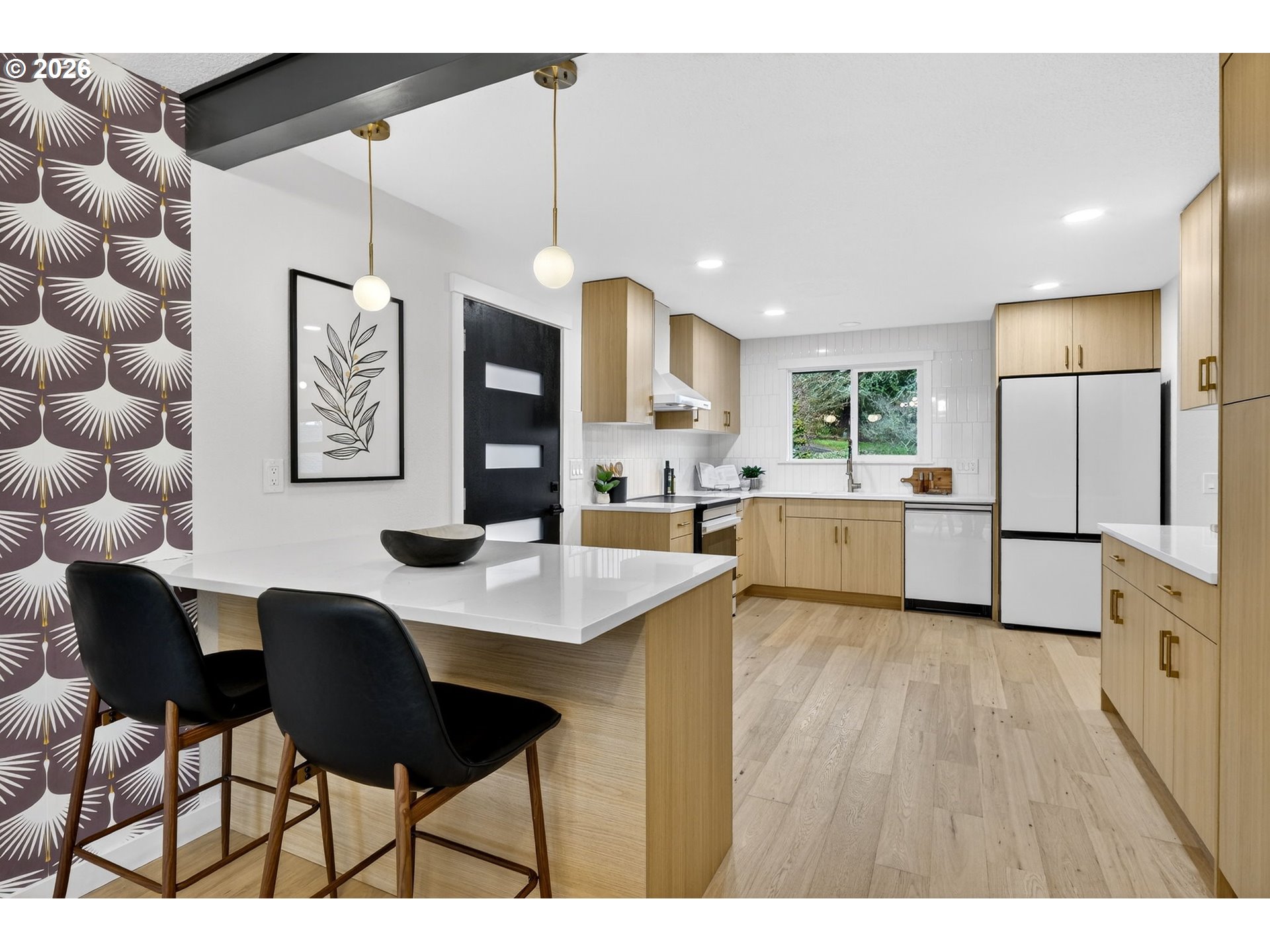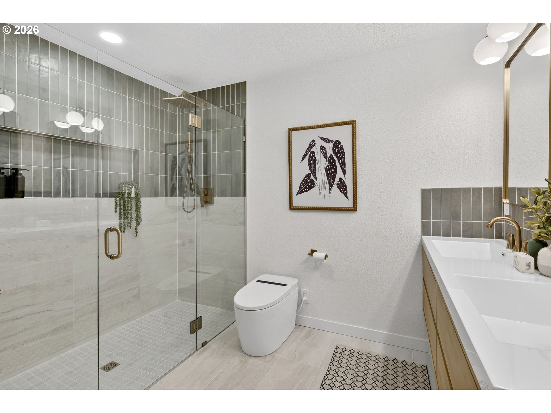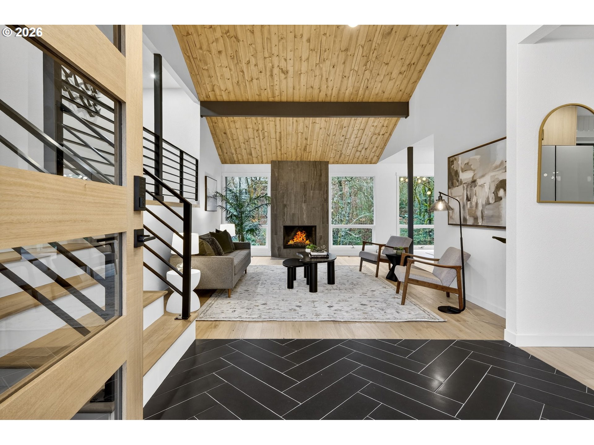 Welcome to this stunningly reimagined tri-level home situated on a serene .28-acre lot in one of Portland's most desired areas and in Washington County. Boasting 2,458 total square feet , this 4-bedroom , 3-bathroom residence has been masterfully transformed from its original interior into a contemporary showcase. The moment you step inside, you're greeted by breathtaking vaulted wood ceilings and a beautifully updated sunken living room featuring a striking tiled fireplace and sleek metal railings. The fully renovated kitchen is an entertainer's dream, featuring crisp white appliances and light wood cabinetry, high-end finishes, and a seamless flow into the vibrant dining area. With multiple living spaces, a luxurious primary suite featuring a custom window seat, and spa-like bathrooms with premium fixtures, heated flooring, amazing dual head tile shower, and a dream toilet. This 1978 home perfectly blends mid-century character with modern elegance. Step outside to enjoy the outdoor dining area off the kitchen and the huge backyard with endless possibilities along side an angelic sounding creek. A true must see! Open House on Saturday and Sunday.