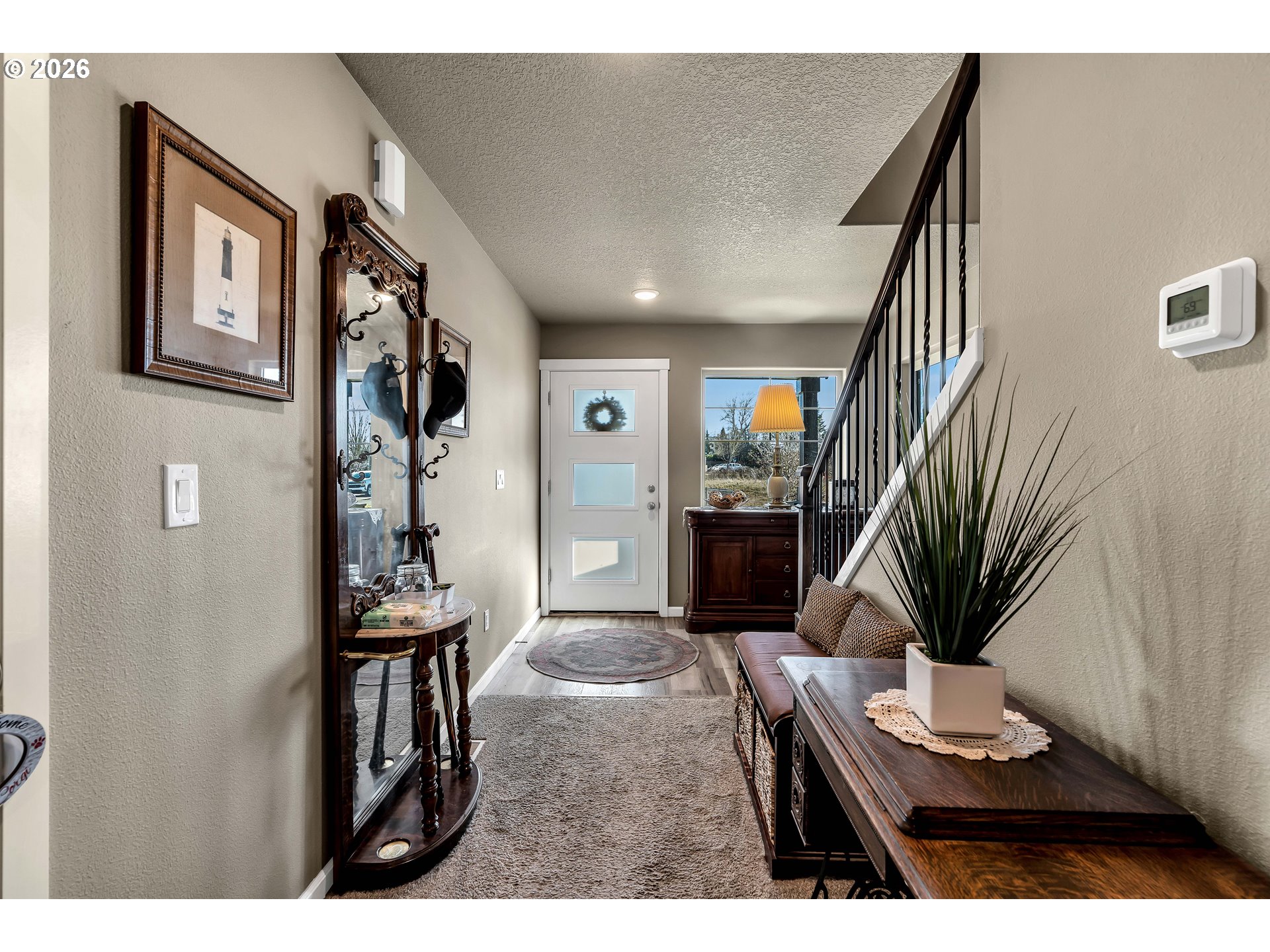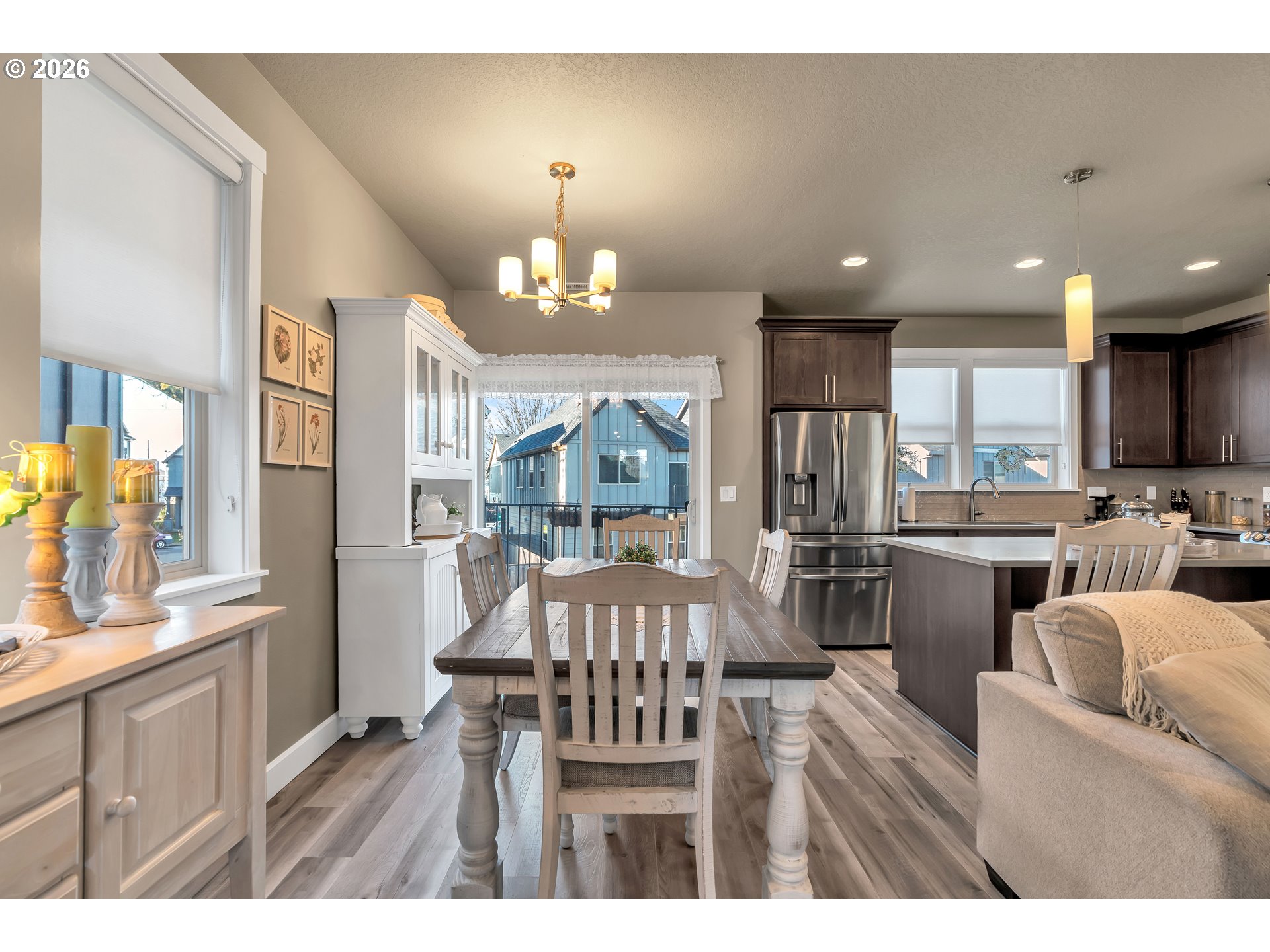 This inviting 3-bedroom, 2.5-bath home blends modern comfort with everyday convenience in a prime location. The light-filled open floor plan features luxury vinyl plank flooring and a cozy fireplace, creating a warm and welcoming atmosphere. The stylish kitchen is designed for both function and flair, offering a quartz island, stainless steel appliances, generous storage, and ample prep space. The open concept of the kitchen, dining and living room makes the room feel greater and fills it with light.Step outside to the deck overlooking a fenced backyard—ideal for relaxing, entertaining, or play. The private primary suite is located upstairs, featuring a spacious bathroom with double sinks and walk in shower, while two additional bedrooms and a full bath on the main level provide flexibility for guests or home office needs. All bedrooms offer wall to wall carpet making them cozier. Front yard irrigation and a low HOA that covers front landscaping make for easy, low-maintenance living.Enjoy close proximity to parks, trails, golf courses, dining, and shopping, with quick access to Intel, Nike, Genentech, Orenco Station, The Streets of Tanasbourne, MAX transit, top-rated schools, hospitals, and major highways including Hwy 26 and I-5—perfect for commuters. [Home Energy Score = 6. HES Report at https://rpt.greenbuildingregistry.com/hes/OR10241322]