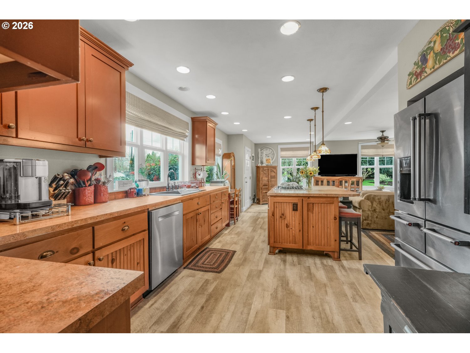 Welcome to a rare and versatile estate where country charm meets modern comfort and endless opportunity. This beautifully appointed 3-bedroom, 2 bath home offers approximately 1,808 square feet of thoughtfully designed living space. Inside, you’ll find an inviting open-concept layout highlighted by a spacious cook island, built-in appliances, durable LVP flooring, and a cozy gas fireplace that anchors the main living area. The lower-level bathroom features a luxurious soaking tub, perfect for unwinding, while the upstairs primary suite creates a private retreat-like atmosphere. Step outside to an expansive covered deck, ideal for year-round entertaining and enjoying the serene surroundings. Equestrian enthusiasts will appreciate the fully equipped indoor and outdoor horse arenas, complete with stalls and a tack room. Adding to the property's charm is a delightful orchard featuring 16 mature fruit trees, offering seasonal harvests and a true farm-to-table lifestyle right at home. Whether you're envisioning peaceful mornings among the trees or sharing the bounty with friends and family, this space adds both beauty and function. Ready for both hobbyists and professionals alike. The property’s flexibility truly sets it apart. A detached suite offers its own private living quarters, including a kitchen, bathroom, bedroom, living space, and dedicated shop area, perfect for guests, extended living, or workspace needs. Additionally, a manufactured home on-site provides immediate rental income potential. Whether you're seeking a multigenerational setup, income-producing property, or your own private retreat with room to roam, this exceptional offering delivers unmatched possibilities.