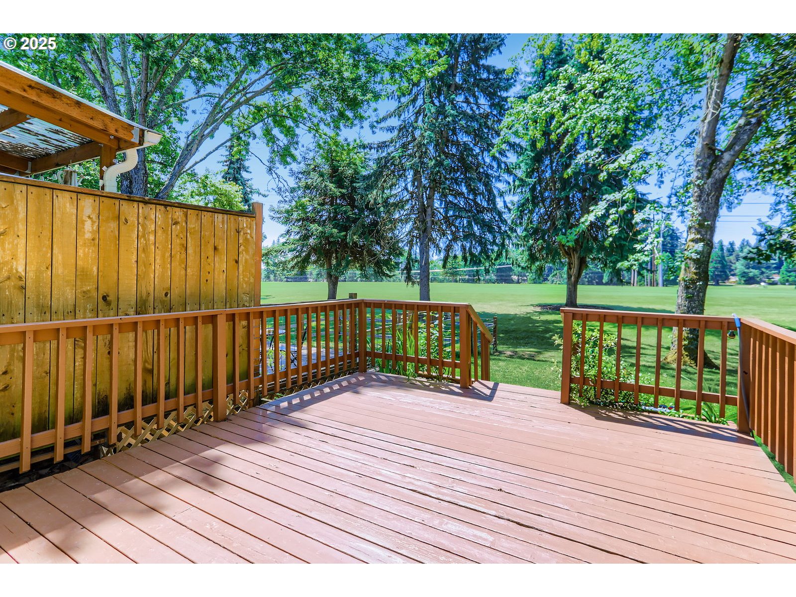 End-unit townhouse with unbeatable golf course lot! With an extra-large (6,970 SQFT) lot, this home is situated in possibly the best location of all the Springridge townhouses. It offers stunning views of the ninth fairway, sunny southern exposure, three decks, and abundant gardening space with mature landscaping. The home has been well maintained and extensively updated with vinyl windows, two mini-splits for comfort all year long, fresh paint, and white doors and millwork. The remodeled kitchen features quartz countertops, new soft close cabinets, stainless steel appliances, and vinyl slider to the deck and backyard beyond. It's fully open to the living room, boasting exposed tongue & groove ceilings and a wood-burning masonry fireplace. Primary suite offers recent carpet, ceiling fan, private covered deck, and attached bathroom with updated fixtures. Oversized attached garage with opener, plus driveway parking. $155/month HOA dues includes exterior & commons maintenance. All appliances included! Outstanding location, just steps from Rock Creek Country Club and THPRD parks and trails, with easy access to local Washington County employers!