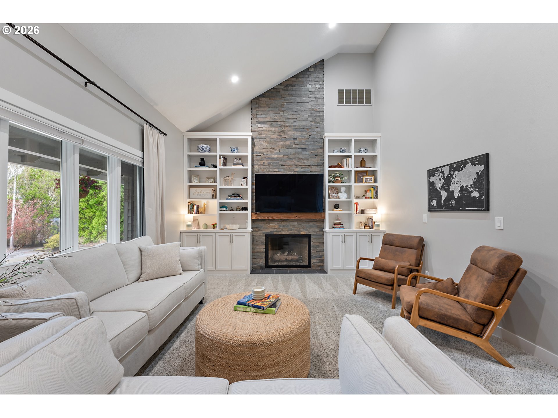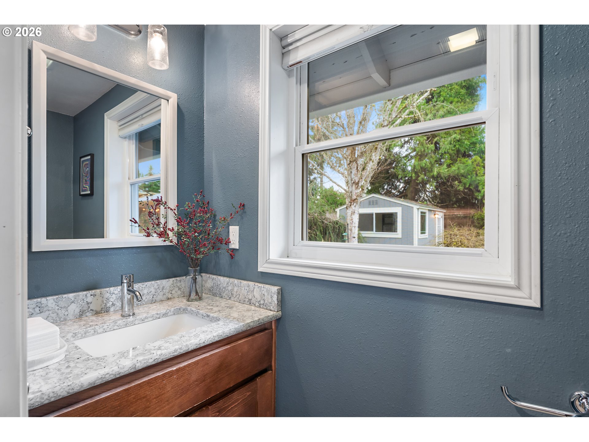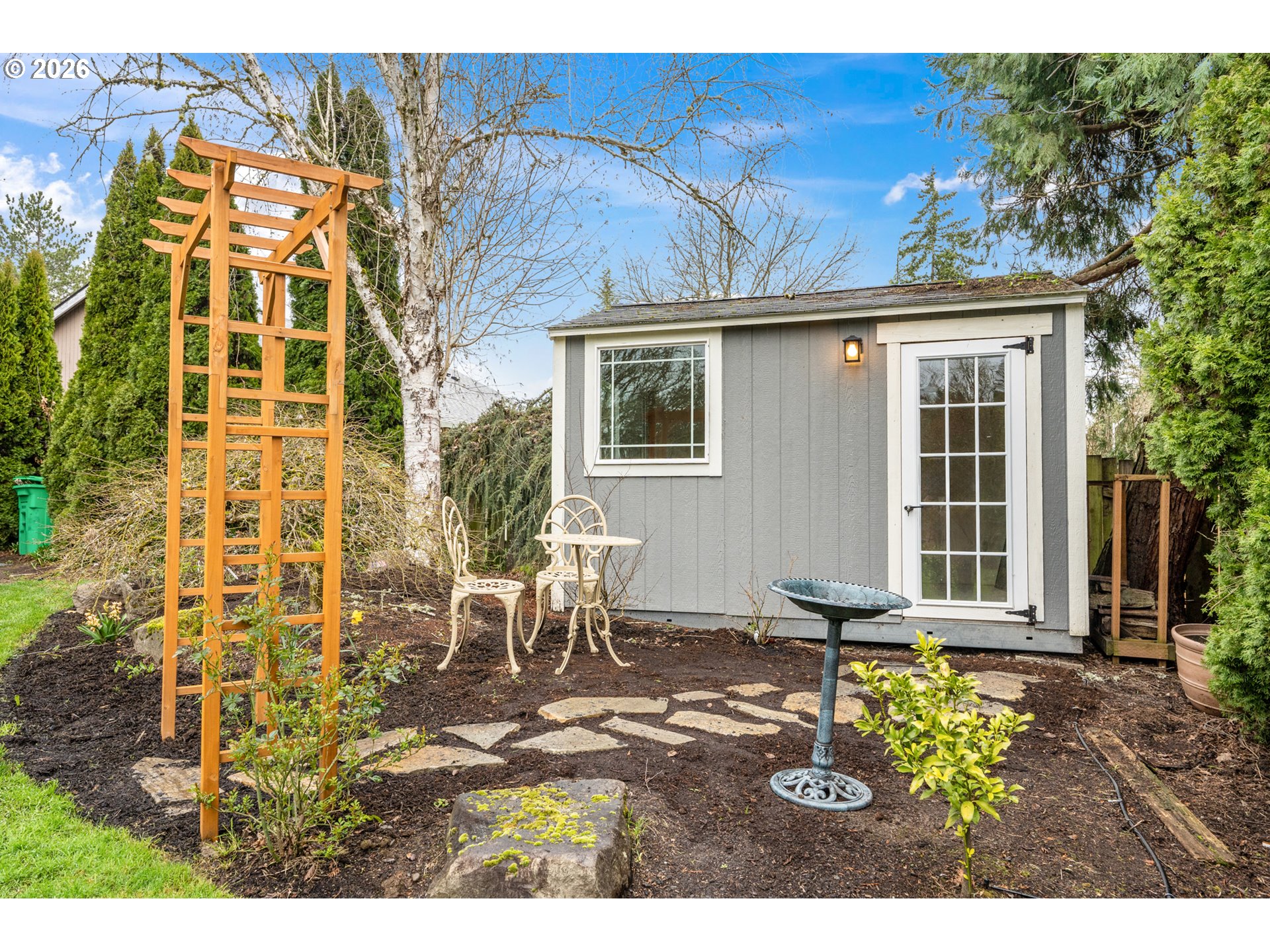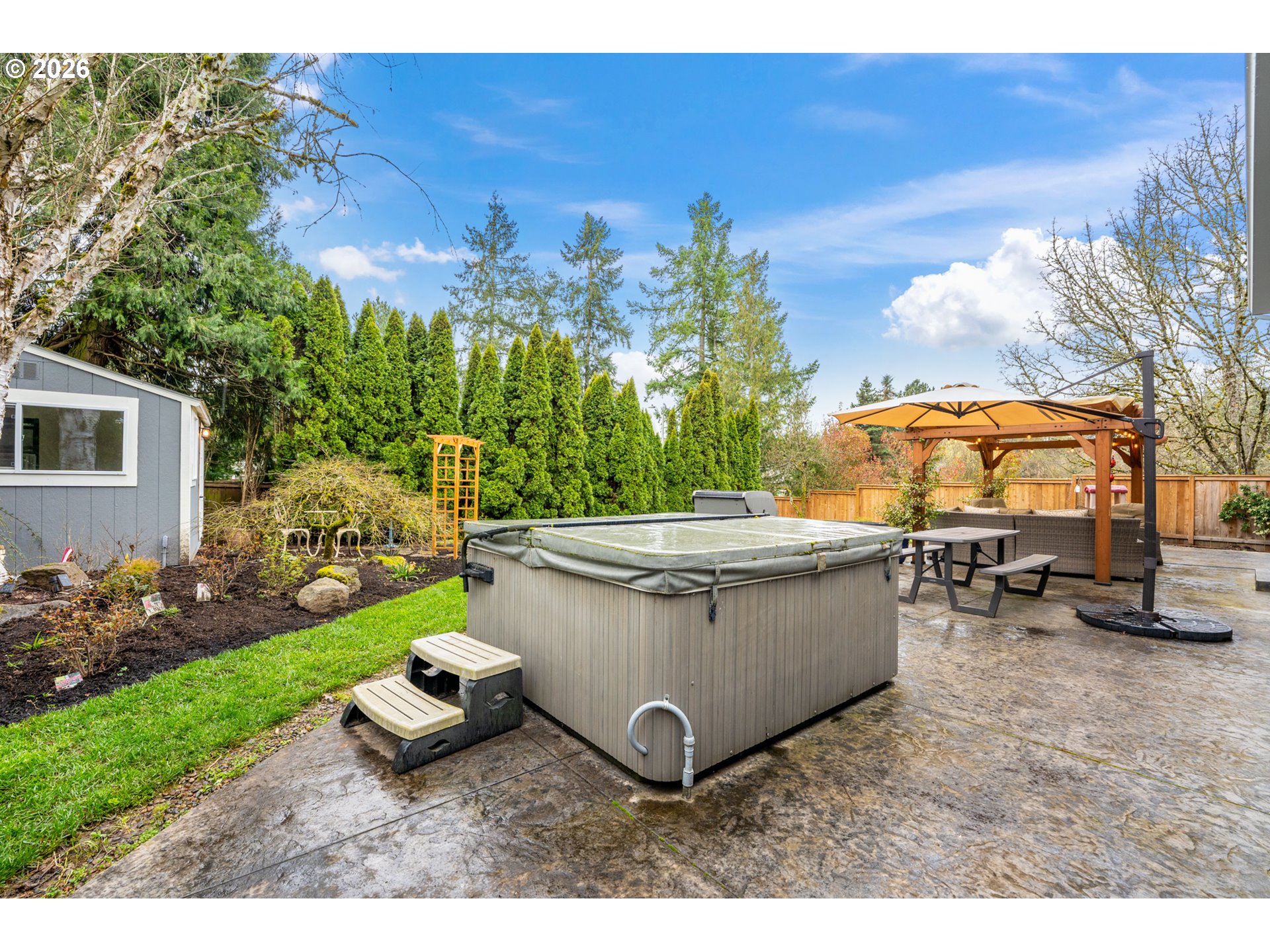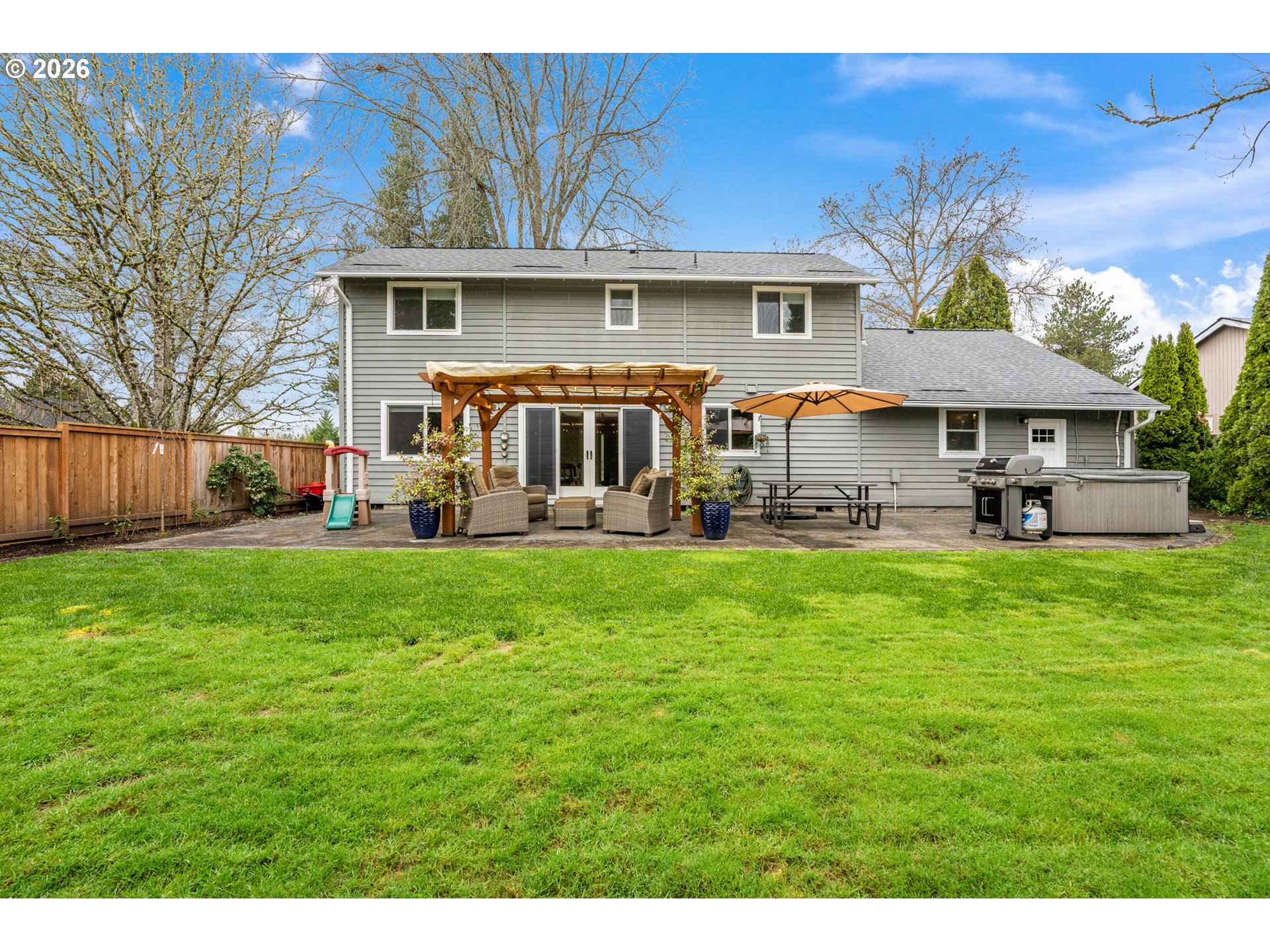 Located in a quiet and private cul-de-sac in the popular Jackson School neighborhood, this property offers convenient access to HOA amenities like the pool, tennis courts, and clubhouse. Inside, a vaulted ceiling living room welcomes you with a gas fireplace framed by built-in bookcases, adding both character and warmth. The kitchen, designed for anyone who loves to cook, features granite counters, stainless steel appliances, refinished hardwood floors, and a generous workspace with soft-close LED underlit cabinetry. Just off the kitchen, a spacious dining area features a wainscoted accent wall and glass French doors that bring in abundant natural light. The doors open to a spacious stamped-concrete patio with a pergola and hot tub—ideal for outdoor dining and year-round entertaining. A thoughtfully added mudroom and laundry area with a half bath sits between the kitchen and garage, creating a practical everyday entry point. The primary suite is on the main level and includes a remodeled bath with a walk-in shower and generous closet space, while two additional bedrooms and a full bath are located upstairs.The oversized backyard has no neighbor behind or to one side, enhancing the sense of space and privacy. A refreshed exterior shed—updated with insulation, electrical, and windows—offers flexible use as an office, studio, or creative retreat. [Home Energy Score = 4. HES Report at https://rpt.greenbuildingregistry.com/hes/OR10245809]