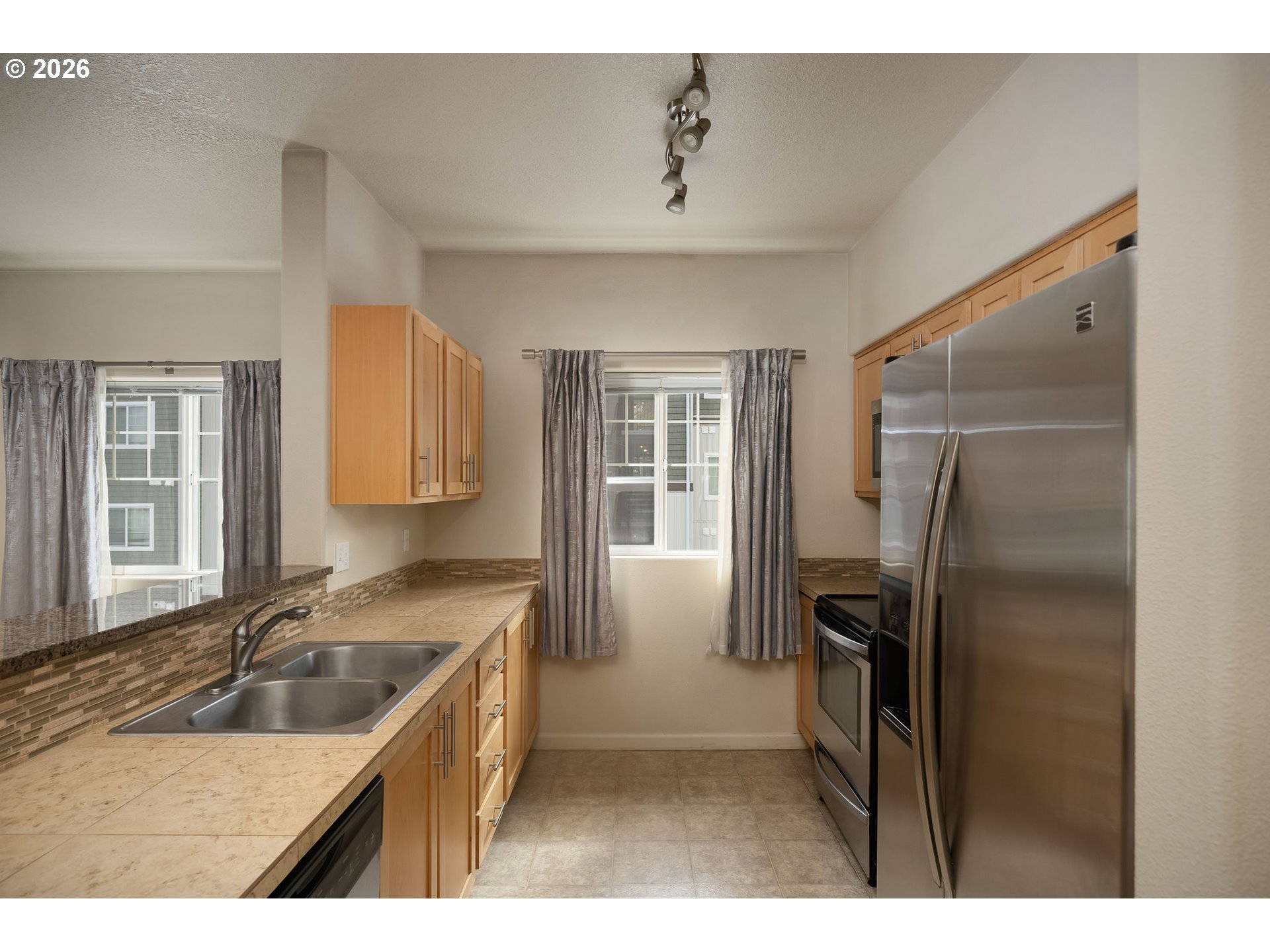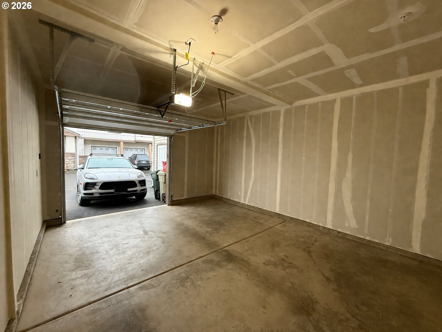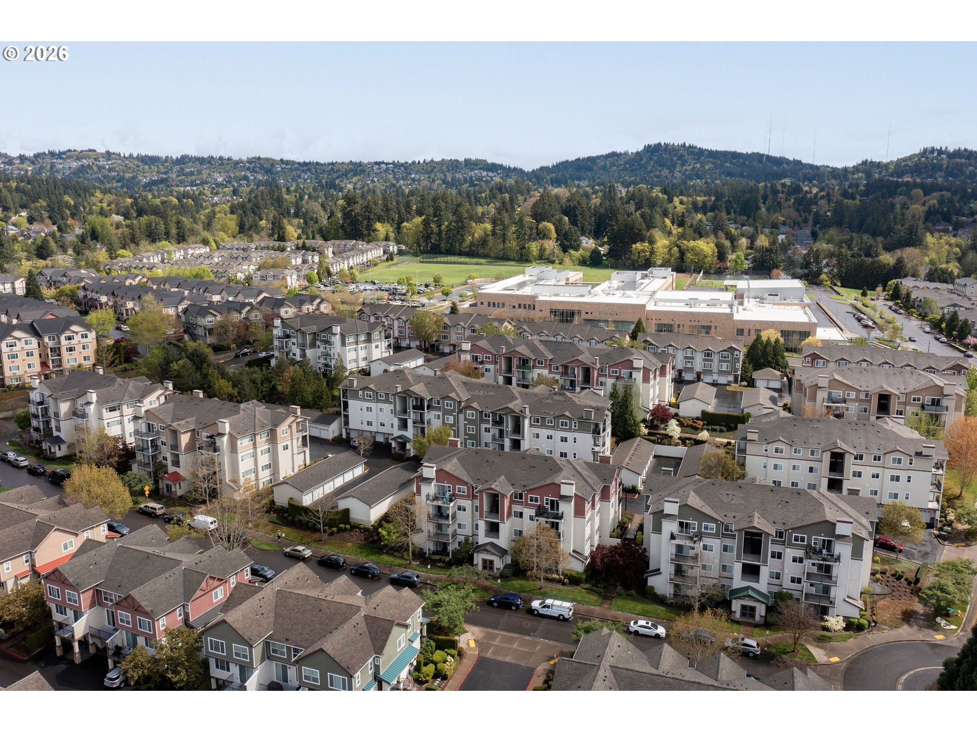 Top floor unit with a tiled entry and a convenient in unit laundry room. The kitchen includes a pantry, hard surface countertops, stainless steel appliances, and a built-in microwave hood. The primary suite features a spacious walk-in closet, while the open concept dining and living area offers a cozy corner fireplace and sliding doors that lead to a private deck with an adjacent storage room. Ideally located with easy access to shopping, dining, Nike, Intel, Downtown Portland, and Highway 26. An extra-large garage provides plenty of room for storage and equipment.