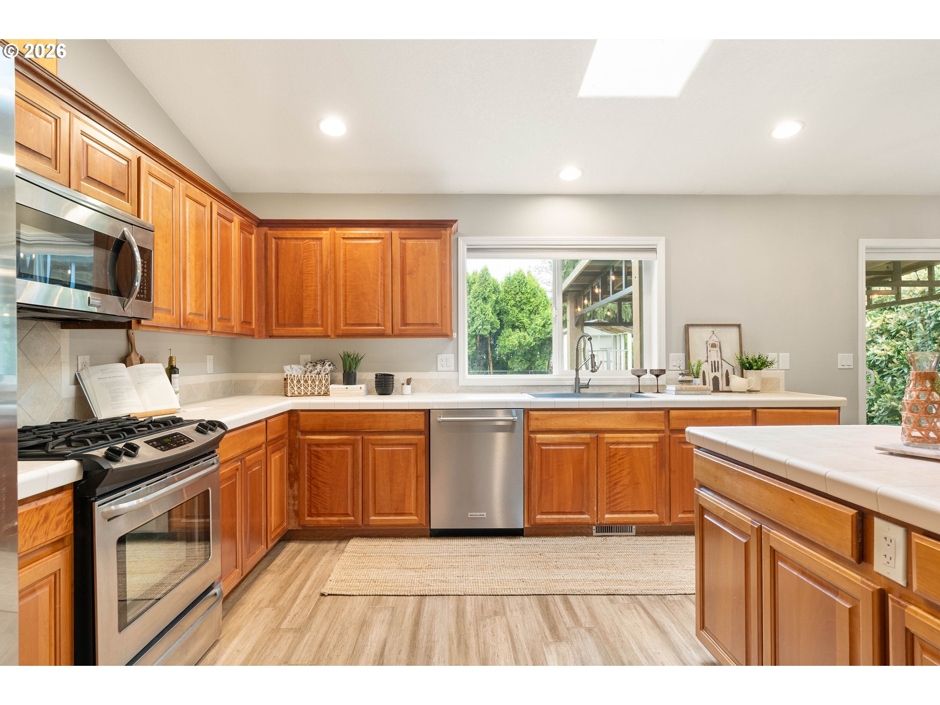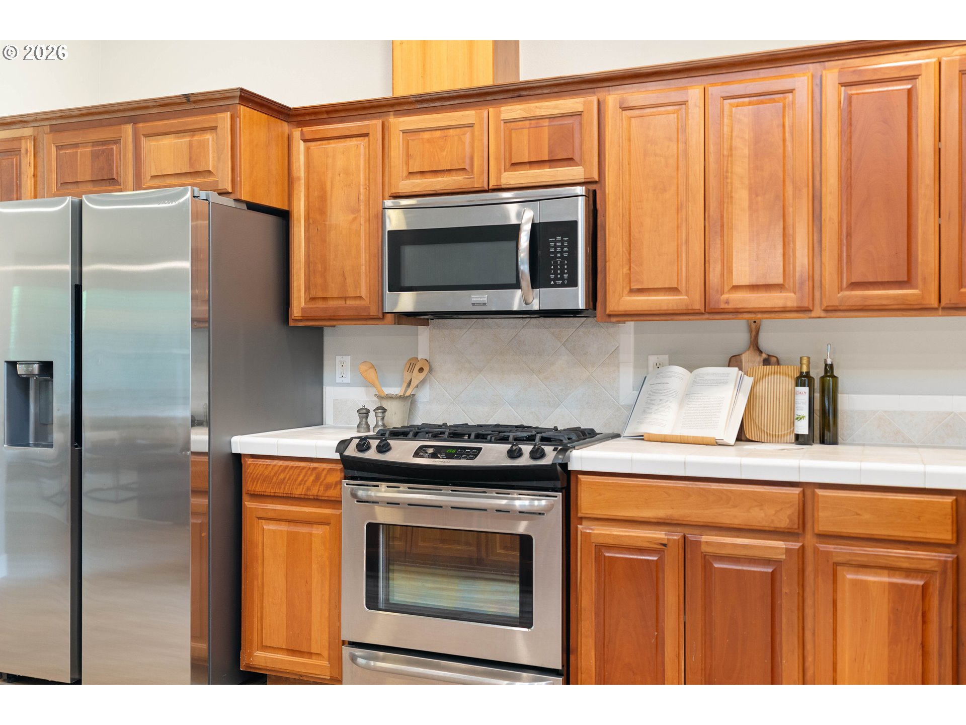 FreeStandingGasRange, FreeStandingRefrigerator, Island, Microwave, StainlessSteelAppliance, Tile