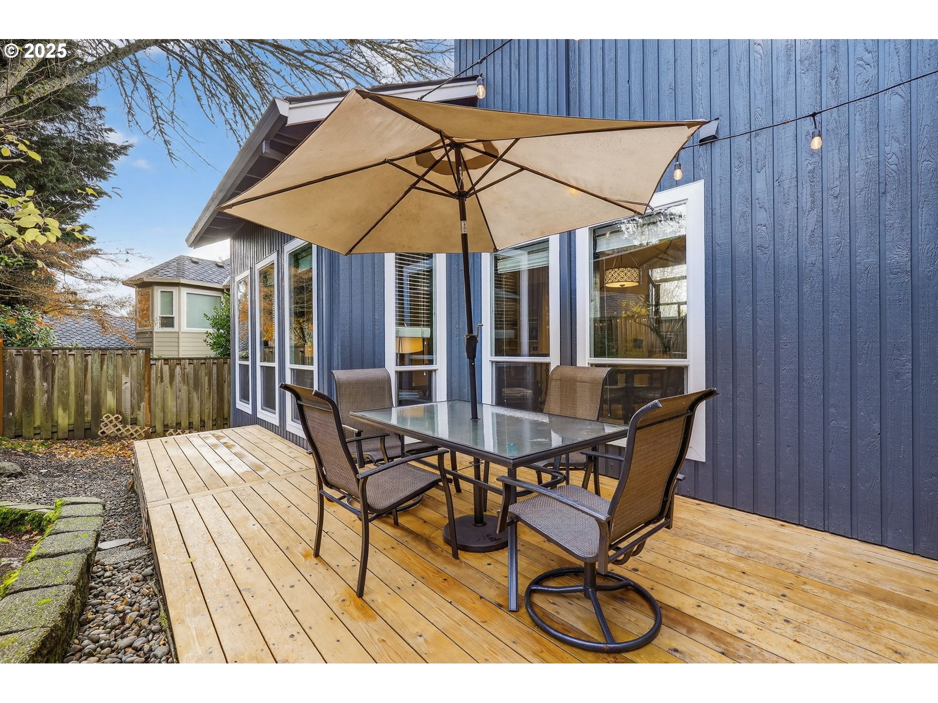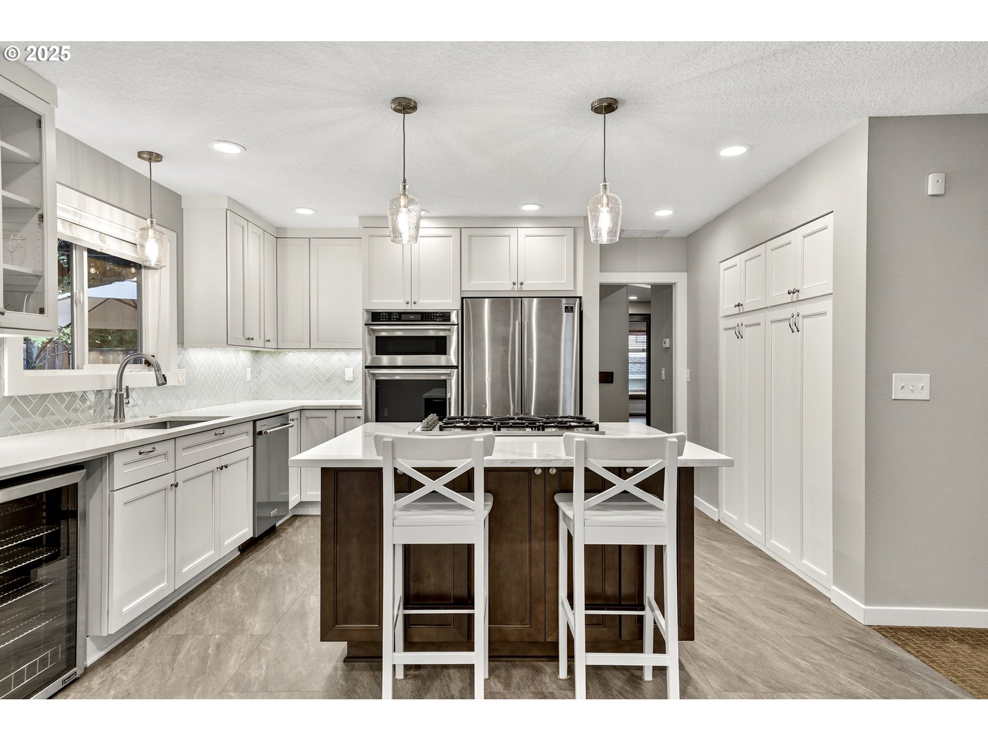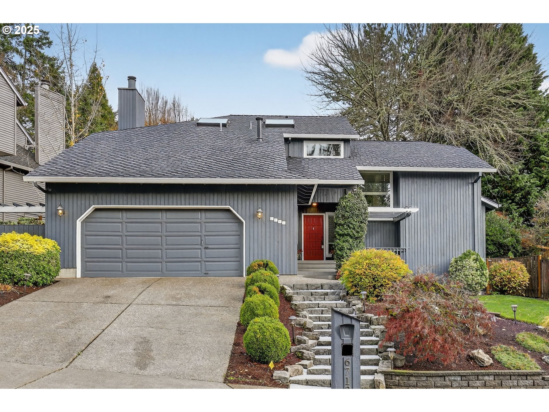 (503) 893-8874*OPEN SAT 12/13 & SUN 12/14 FROM 11 AM - 1 PM* 2 Story Beaverton Contemporary! Stunning stone steps lead to a covered front porch overlooking a beautifully landscaped front yard. A lofted entry features hardwood floors, a powder room with Quartz countertops, and coat closet. Hardwood floors flow into an open dining room with floor-to-ceiling windows and a decorative railing to the formal living room with vaulted ceilings, exposed beam, built-ins, and a wall of backyard-facing windows. The freshly remodeled kitchen offers an eat-in island with storage, stainless steel appliances, pantry-style cabinets, Quartz countertops, glass tile backsplash, beverage fridge, and dining nook with sliding door to the backyard oasis. Adjacent family room includes a fireplace, wet bar, and nearby laundry with built-ins. The main floor bedroom option/Den has a window seat, built-in desk, and closet nearby. Upstairs, a lofted landing with skylight leads to a spacious primary retreat with ceiling fan, private deck, and ensuite with dual-sink Quartz vanity, walk-in tile shower, tub with tile surround, built-in storage, and walk-in closet. 2 additional bedrooms up with new paint share a hall bath with skylight and Quartz countertops. Backyard retreat features covered patio, sunny deck, stone walkway, fenced yard, and mature landscaping. All of this near Westside Trail, Thornbrook Nature Area, and Mt. Williams Park. Don't miss this fantastic Mountainside district home!