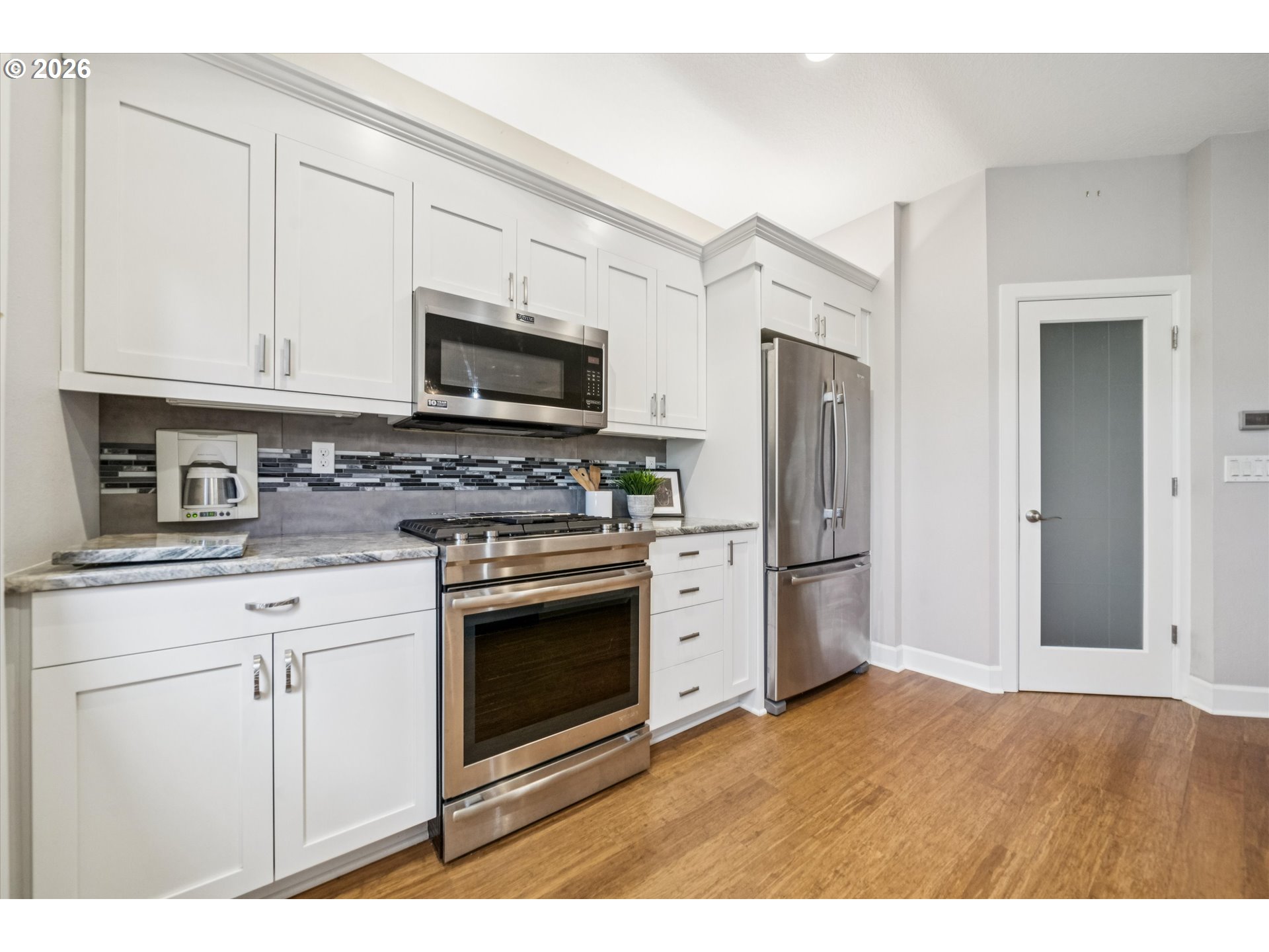 (503) 893-8874Experience the perfect blend of location and style in this thoughtfully designed home, high-end finishes meet everyday living. From the moment you step inside, you’re welcomed by natural light that makes the space feel truly special.The main level opens to a living room that feels both elegant & inviting. Rich bamboo flooring flows seamlessly, enhancing the home’s cohesive aesthetic. A gas fireplace framed by modern tile creates a cozy focal point, perfect for cooler days. Thoughtful built-ins, including two cabinets for sound system and storage, keeping your home organized while maintaining a clean, uncluttered look. The open floor plan allows for easy flow and connection, while the kitchen combines beauty and function. A welcoming eat bar invites casual meals, morning coffee, or time with guests. Stylish tile backsplash adds visual interest, while soft-close cabinetry with pull-out drawers makes everyday use feel easy and efficient. High-end stainless-steel JennAir appliances, including a gas stove & French door refrigerator freezer, deliver performance with a sleek, modern edge. A spacious walk-in pantry keeps everything in reach and counters uncluttered. Upstairs, a built-in desk creates a dedicated workspace, while steps away a private balcony offers a view of the park across the street. The laundry room with washer, dryer, & shelving adds convenience. The primary suite offers comfort & quiet luxury, featuring a stunning tiled walk-in shower with a built-in seat. The second bedroom is equally thoughtful, with built-in shelving, a dresser, and a cozy bench with hidden storage. An ensuite bathroom with a tub/shower combination provides comfort and ease for guests. Outdoor living is just as inviting, with a covered front porch perfect for relaxing and enjoying the rhythm of the neighborhood. A fenced backyard offers a serene, private setting—ideal for quiet unwinding. A covered breezeway from garage to home ensures you stay dry and blocks to shops & dining too!