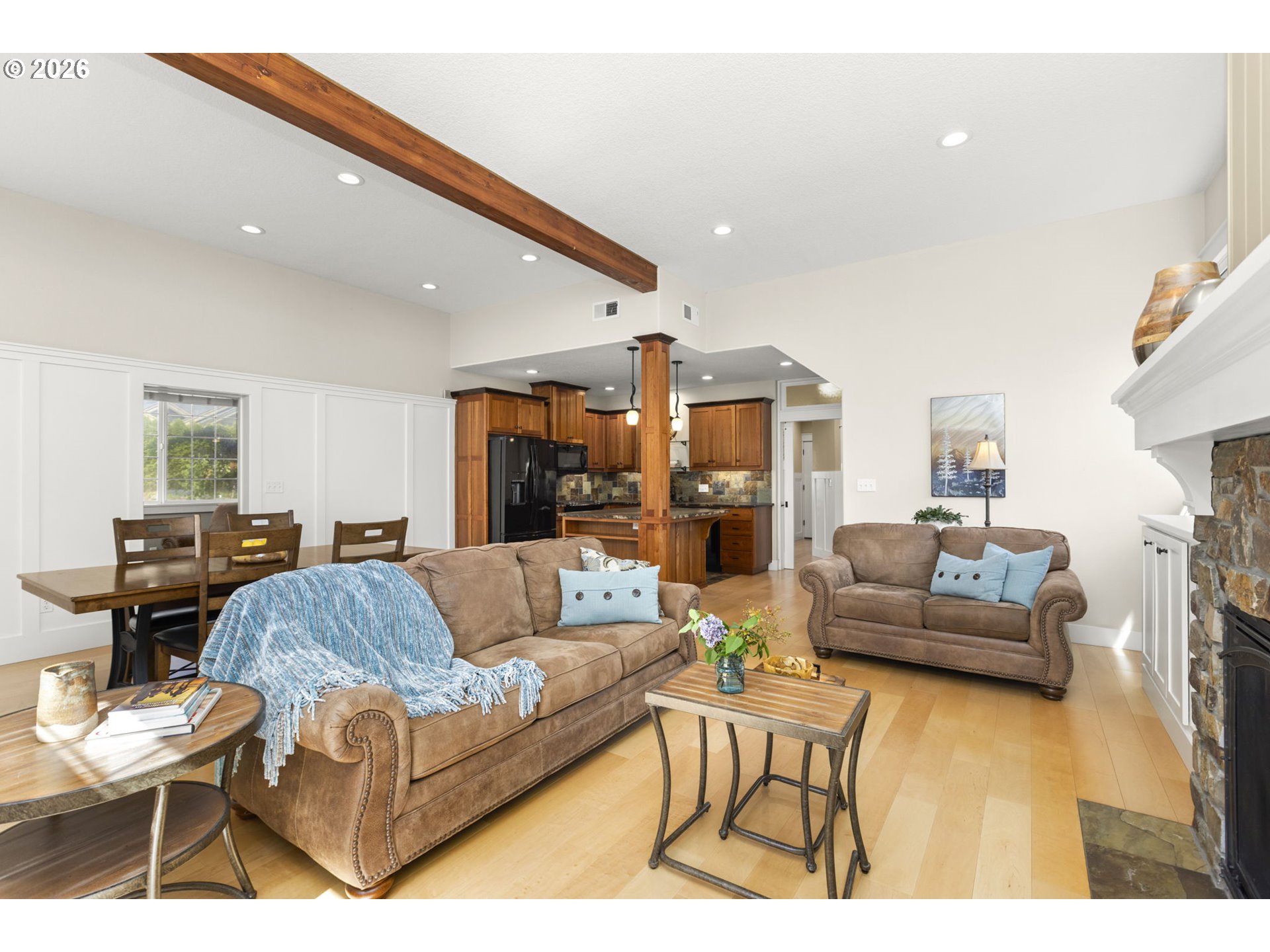 BeamedCeilings, Bookcases, BuiltinFeatures, Fireplace, HardwoodFloors