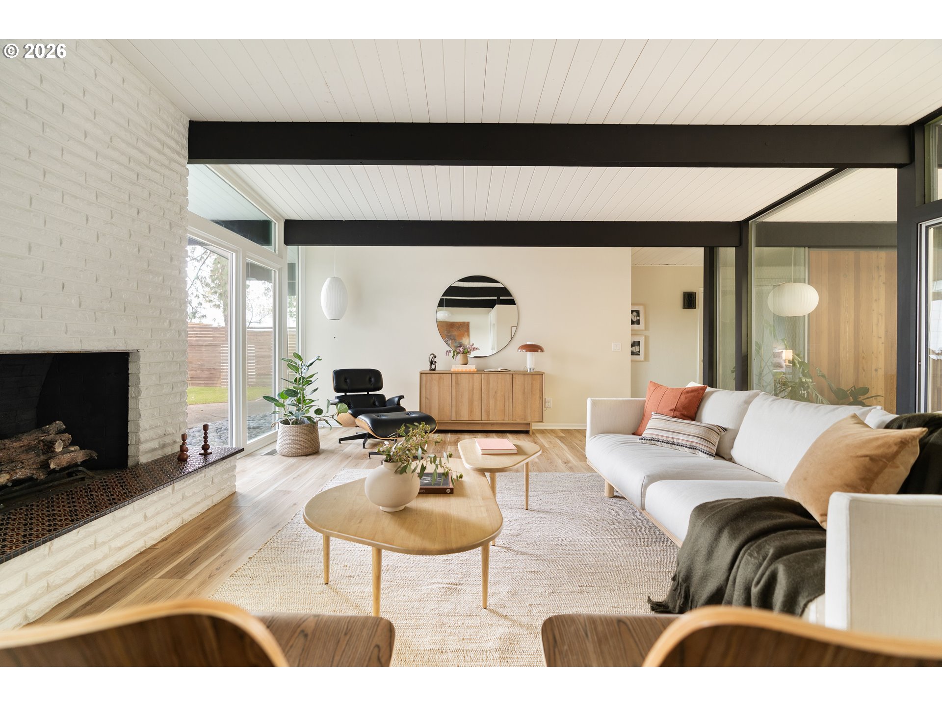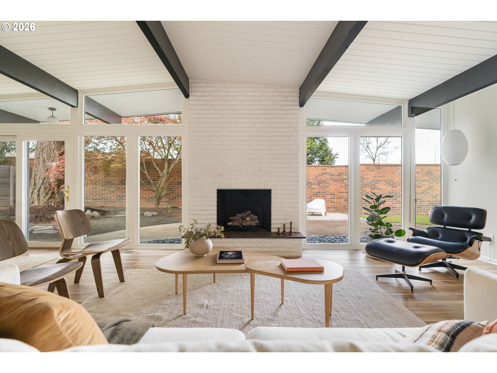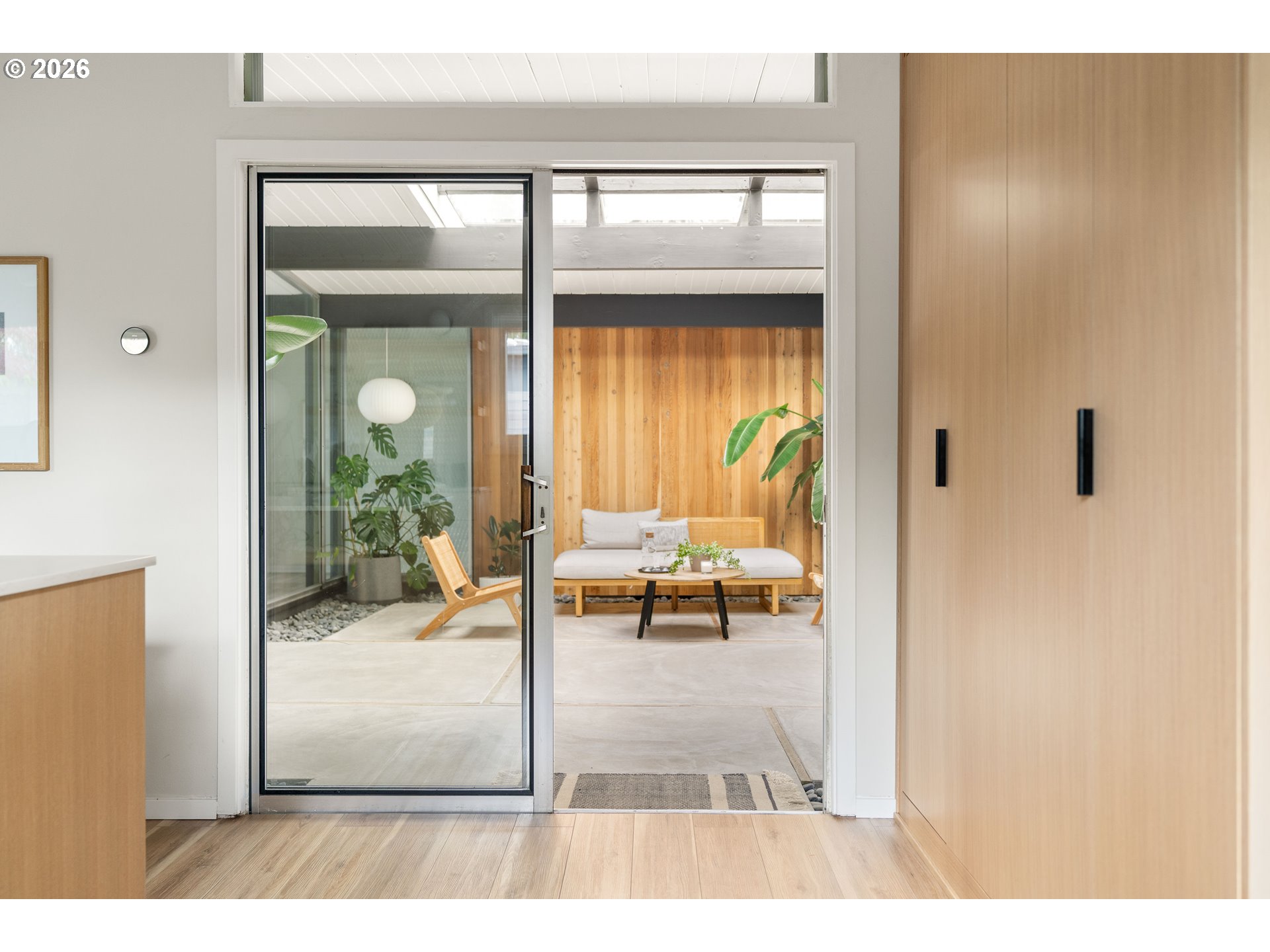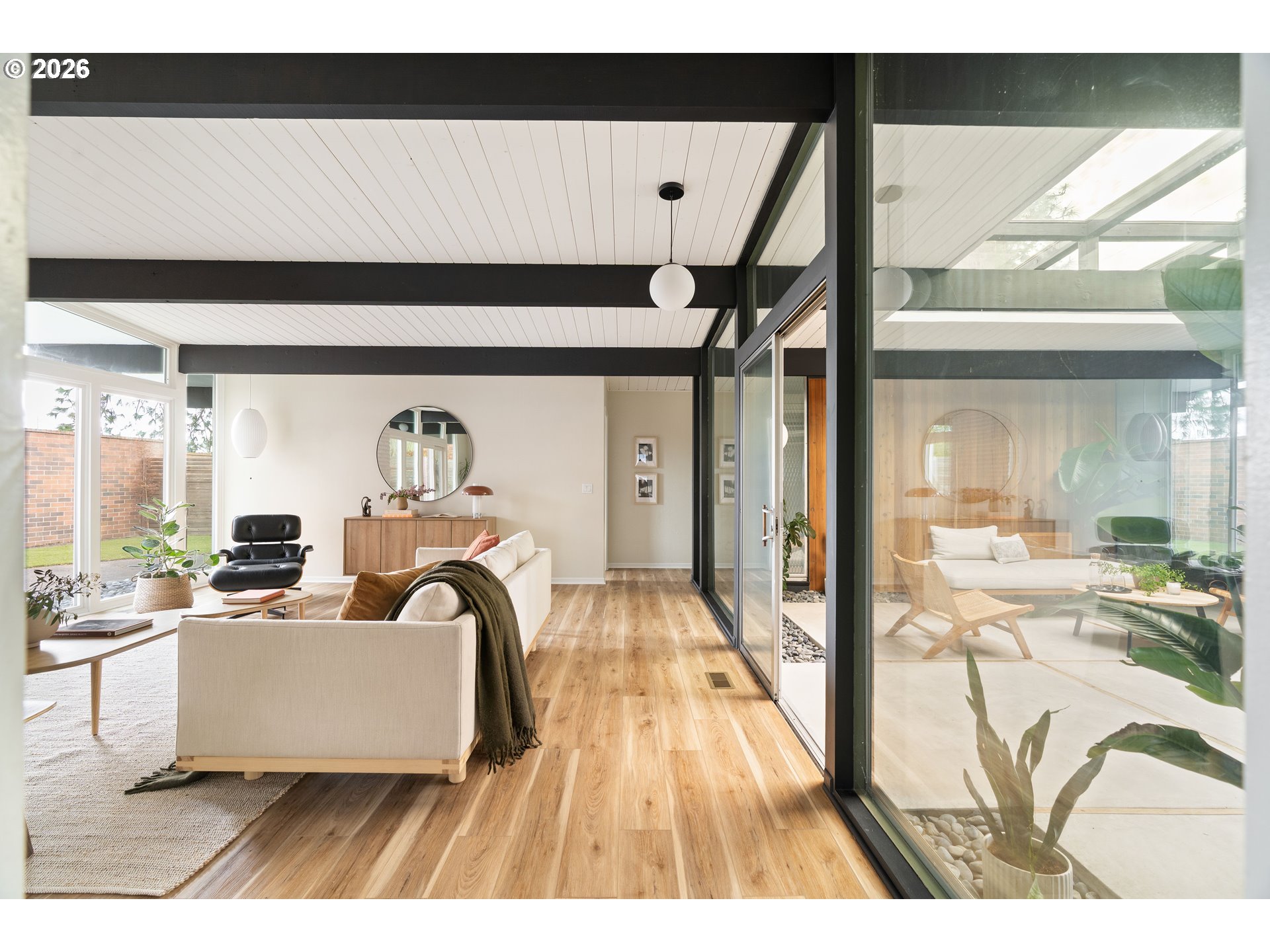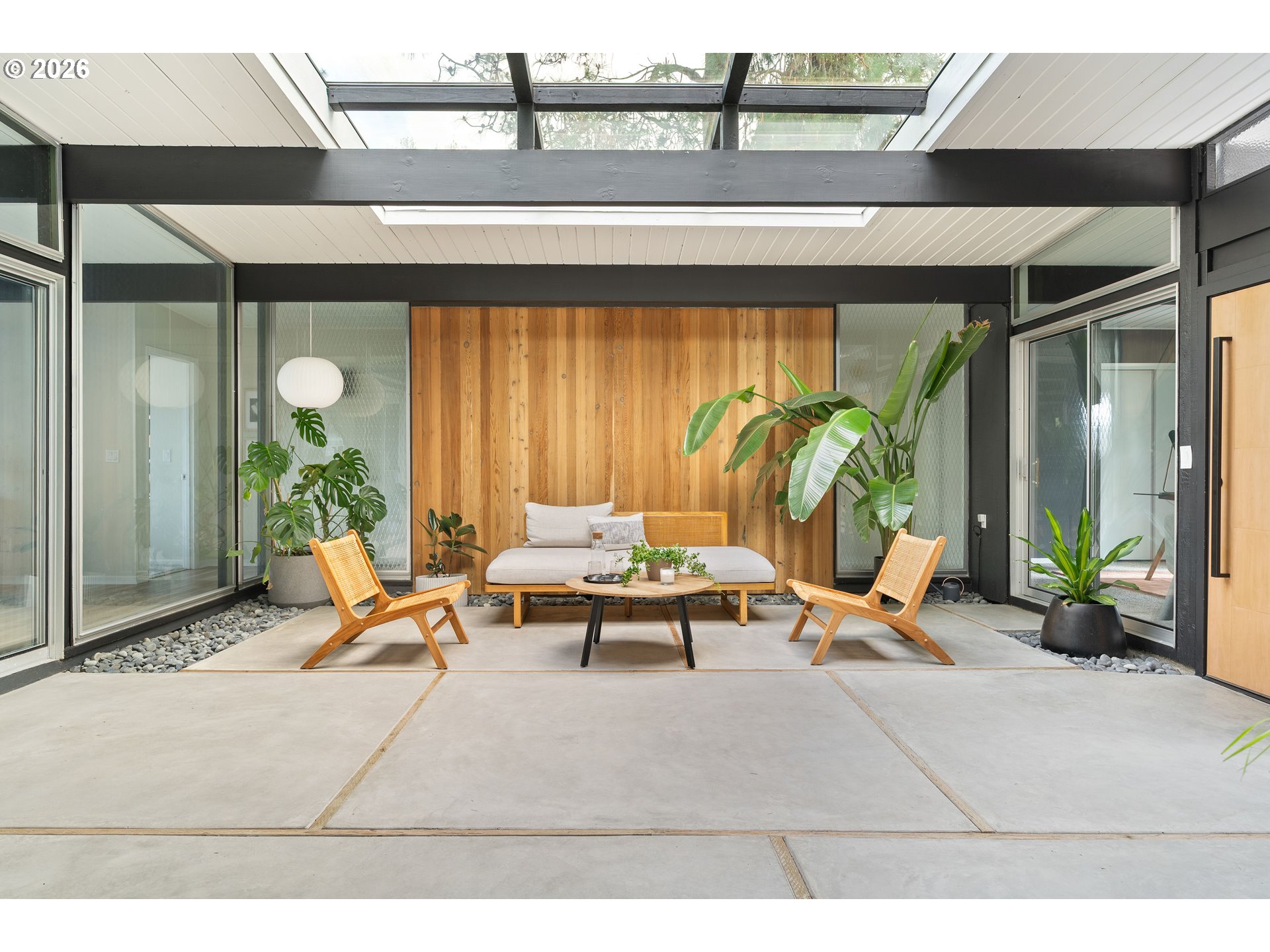 This one is special. This 1963 Rummer home has been thoughtfully reimagined to honor its original vision while elevating it for modern living. At its core, the home is organized around a central atrium, now redefined with new concrete and a triple-pane skylight that draws light deep into the interior. Throughout, the architecture does what Robert Rummer intended: dissolve the boundary between inside and out. Glass walls, exposed beams, and clean lines create a rhythm of light, shadow, and natural texture. The interiors have been carefully renovated with a restrained, design-forward approach. A fully updated kitchen anchors the main living space, opening seamlessly to dining and lounge areas. Bathrooms have been reworked with a modern, minimal palette, while new lighting, including Herman Miller fixtures, adds warmth and intention. Fresh interior paint and updated surfaces unify the home without overpowering its mid-century roots. Outside, the experience continues. The yard has been newly landscaped and features a newly poured driveway, fresh exterior paint, and clean-lined fencing that completes the composition. Behind the scenes, significant upgrades bring peace of mind: a new TPO roof, updated HVAC systems, a new electrical panel, and more, ensuring the home functions as well as it presents. With 4 bedrooms and 2 bathrooms, this is one of the largest Rummer floor plans, a rare opportunity to own a true Rummer that balances architectural integrity with a refined, modern sensibility.