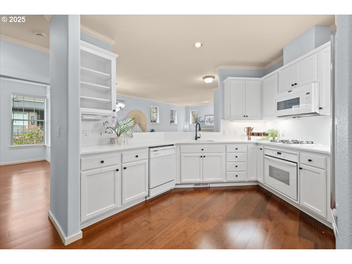 Rare opportunity to get a lovely, updated ground level unit in the beautiful Stonewater complex located in the Orenco district. High ceilings and plenty of windows let in natural light and give a view of the treed common area. Recent updates include cherry engineered hardwoods throughout with new carpet and paint in two bedrooms. The den (optional 3rd bedroom) has glass french doors. The crisp white kitchen was remodeled within the last two years with quartz counter top and under counter lighting. Quality subzero refrigerator plus a 120 bottle subzero wine cooler! Fun for the cook and perfect for entertaining. Large primary bedroom has its own bath with quartz tops, double sinks, walk in closet and walk-in shower. Laundry room with built-ins, plus a rare double car garage. Newer roof, newer pex plumbing, 2012 Trane 95% gas furnace and a/c. This special and hard to find home is move in ready just in time for the holidays! Open Sunday 1:30-3:30