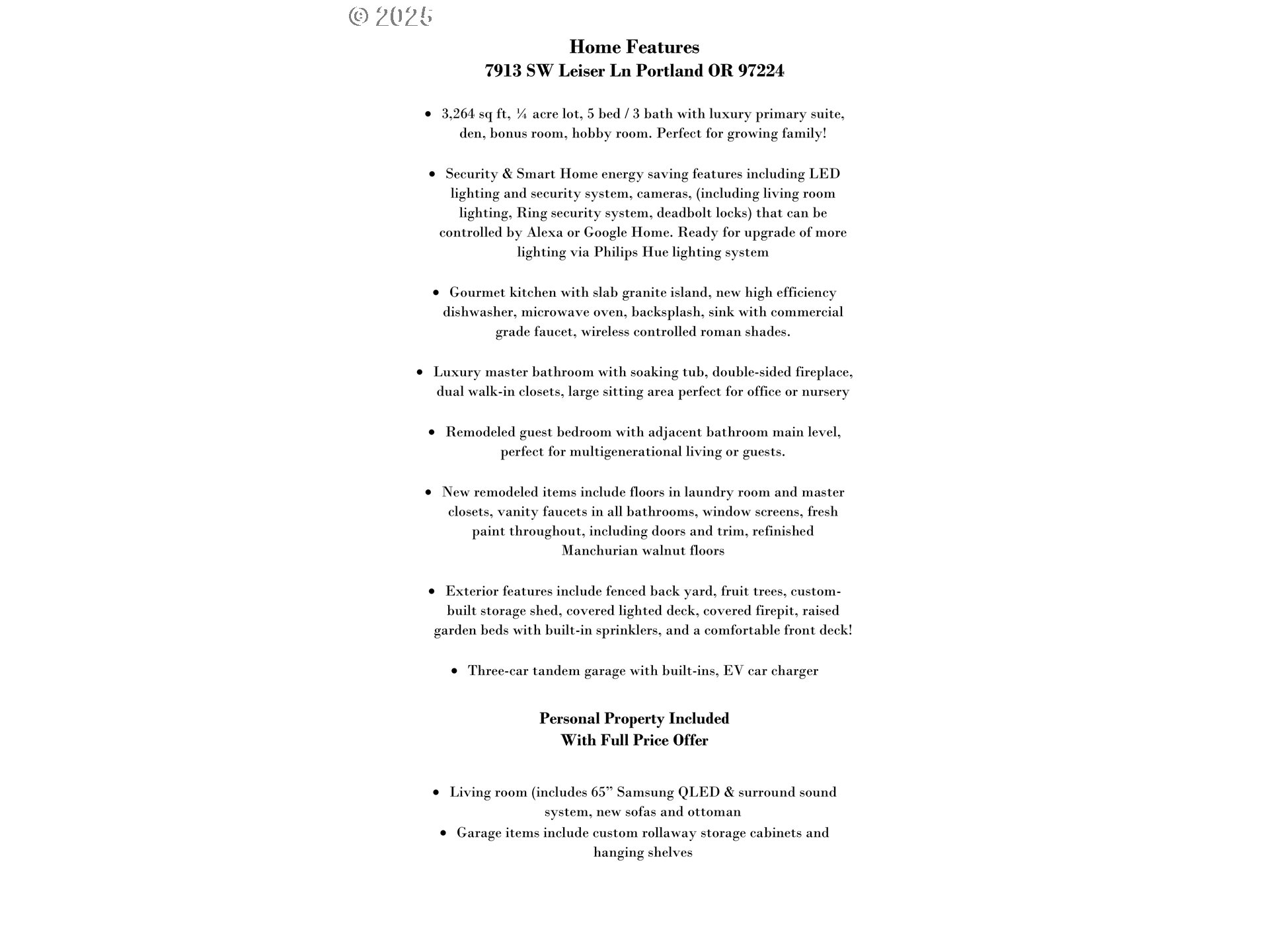 (503) 893-8874This stunningly updated 5-bedroom (bedroom/bath on main level) 3-bathroom home is perfectly situated on a .25-acre corner lot, offering an expansive 3,264 sq ft of exquisite living space for you and your loved ones.Step inside and you will see the many updates this home has received, including the refinished Manchurian walnut floors, and so much more! The open light-filled living room, paired with a generously sized bedroom and a full bath on the main floor creates an inviting atmosphere ideal for multi-generational living or guests. The dining room boasts a custom tin ceiling, adding elegance to your dining experience. A gourmet kitchen boasts tile floors, stainless appliances, gas cooktop. A new dishwasher, microwave, kitchen backsplash, sink faucet, complete with an island and nook. Upstairs you will discover a large bonus room with vaulted ceiling that holds limitless potential, 3 additional bedrooms, a laundry room, and a primary suite retreat that features vaulted ceilings, a two-way fireplace, soaking tub complete with two walk-in closets and an attached bonus area perfect for a private office, child nursery, or serene reading nook, This space redefines comfort and convenience. The landscaped exterior enhances your outdoor lifestyle with a fully fenced backyard, featuring a large storage shed, raised planters, fruit trees, fantastic entertaining spaces, including a large covered lighted deck and a covered fire pit for those cozy evenings. A 3-car tandem garage, complete with an EV charger, built-ins with plenty of storage. Seller installed new HVAC system in July. A smart home, with energy-efficient LED lighting and a comprehensive security system—peace of mind included! All this and moments away from Bridgeport Village with an array of fantastic shopping and dining options. Near Whole Foods, Trader Joes and the many recreation opportunities of Cook Park, with convenient freeway access. Don’t miss the opportunity to make this exceptional house your home!