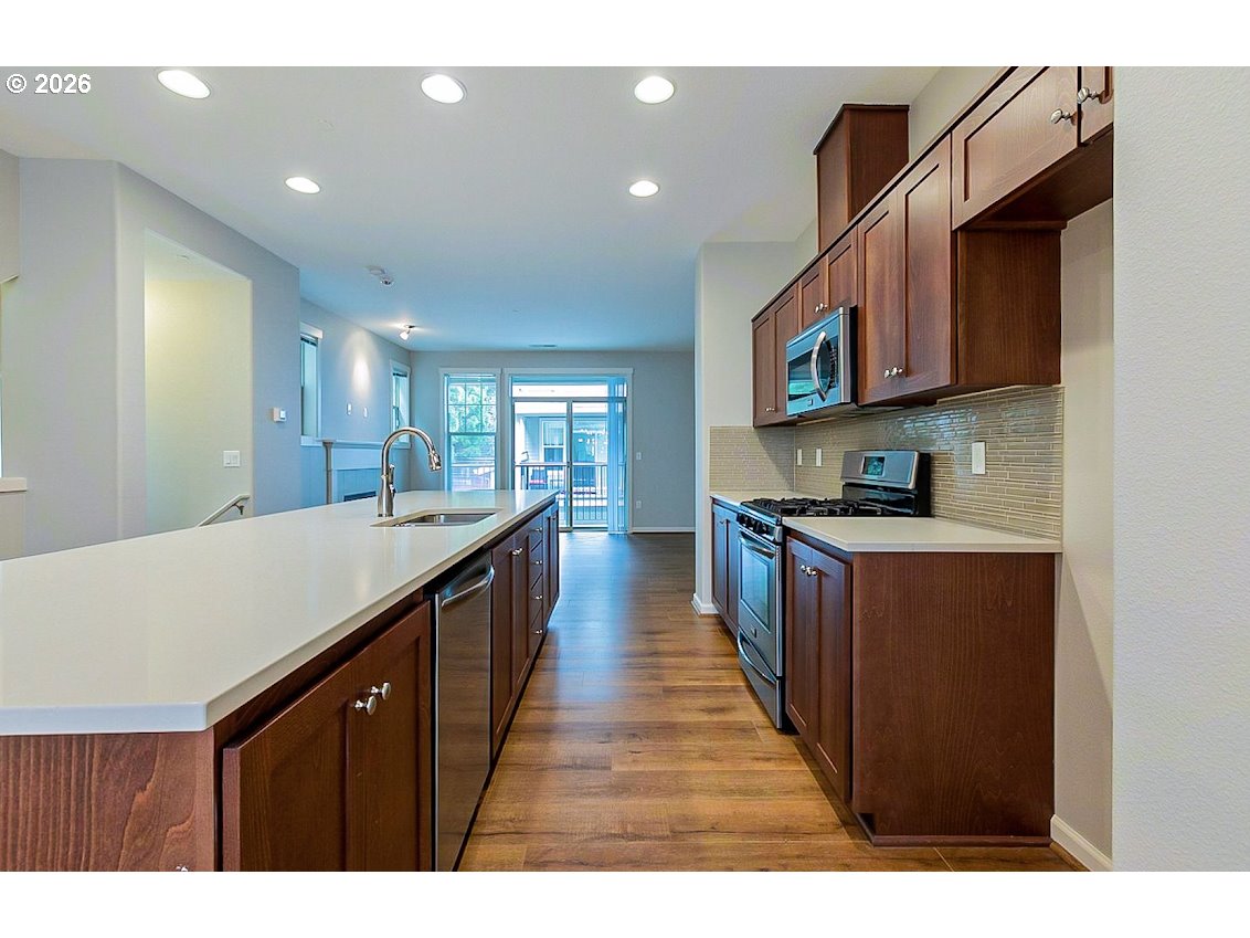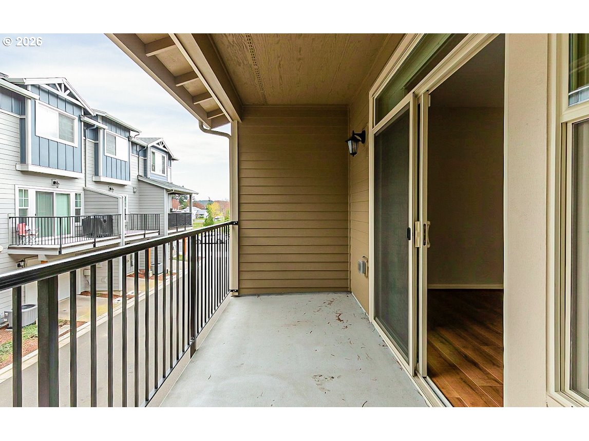 This beautifully maintained end-unit townhome-style condo offers exceptional natural light and a highly desirable floor plan in a prime location. High ceilings and expansive windows create a light filled ambience throughout the open-concept main living level, where the great room design seamlessly connects the living, dining, and kitchen spaces. The inviting living area features a cozy gas fireplace, while the kitchen boasts quartz countertops, stainless steel appliances, a gas range, built-in microwave, dishwasher, and an expansive island with eat bar and abundant storage. An updated dining light fixture and private balcony just off the dining area add thoughtful touches for everyday living and entertaining. A rare main-level bedroom with its own ensuite and walk-in shower offers flexibility for guests, multi-generational living, or a home office. Upstairs, the spacious primary suite features a coved ceiling, ceiling fan, and a well-appointed ensuite with double sinks and a walk-in shower. Enjoy community trails and unbeatable convenience just blocks from grocery stores, restaurants, parks, and everyday amenities. With easy access to Nike, Intel, the MAX light rail and freeway connections this location truly combines comfort and accessibility. [Home Energy Score = 8. HES Report at https://rpt.greenbuildingregistry.com/hes/OR10201179]
