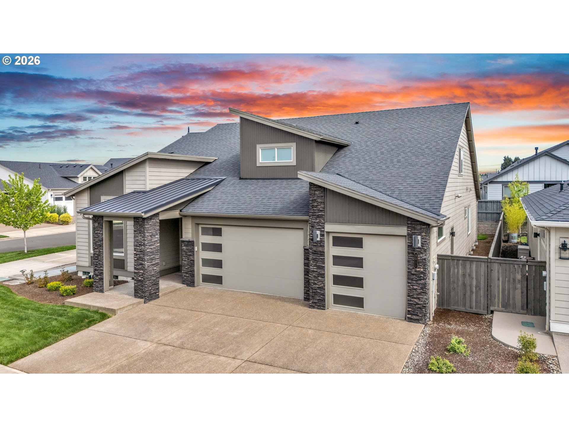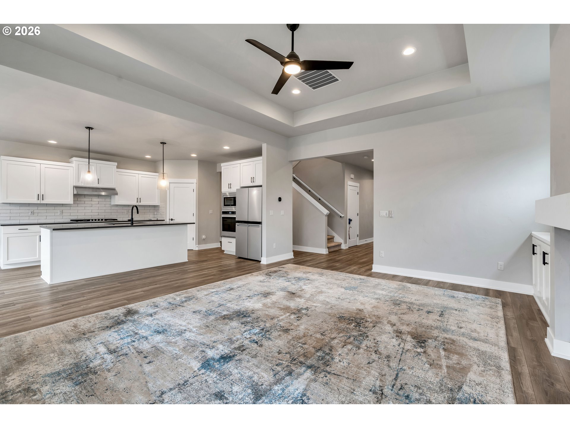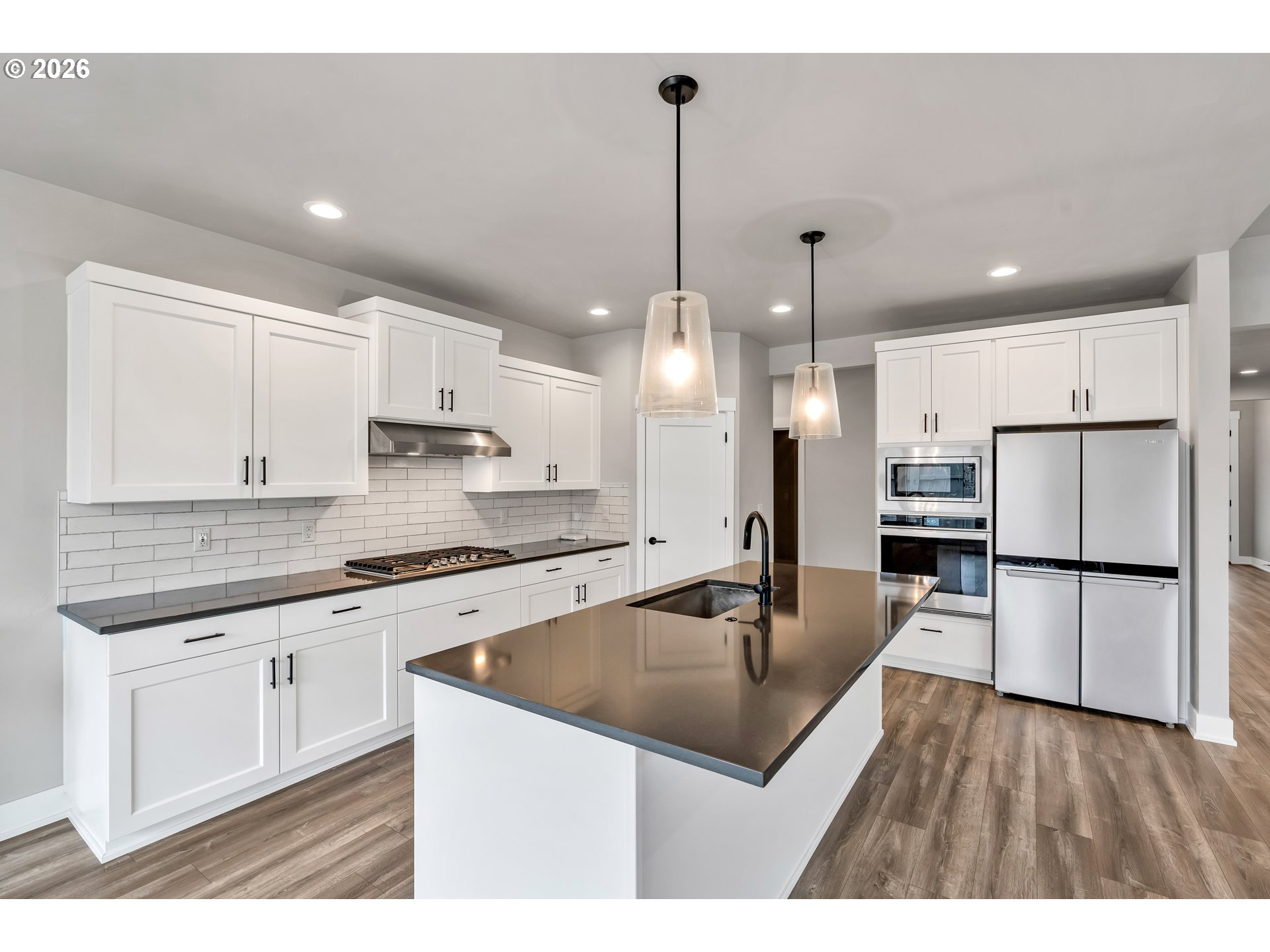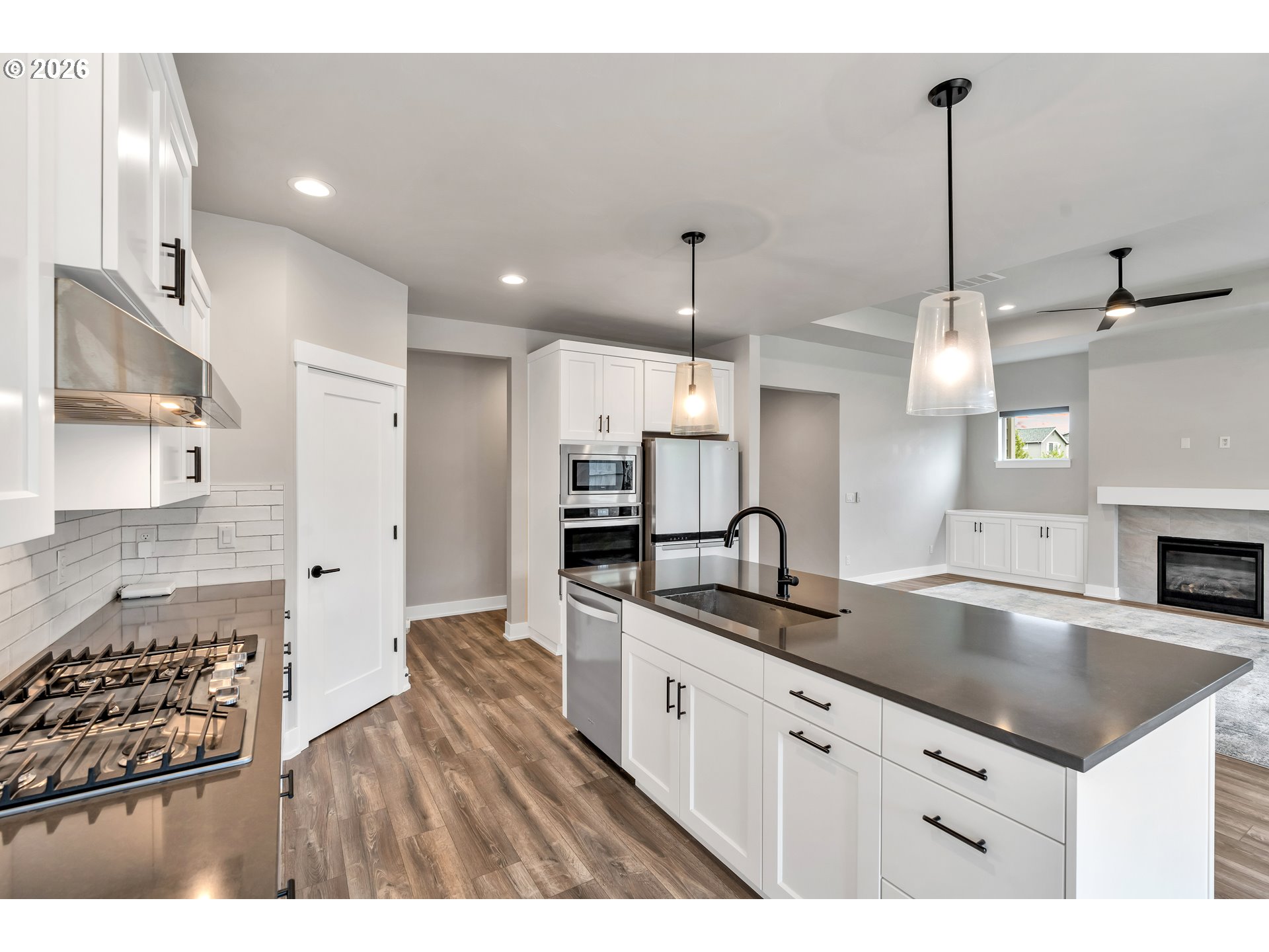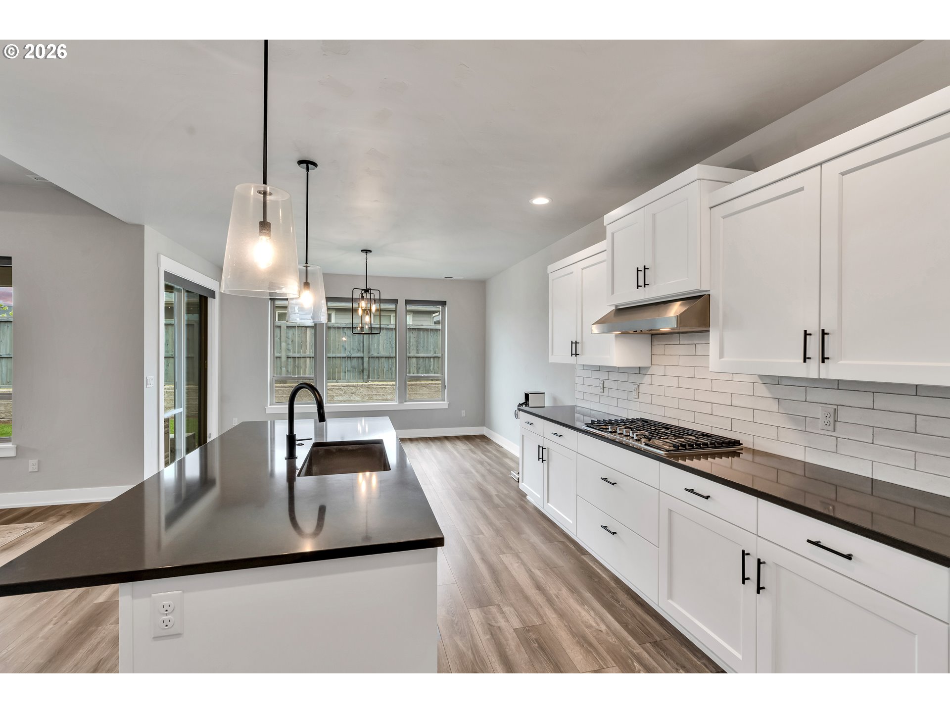Welcome to this stunning two-level home where space, style, and thoughtful design come together beautifully. Offering 5 bedrooms, 3 bathrooms, and an oversized garage, this home provides the perfect blend of functionality and modern comfort for those who need room to live, work, and grow.The main living spaces are bright, open, and beautifully designed, featuring laminate flooring throughout the living room, dining area, and kitchen. Oversized windows, soaring ceilings, and abundant natural light create an airy, expansive feel from the moment you enter. The living room is both elegant and inviting with a cozy fireplace and ceiling fan, while the dining area features sliding glass doors that open directly to the backyard for effortless indoor-outdoor living.The kitchen is truly a centerpiece—gorgeous, spacious, and designed to impress with a large island, sink in island, eat bar seating, built-in range, built-in oven, microwave, pantry, and abundant workspace for cooking and entertaining.Conveniently located on the main floor, the laundry room adds everyday practicality.The lower level includes three spacious bedrooms, all with wall-to-wall carpet and vaulted ceilings for added comfort and style. The second bedroom features its own ensuite bathroom, while the luxurious primary suite offers a walk-in closet and private ensuite bath complete with double sinks, a walk-in shower, and a soaking tub.Upstairs, you’ll find two additional bedrooms with wall-to-wall carpet, providing even more flexibility for guests, office space, or hobbies.Step outside to enjoy a fully fenced backyard with a covered patio—perfect for year-round entertaining, outdoor dining, or simply relaxing in your private outdoor retreat.With its spacious layout, upscale finishes, and exceptional design, this beautiful home offers comfort, versatility, and room for everyone.
