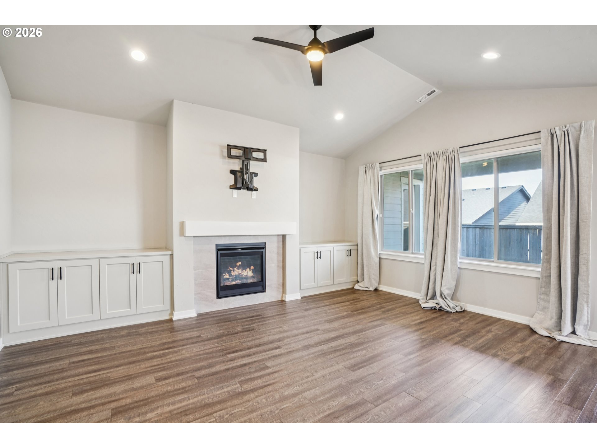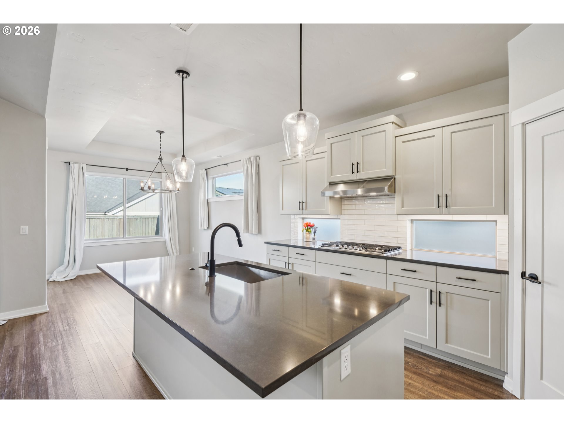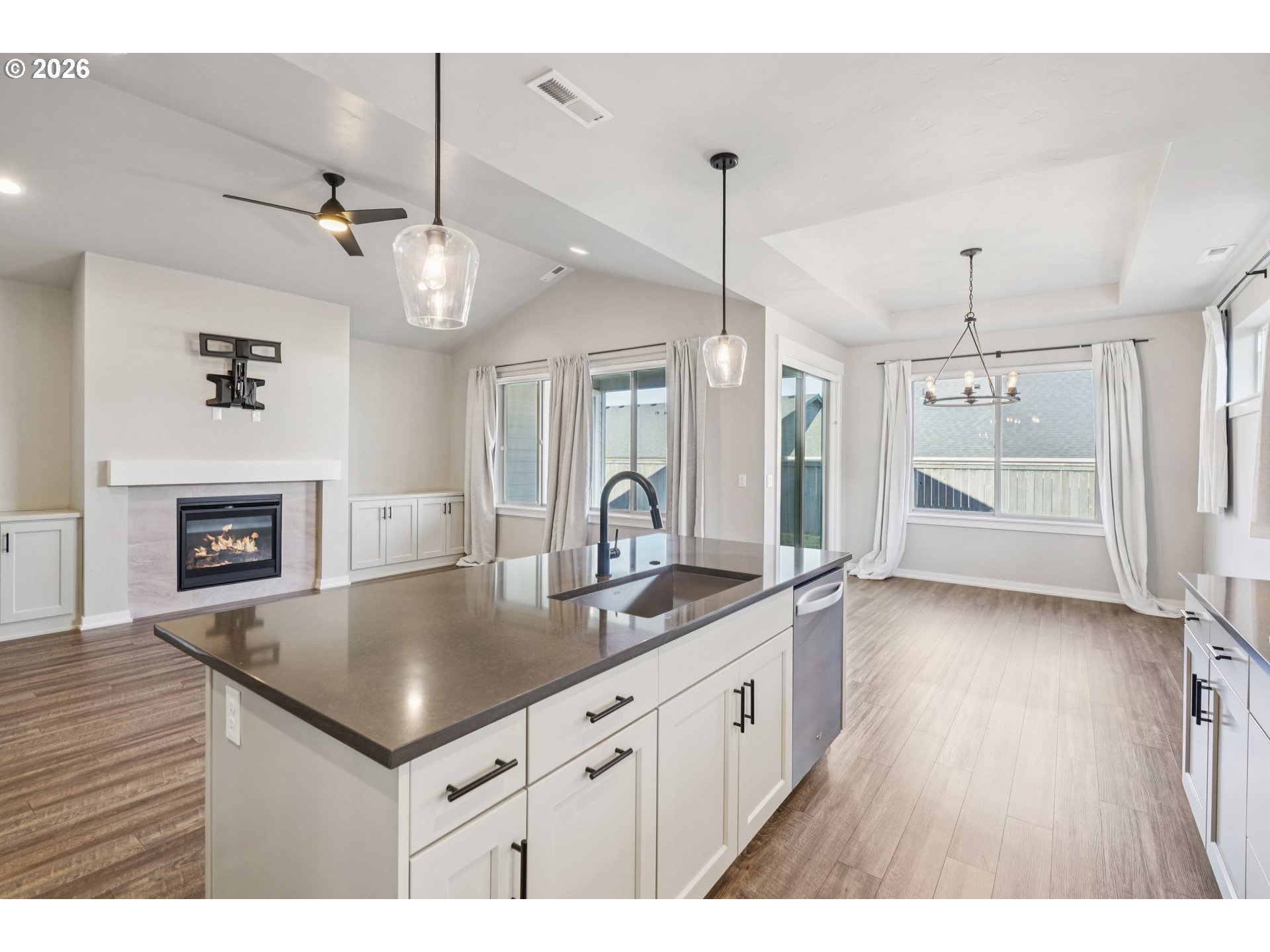 Welcome to this beautifully upgraded one-level home in Hillsboro’s desirable South Hillsboro community of Butternut Creek, perfectly tucked inside the neighborhood for a quiet, private feel. This thoughtfully designed 3-bedroom with den layout features vaulted ceilings, high-end quartz finishes, luxury vinyl plank flooring, and a bright open living space with a cozy gas fireplace. The kitchen shines with stainless steel appliances, island seating, pantry storage, and sleek built-in features perfect for everyday living and entertaining. The spacious primary suite offers vaulted ceilings, a spa-inspired bath with double sinks and soaking tub, and a peaceful retreat feel. A versatile den/office adds flexible space for work or guests. Step outside to a fenced yard with covered patio and sprinklers—ideal for relaxing or hosting gatherings. Central air, fiber optic availability, attached garage, and HOA-maintained front landscaping add everyday convenience. Easy access to shopping, schools, parks, and amenities, Nestled in the community away from major roads, with quick move-in available. Upgrades compared to the new construction of this same plan are estimated at approximately 15k and include built in cabinets next to the fireplace, Pendant lights above the island, Drop in Cook top with wall oven and backyard landscaping! All appliances at the home ae included in the sales price. [Home Energy Score = 9. HES Report at https://rpt.greenbuildingregistry.com/hes/OR10210481]