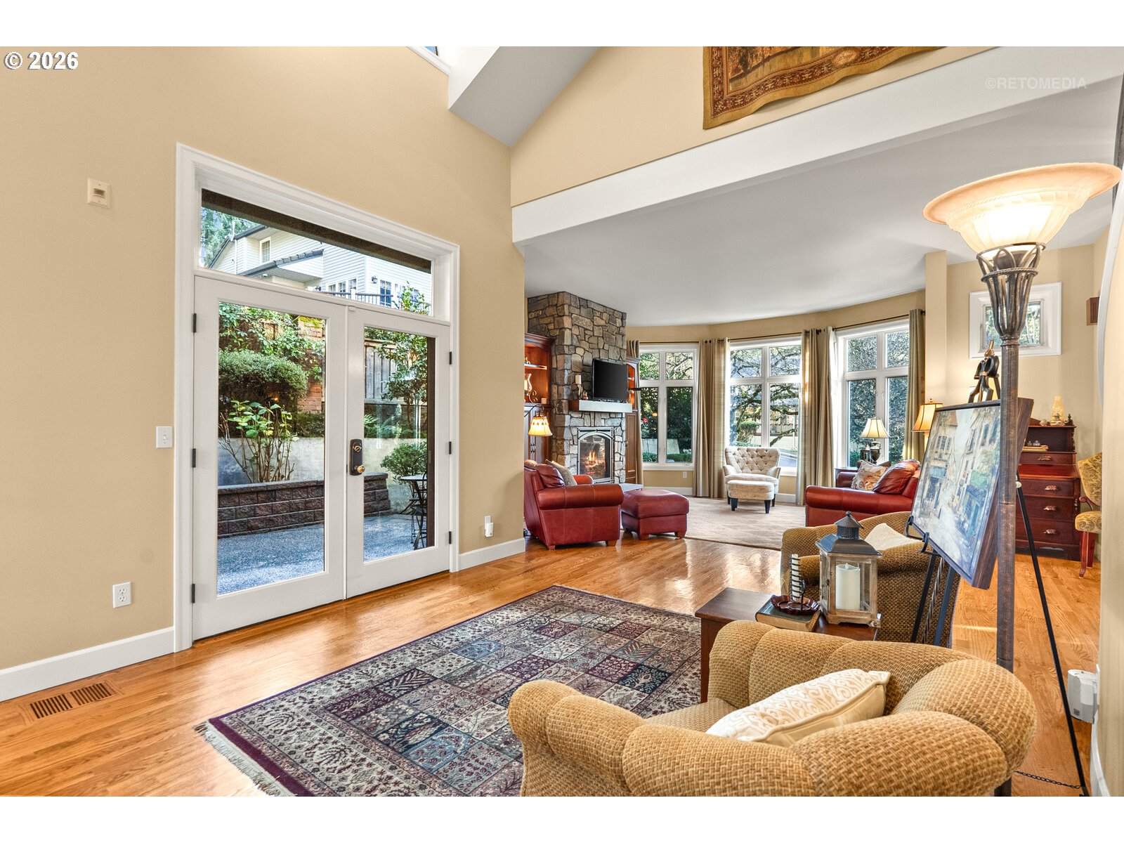(503) 893-8874This professionally remodeled beauty in Beaverton is an architecturally distinctive residence offering over 3,000 square feet of thoughtfully designed living space, elevated above the street with mature timbers, paver hardscaping, tiered landscape beds, and generous driveway parking. A covered front porch opens to a light-filled interior showcasing vaulted ceilings, curved walls, domed architectural elements, and a striking curved staircase with hardwood treads and open banister. Hardwood floors, neutral designer finishes, and expansive windows define the main level, creating seamless indoor-outdoor flow to multiple private paver patios. Living and dining areas are anchored by an impressive stone fireplace and tranquil treed views.The kitchen features custom stained cabinetry, slab stone countertops, tile backsplash, stainless steel appliances, illuminated display cabinetry, a large walk-in pantry, and an adjacent mudroom or butler’s pantry with slab counters, utility sink, extensive storage, and exterior access.The entire upper level is dedicated to a private primary retreat with open loft and library built-ins, abundant natural light, extensive storage, and attic access. The primary suite offers a curved wall of windows, walk-in closet with built-ins, and a well-appointed bath with soaking tub, glass-enclosed shower, double vanity, and slab counters.Two additional bedrooms are located on the main level with a shared Jack and Jill bath and balcony access. A lower-level flex space suits office, gym, or media use and connects directly to an oversized three-car garage with built-in storage, kitchenette workspace, and full shower bath.Three bedrooms, three and one half baths, oversized three-car garage, and exceptional storage throughout... with timeless finishes and distinctive architecture create a home that is both functional and enduring. List of updates and improvements available upon request.
